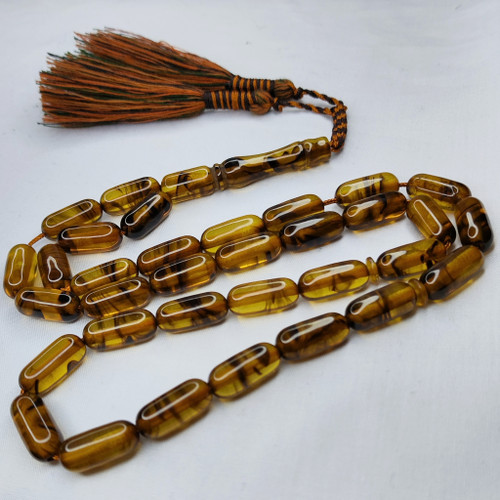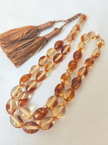 تسبیح کهربا رگه دار 33عددی رنگ یاغبال کره عسلی به همراه بافت شکیل