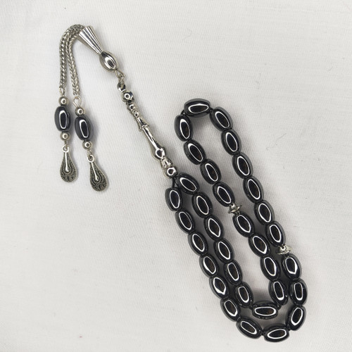 تسبیح حدید 33عددی تراش گرد نقره ای رنگ ثابت همراه سر تسبیح استیل شکیل