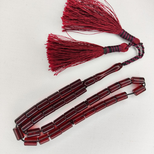 تسبیح سندلوس 33عددی تراش کسمه (قیچی بر) دقیق رنگ قرمز تیره زیبا همراه سرتسبیح استیل