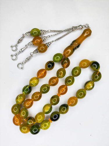 تسبیح کهربا 33عددی تراش کپسولی رنگ سبز و زرشکی خوشدست و زیبا همراه با سر تسبیح استیل شکیل