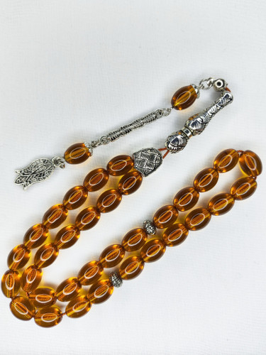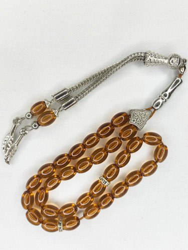 تسبیح شیشهای 33عددی قیمت مناسب رنگ عسلی خوشدست و زیبا همراه با سر تسبیح استیل فاخر