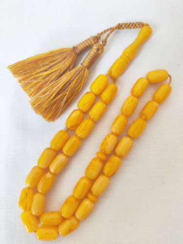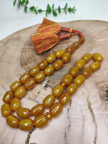 تسبیح کهربا رگه دار 33عددی رنگ زرد کاراملی خوشدست و فاخر همراه بافت شکیل