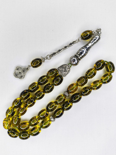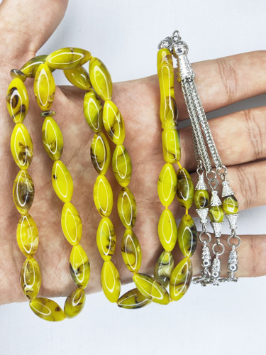 تسبیح کهربا رگه دار رنگ لیمویی با رگه های قهوهای 33عددی تراش هلی خوشدست