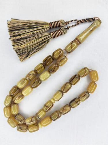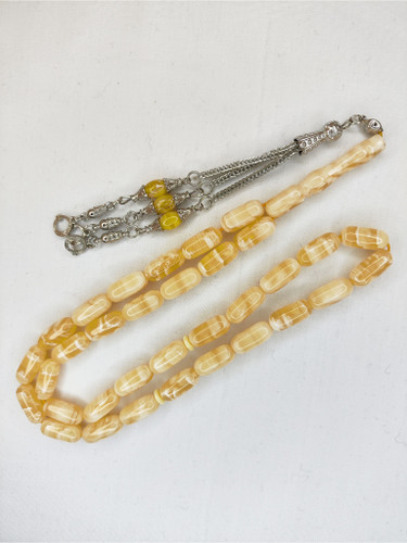 تسبیح کهربا رگه دار 33 عددی رنگ زرد مایل به سفید قواره تاجری خوشدست و فاخر