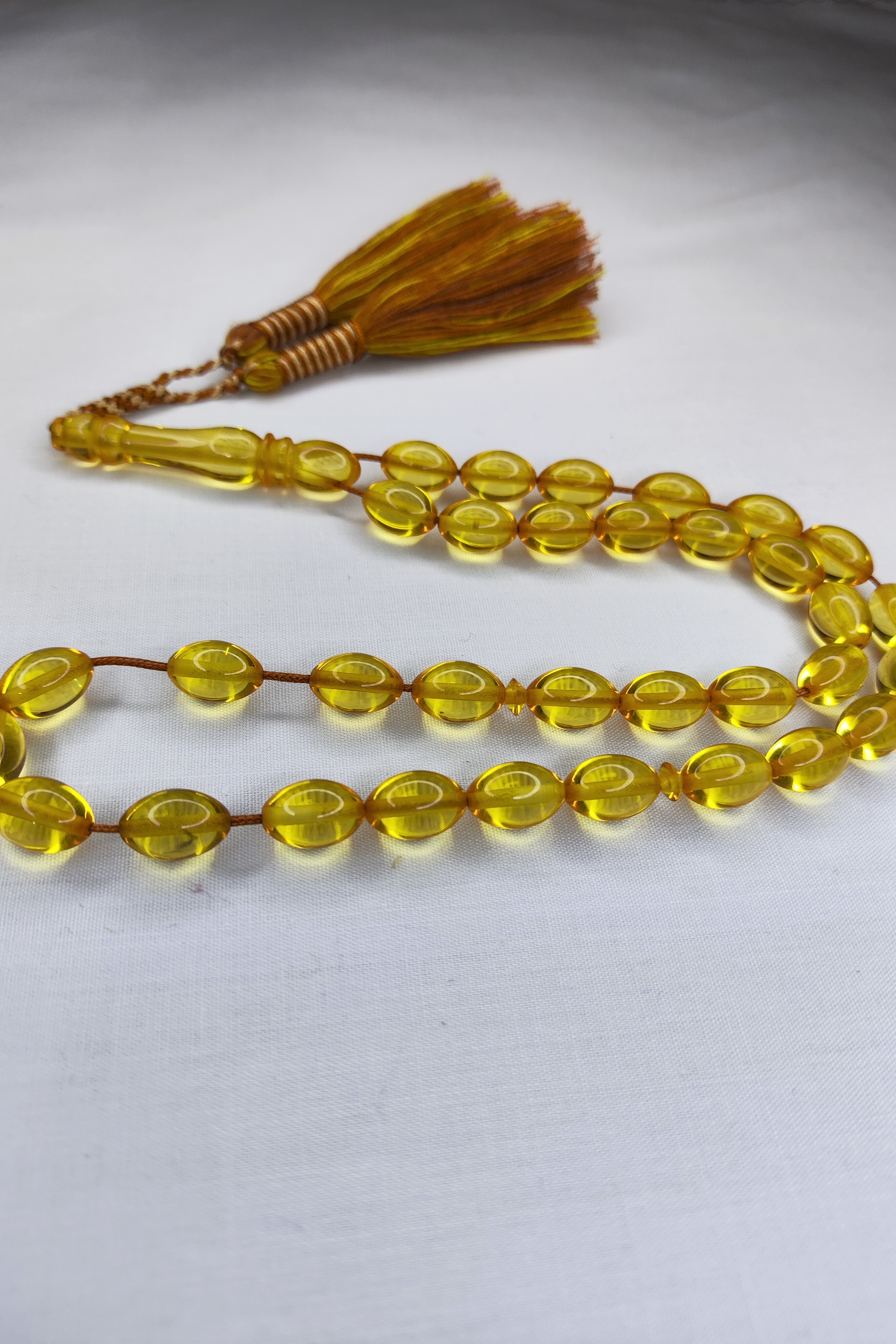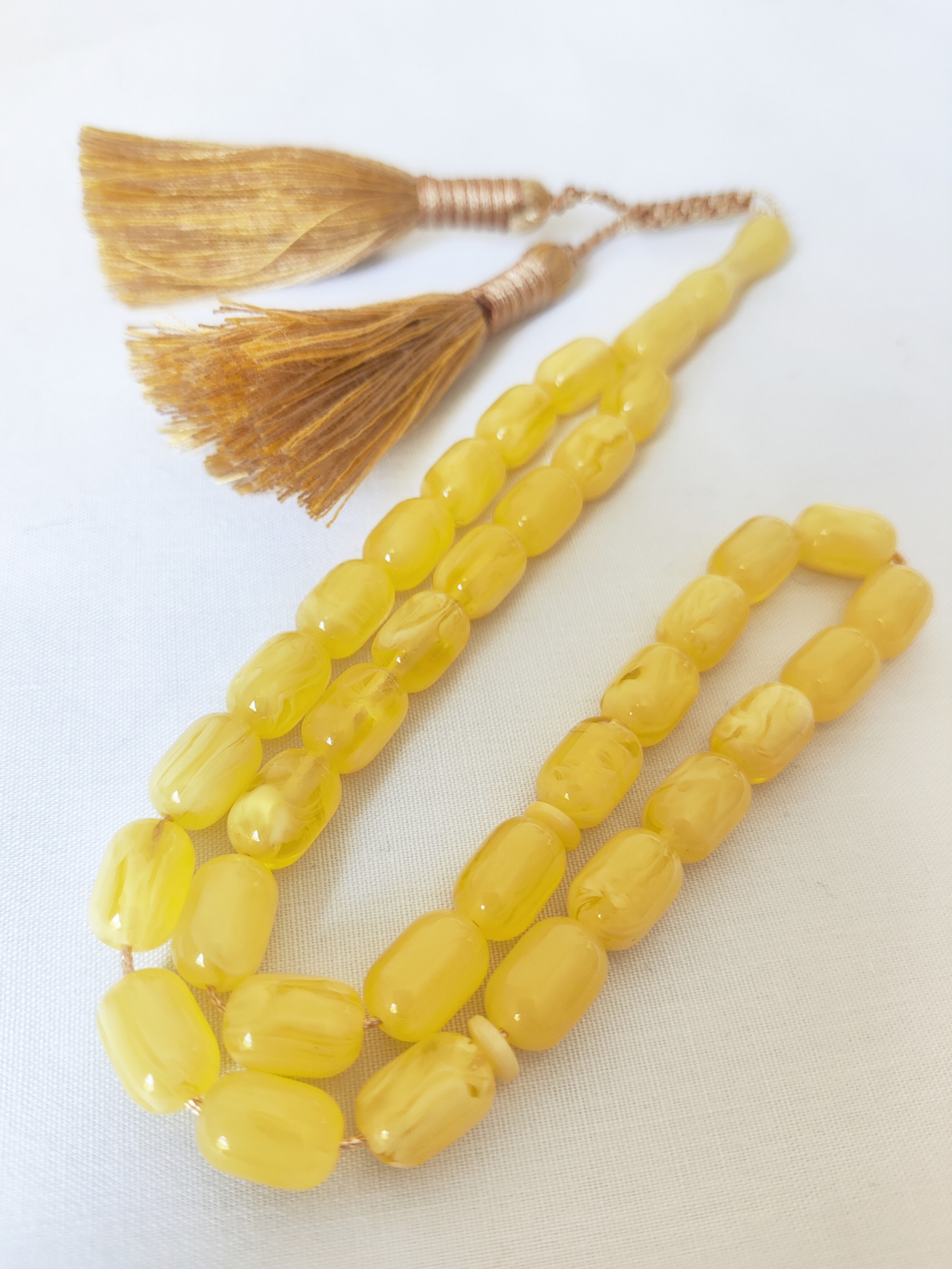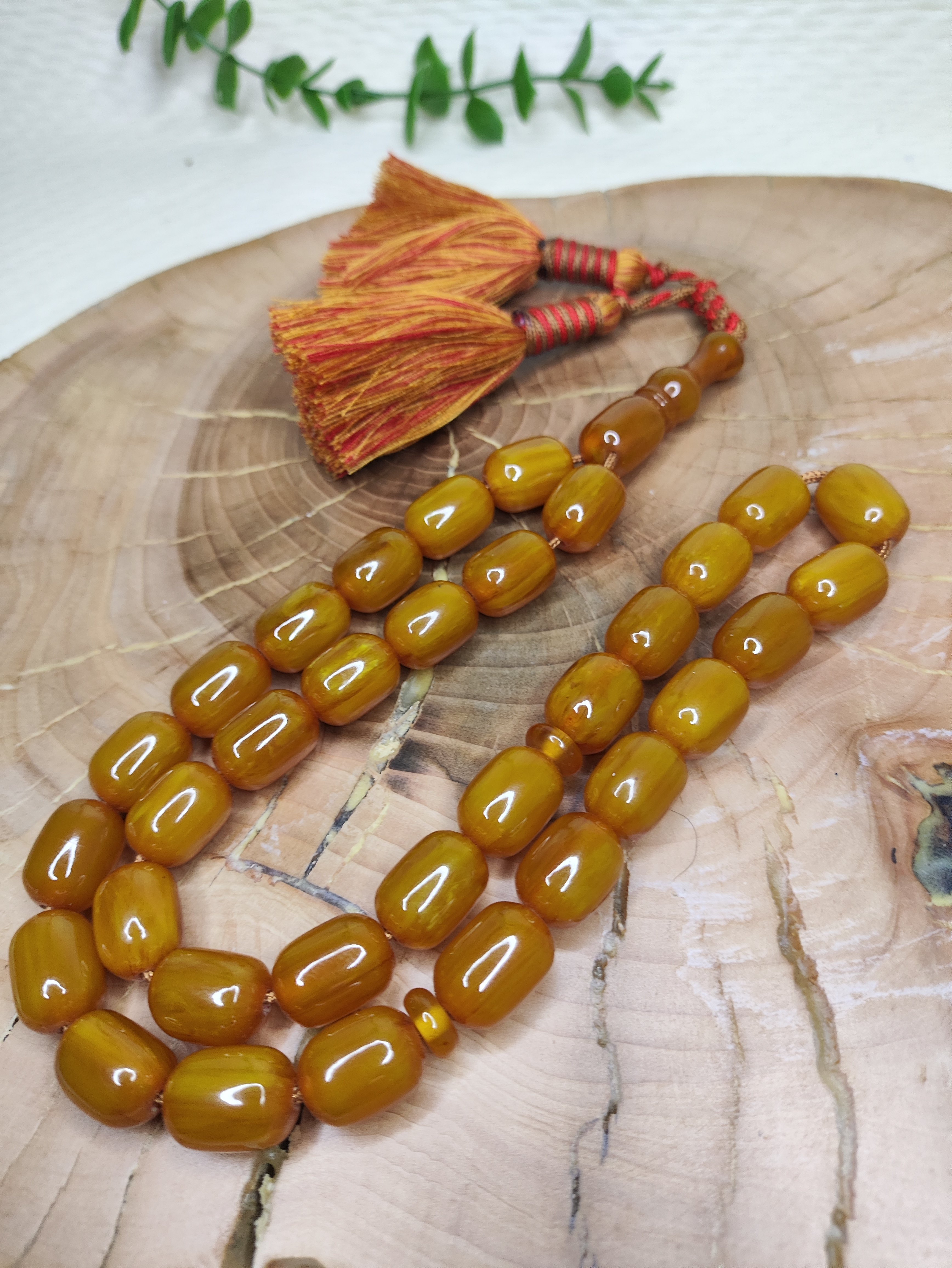 تسبیح کهربا رگه دار 33عددی رنگ زرد کاراملی خوشدست و فاخر همراه بافت شکیل