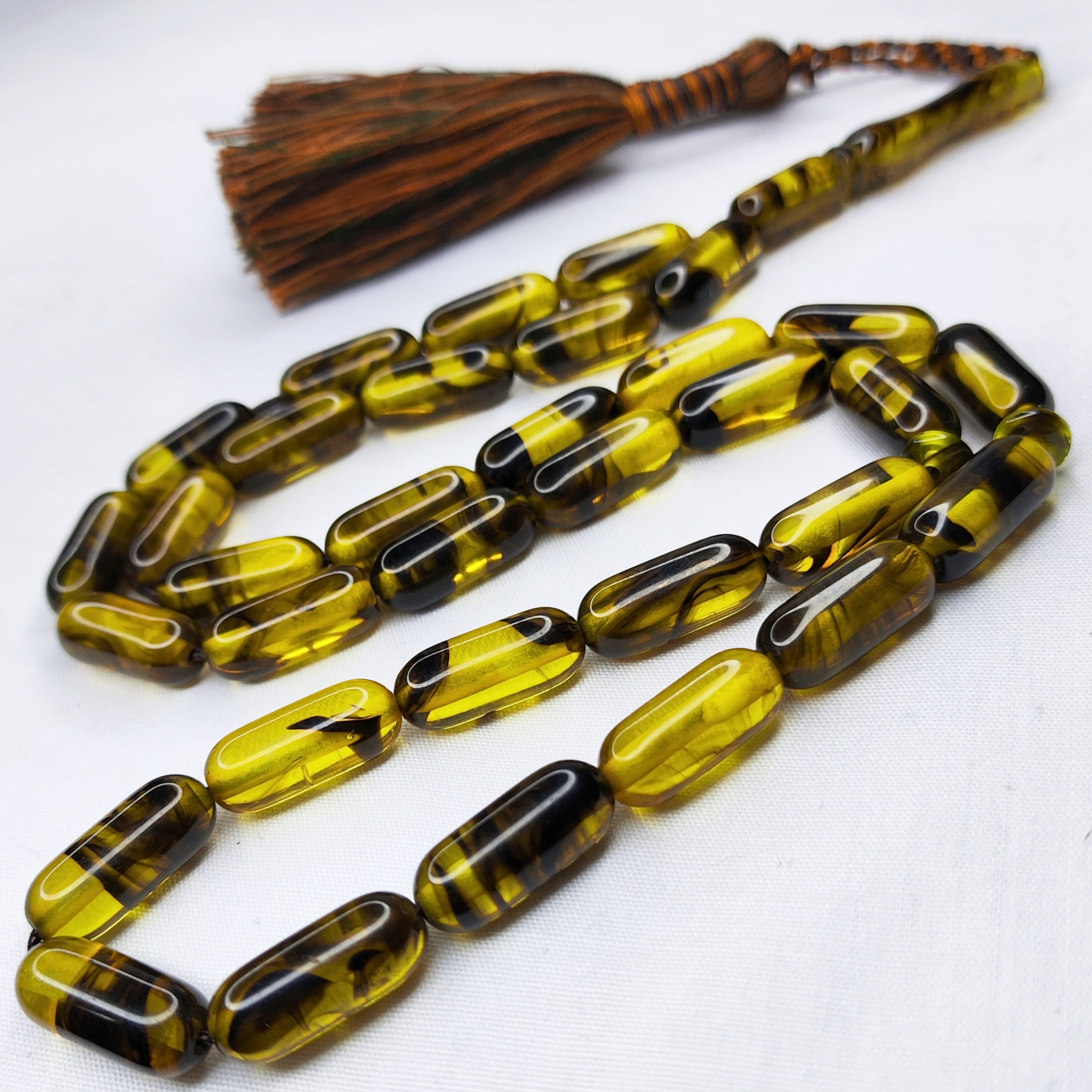 تسبیح کهربا رگه دار رنگ لیمویی با رگه های قهوهای 33عددی تراش هلی خوشدست