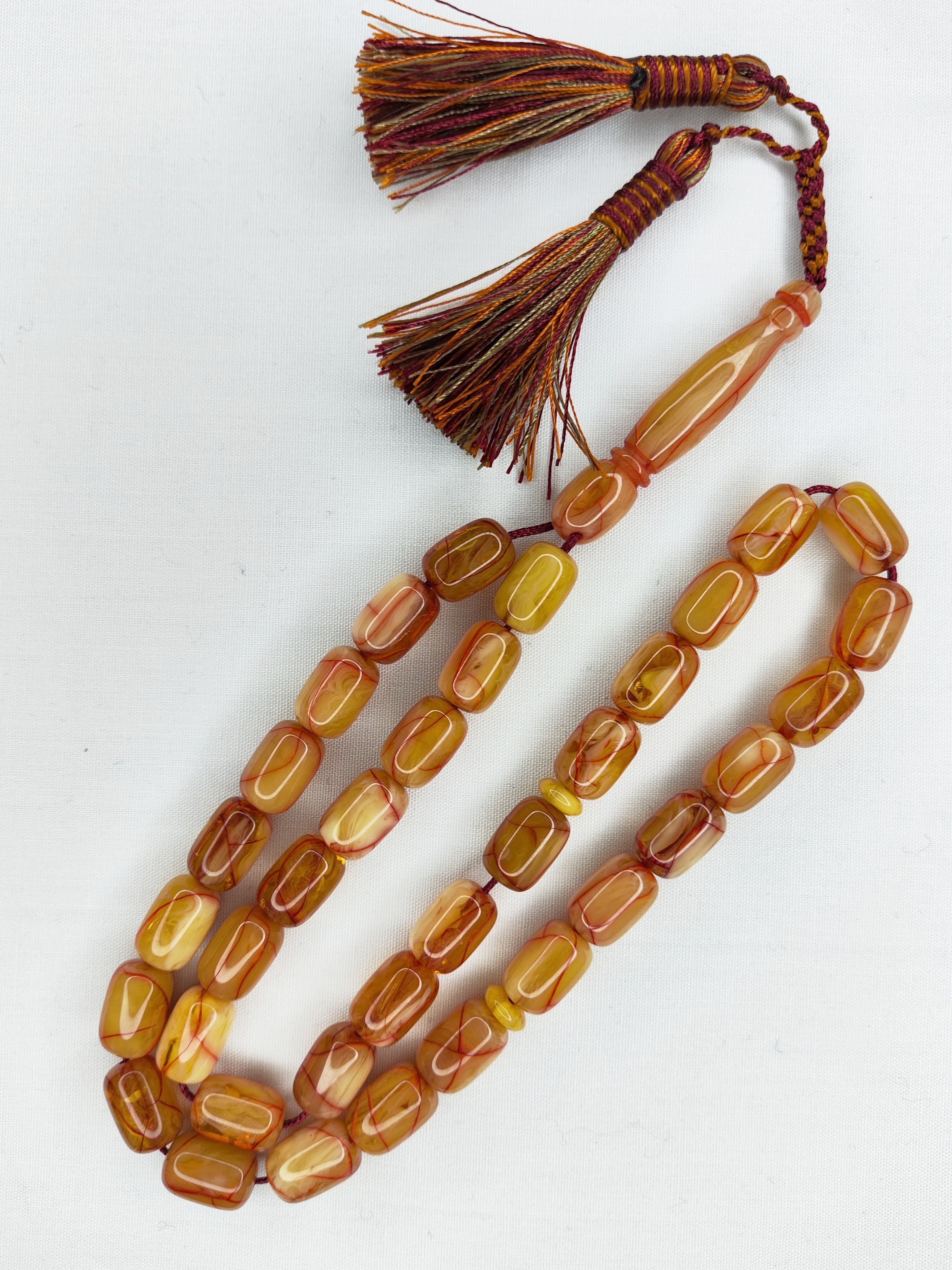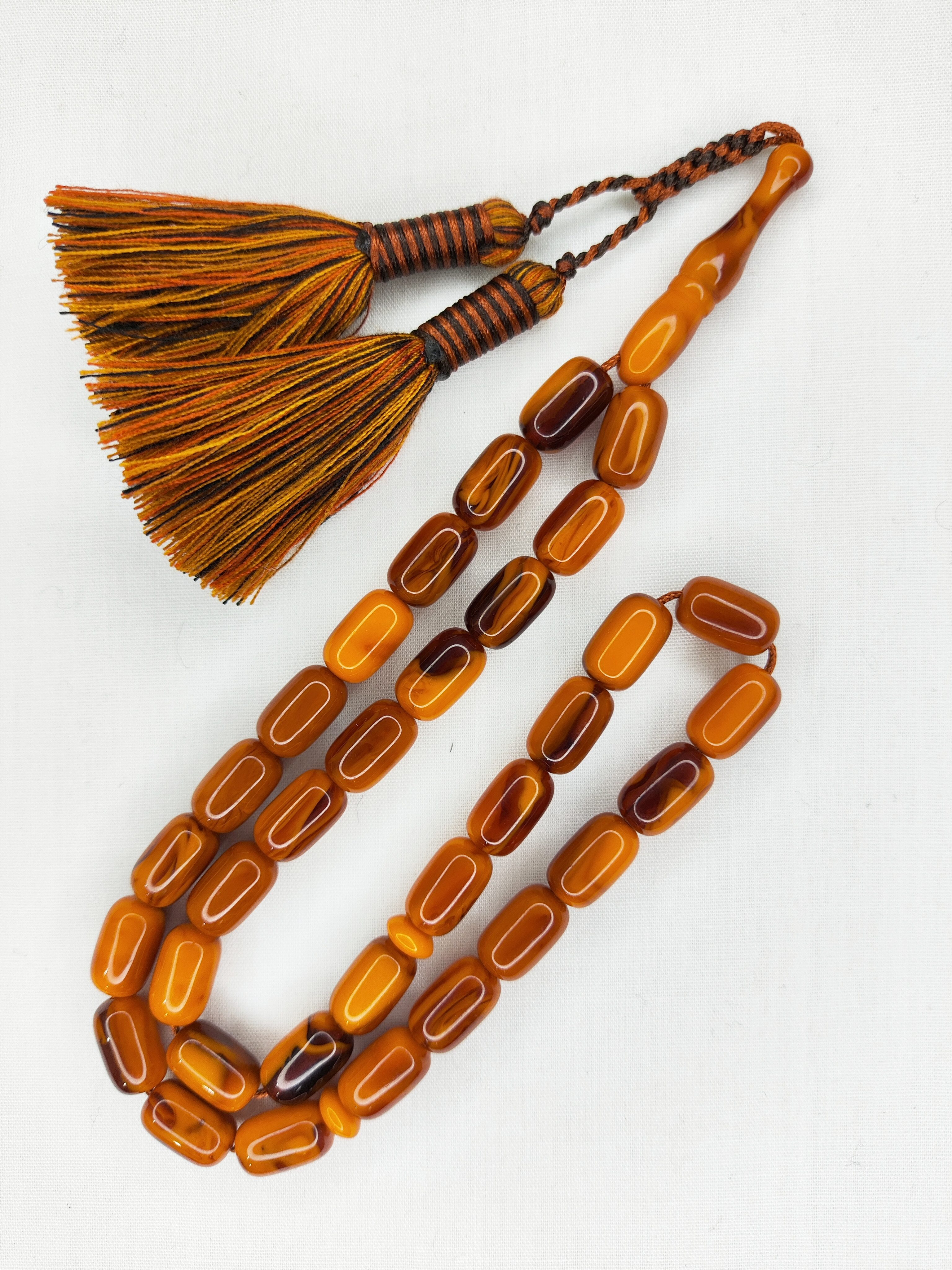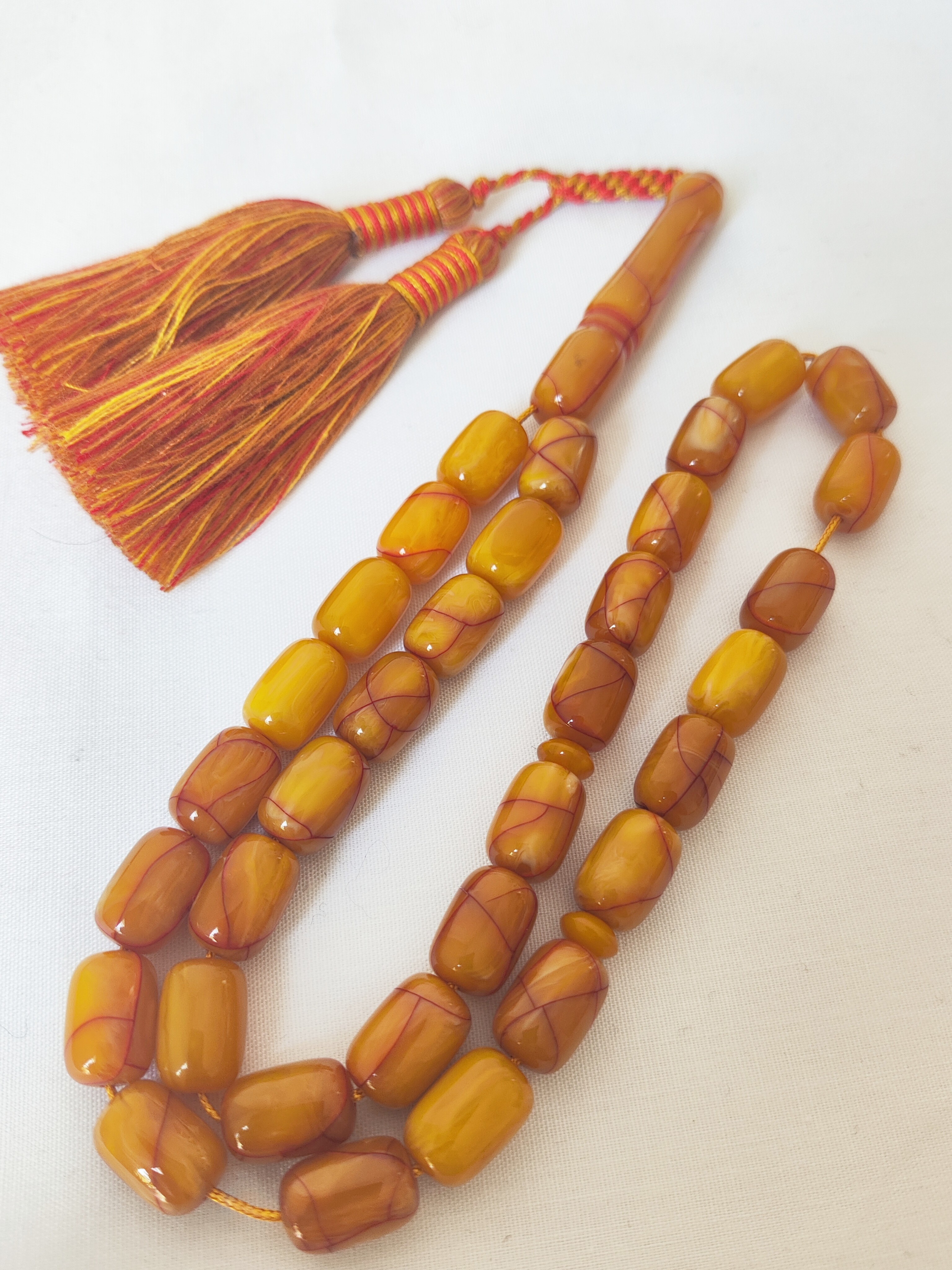 تسبیح کهربا رگه دار 33عددی رنگ یاغبال کره عسلی به همراه بافت شکیل