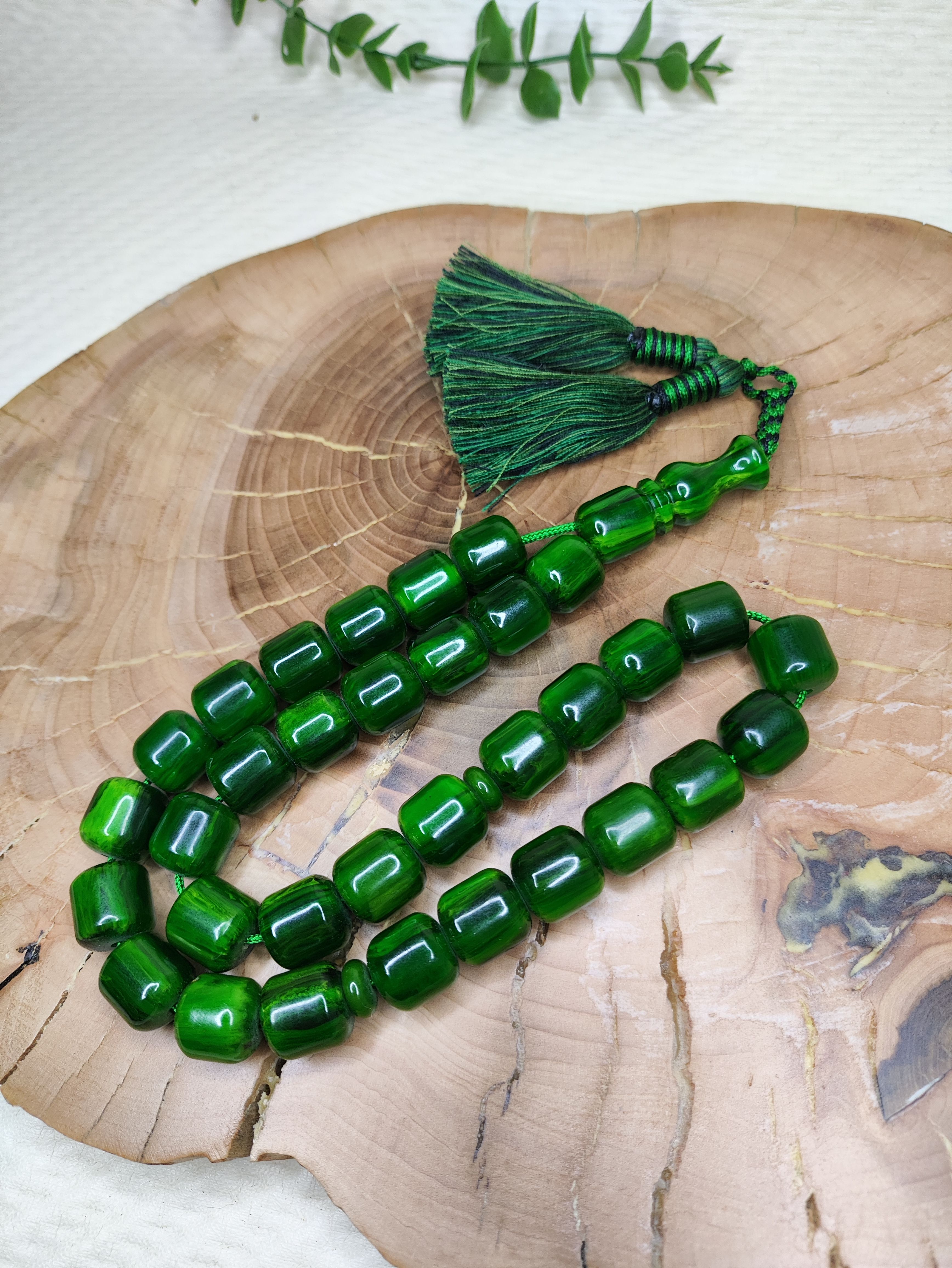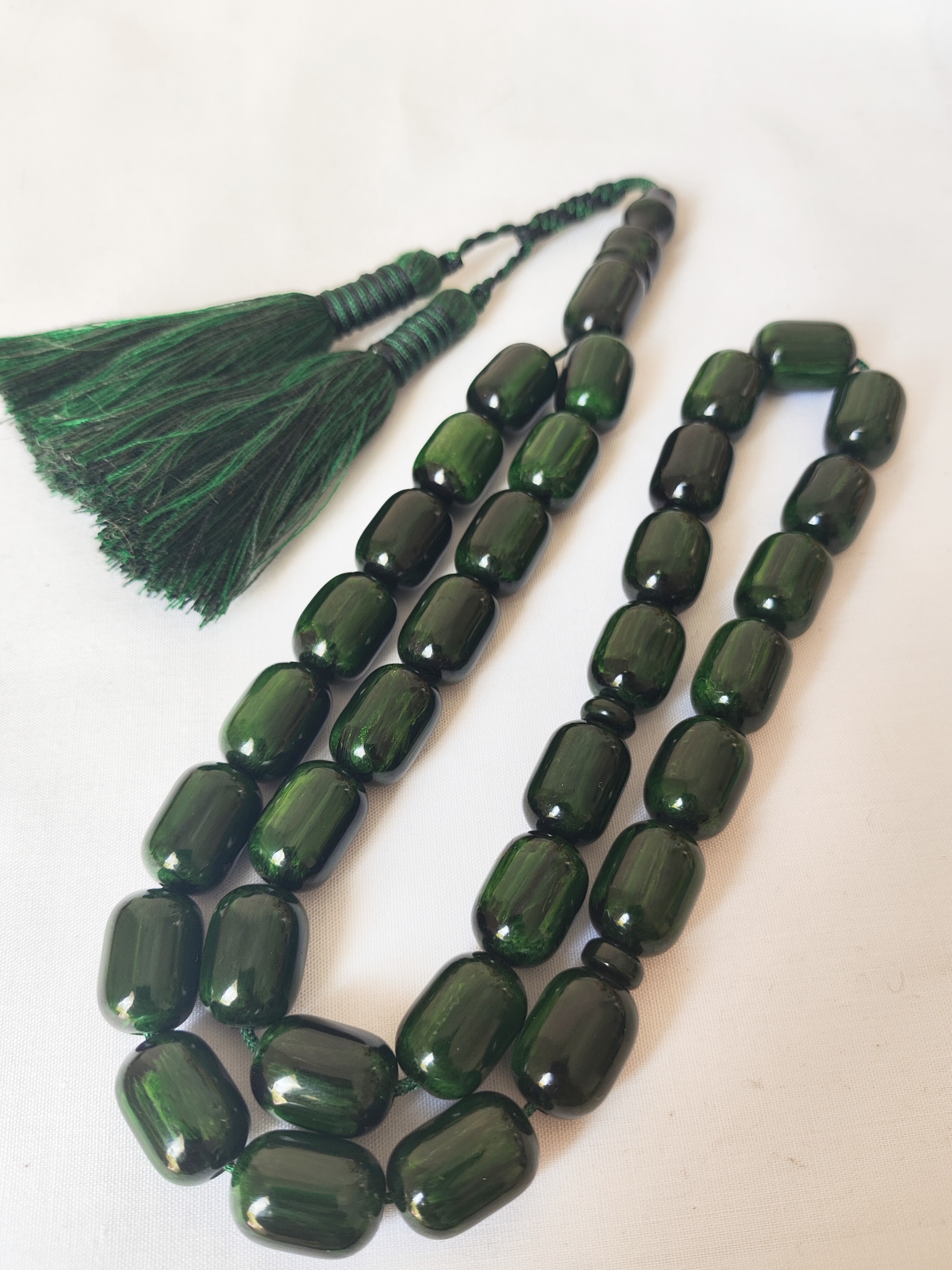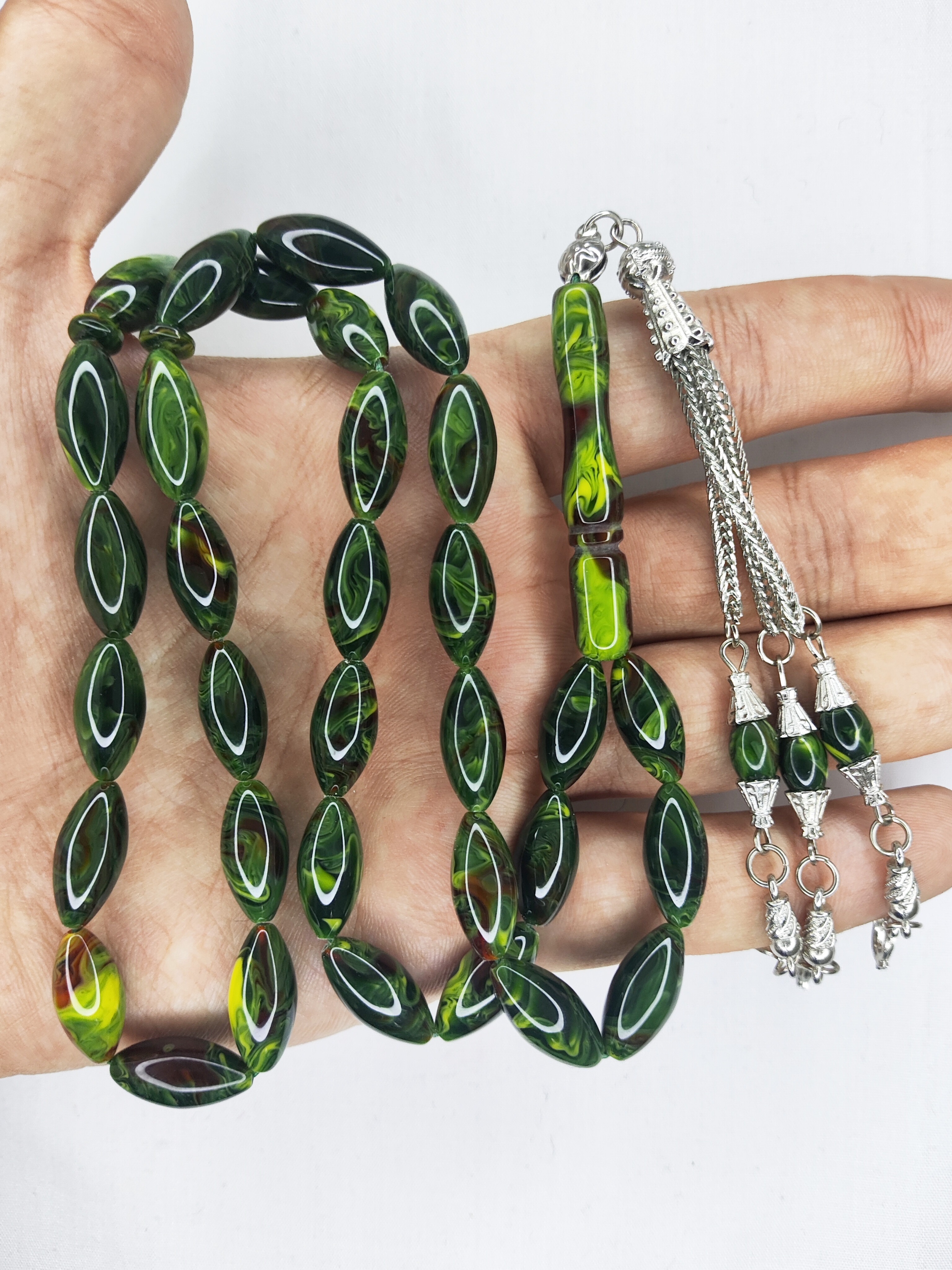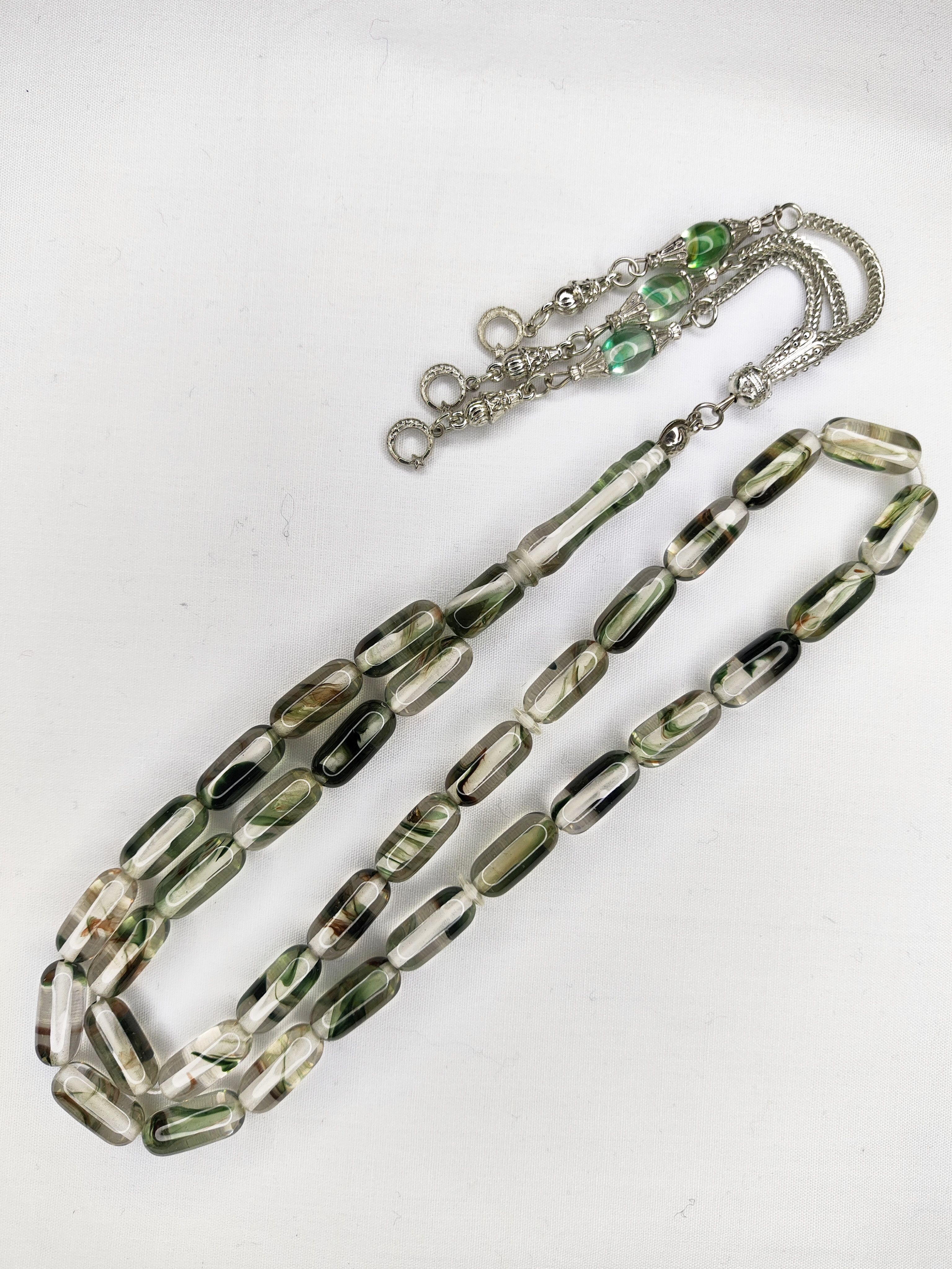 تسبیح کهربا رگه دار 33عددی رنگ سبز خاص و کلکسیونی همراه بافت شکیل