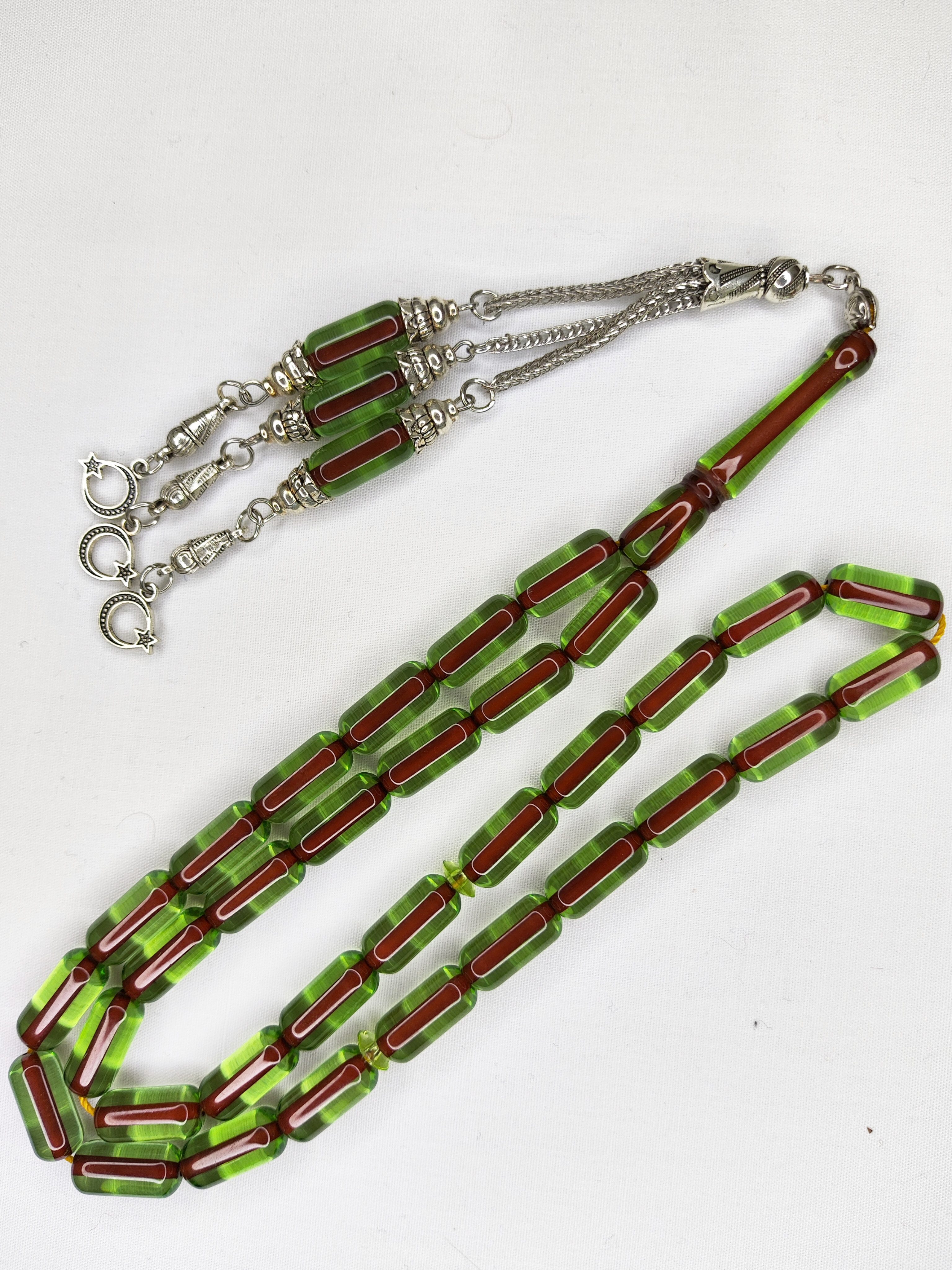 تسبیح کهربا 33عددی تراش کپسولی رنگ سبز و زرشکی خوشدست و زیبا همراه با سر تسبیح استیل شکیل