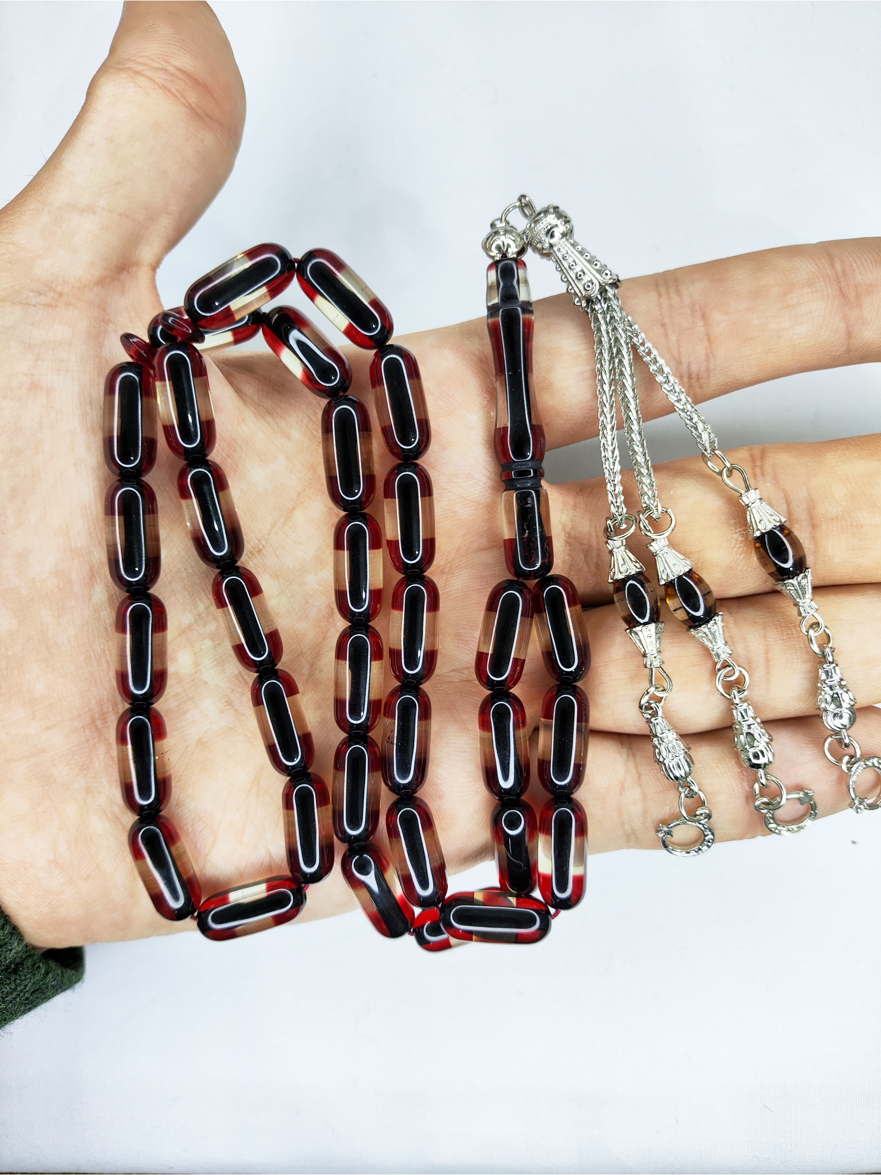 تسبیح کهربا 33 عددی کلکسیونی رنگ قرمز و سیاه همراه سر تسبیح استیل فاخر و زیبا