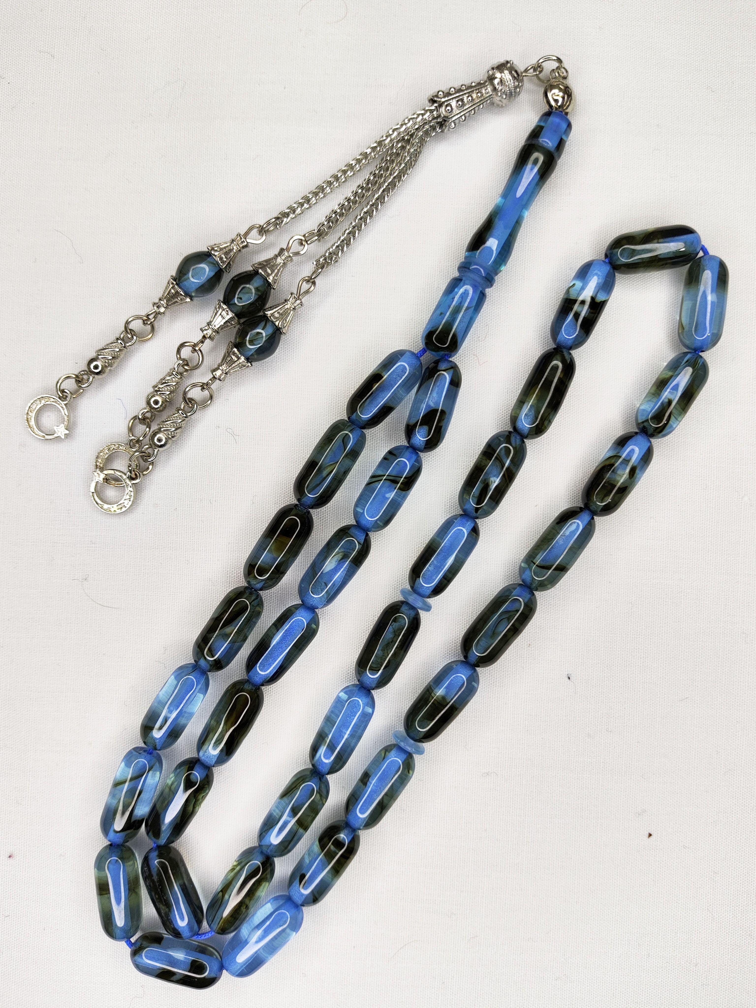 تسبیح کهربا رگه دار ابرو بادی 33عددی تراش کپسولی خوشدست رنگ آبی کربنی زیبا