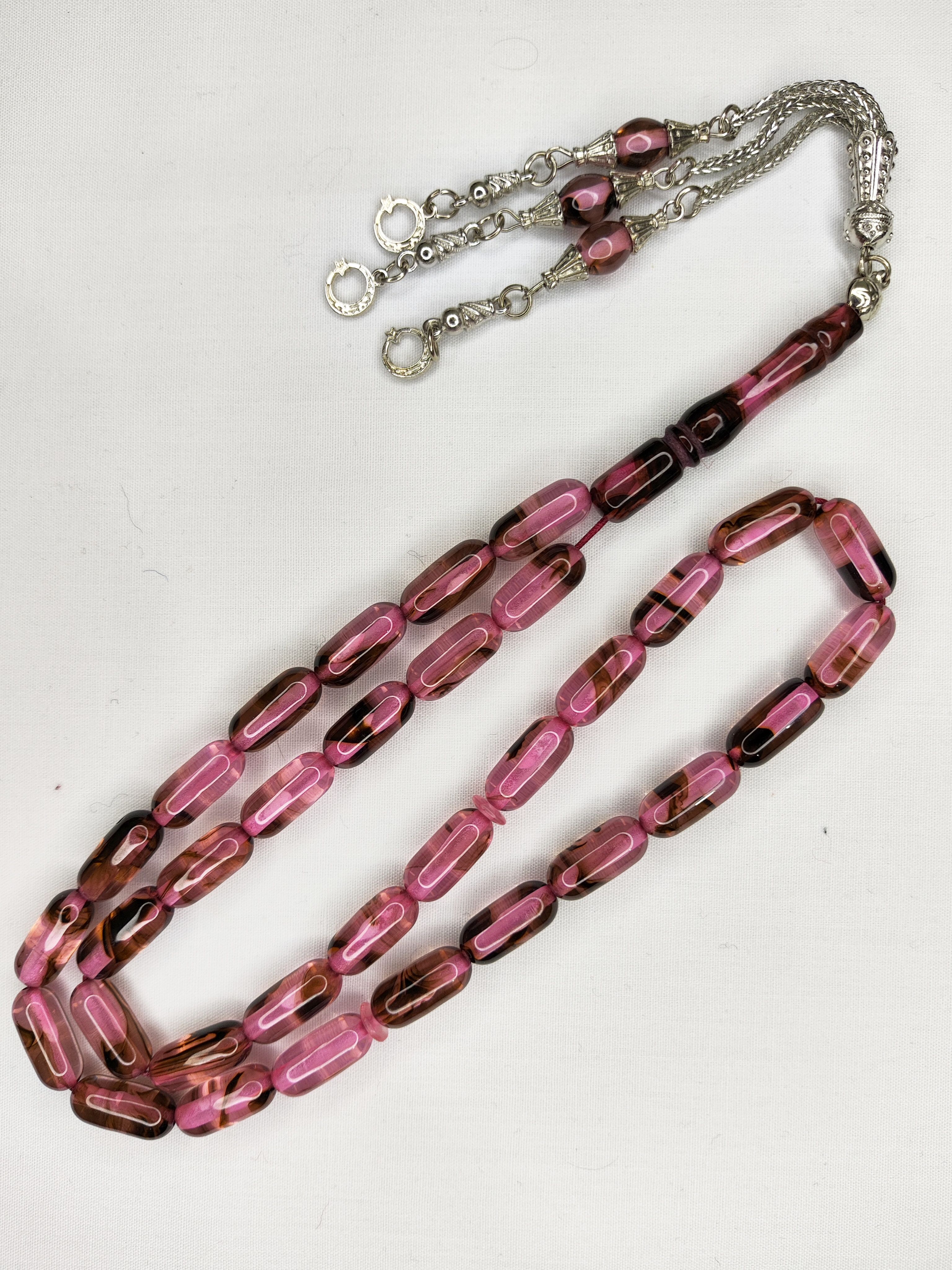 تسبیح کهربا رگه دار ابرو بادی 33عددی تراش کپسولی خوشدست رنگ صورتی همراه سر تسبیح زیبا