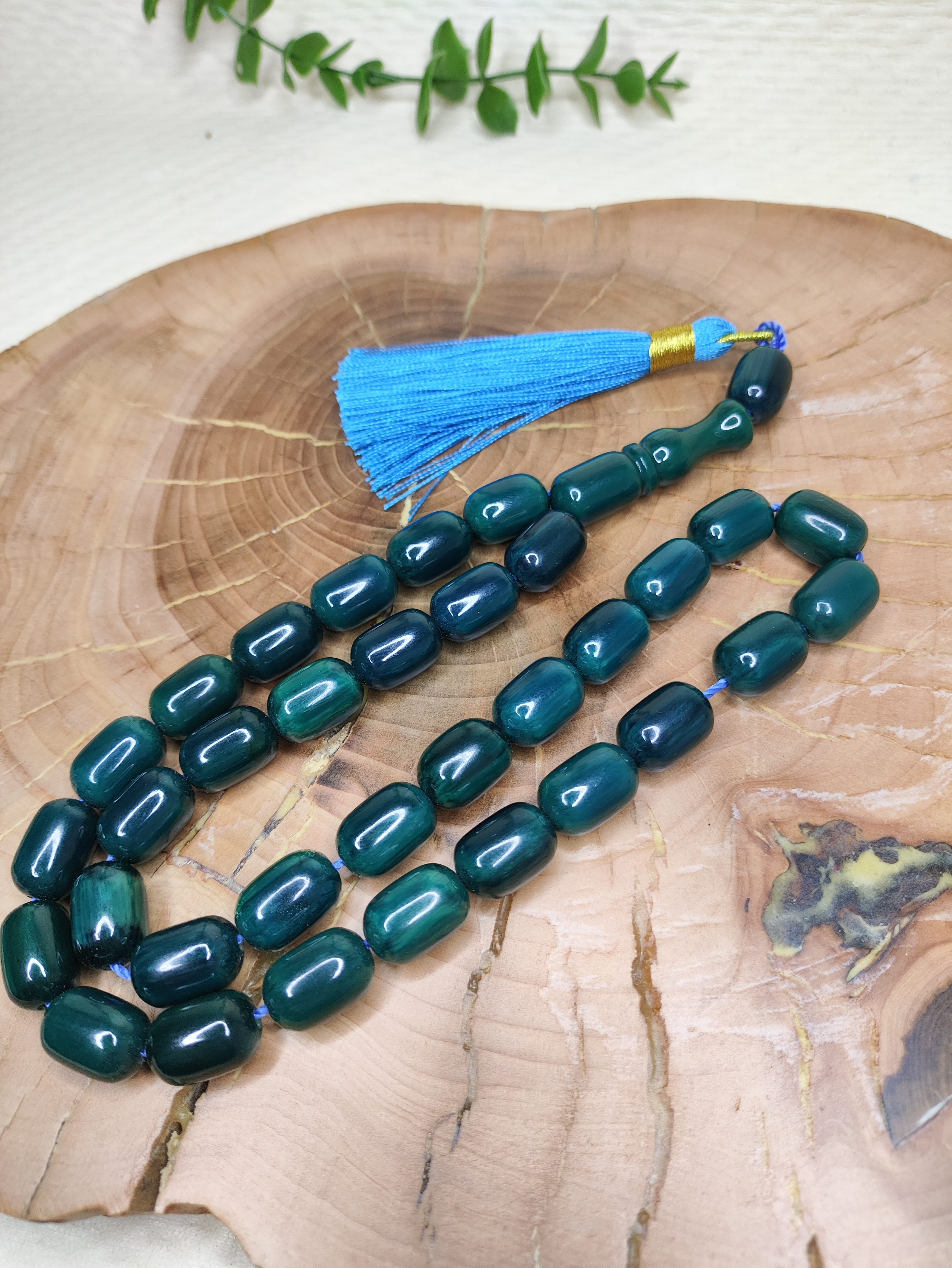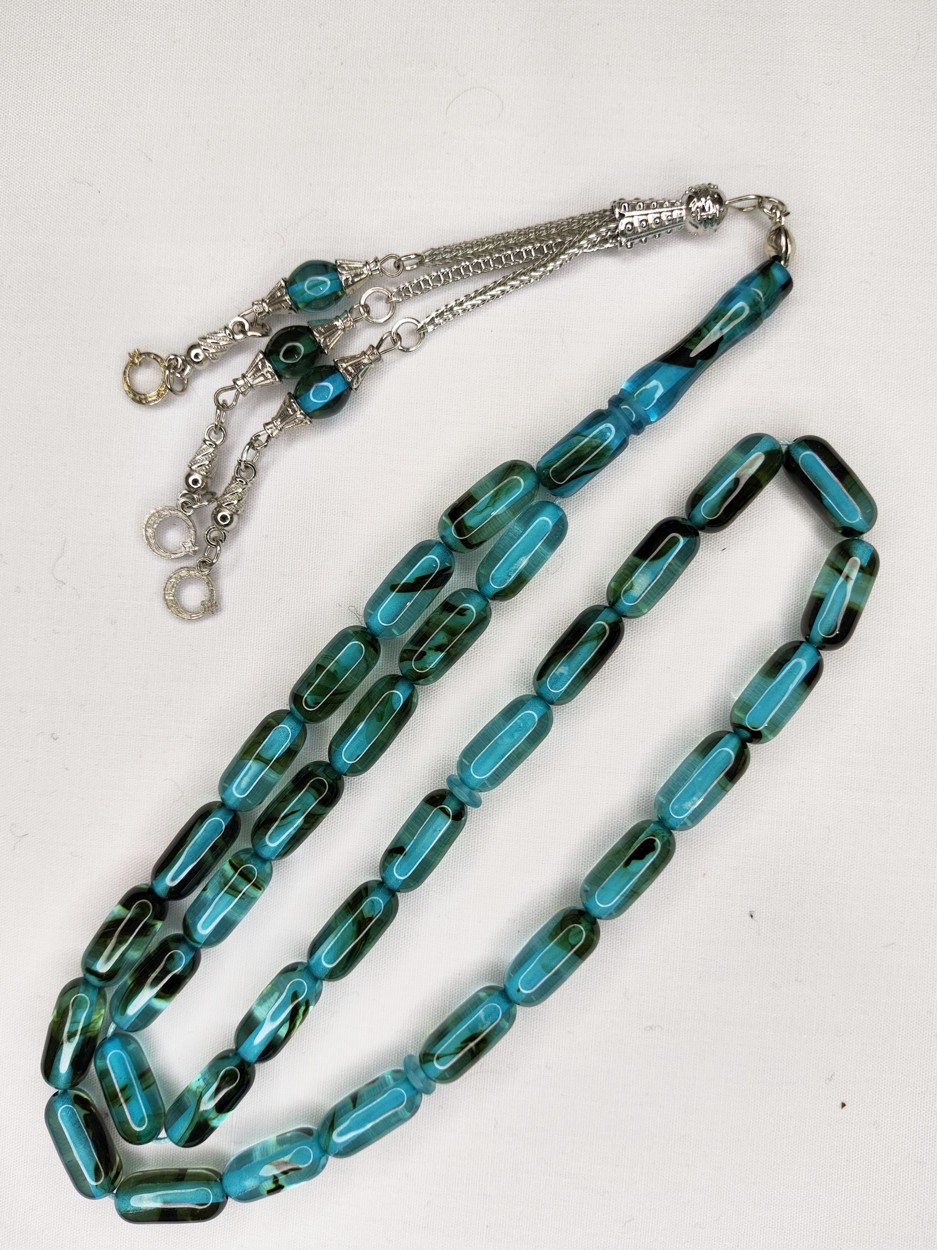 تسبیح کهربا رگه دار ابرو بادی 33عددی تراش کپسولی خوشدست رنگ فیروزهای ای زیبا و کلکسیونی