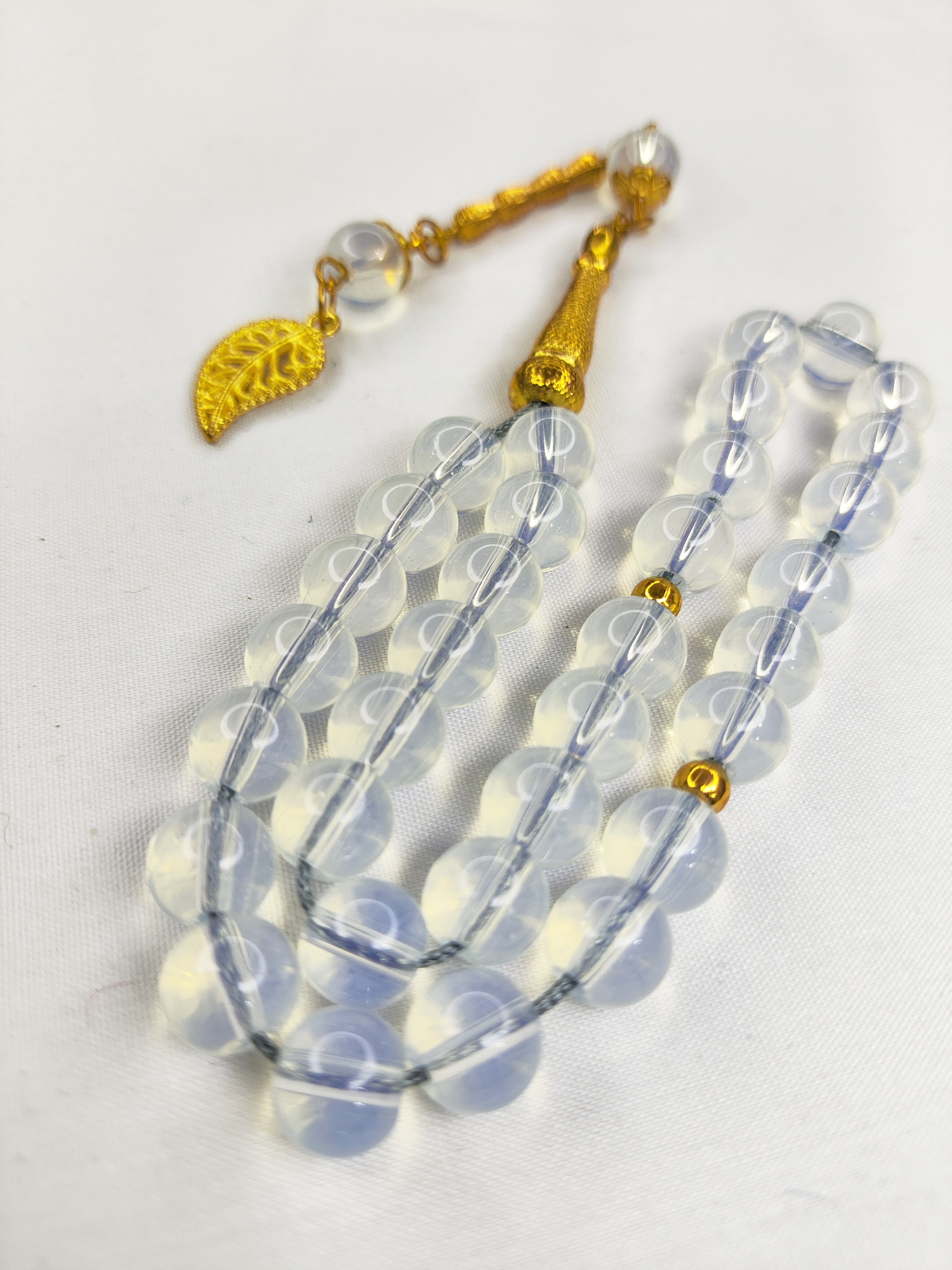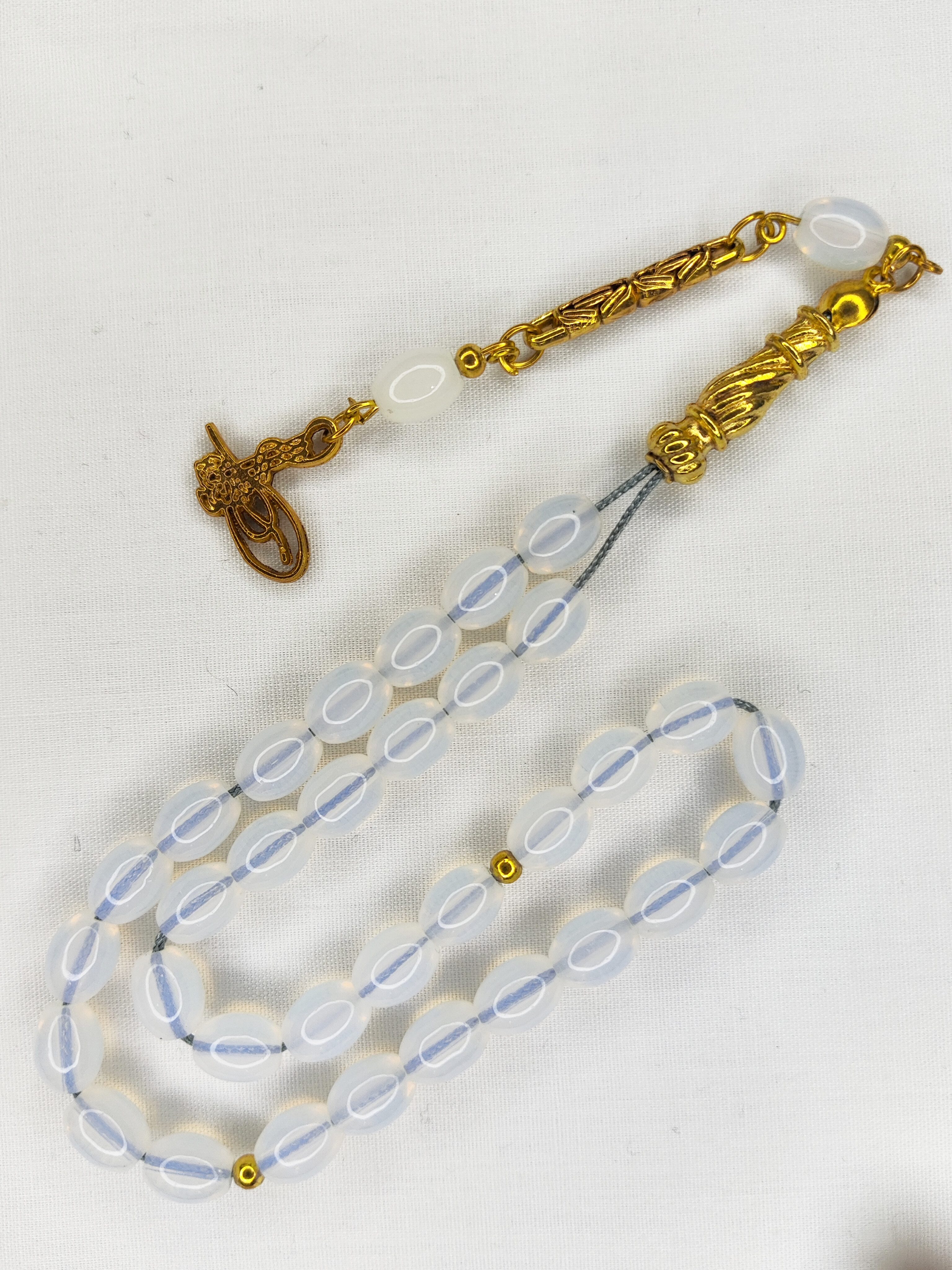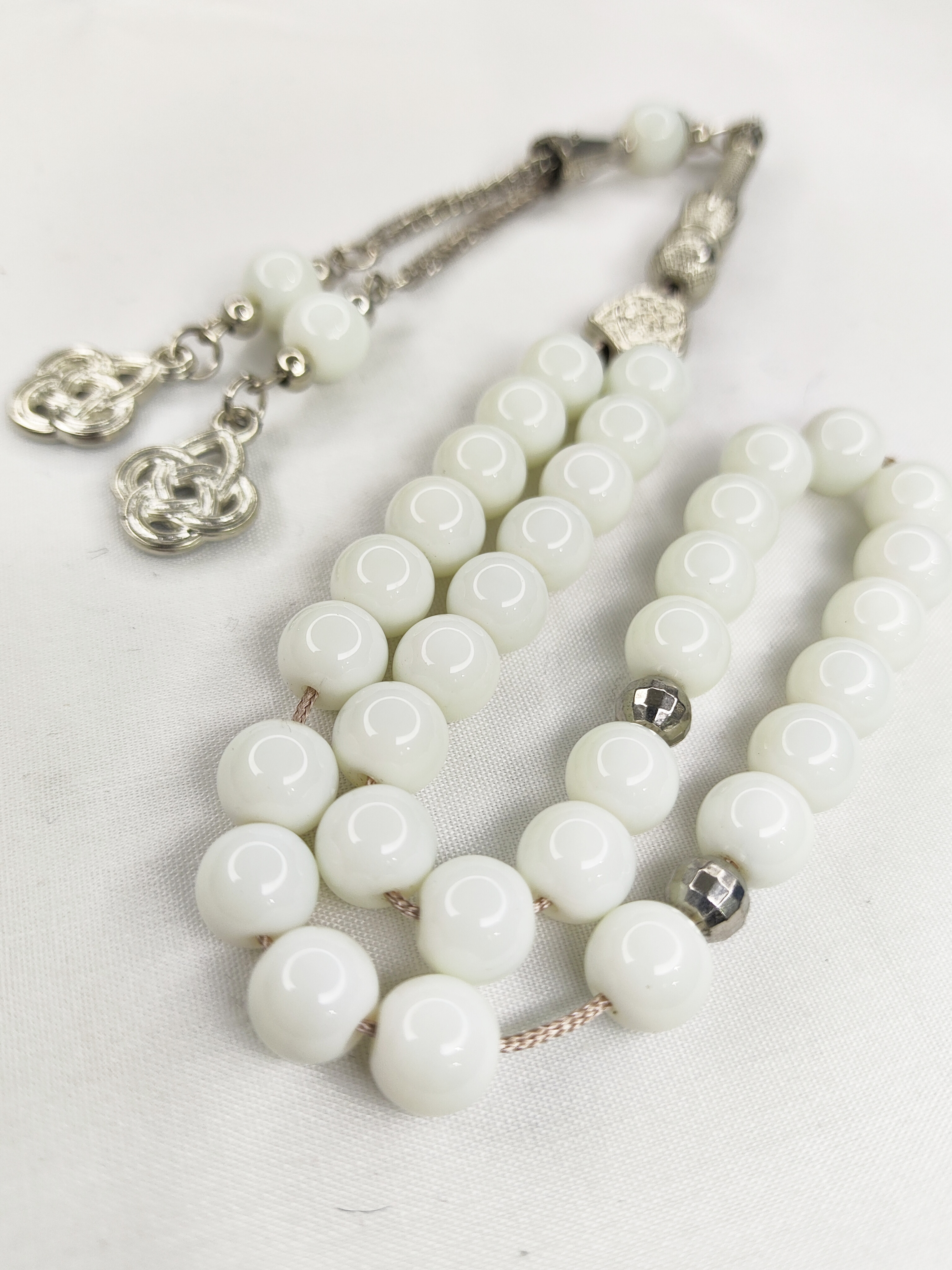 تسبیح شیشهای 33عددی رنگ سفید شیری همراه سرتسبیح استیل شکیل قیمت مناسب