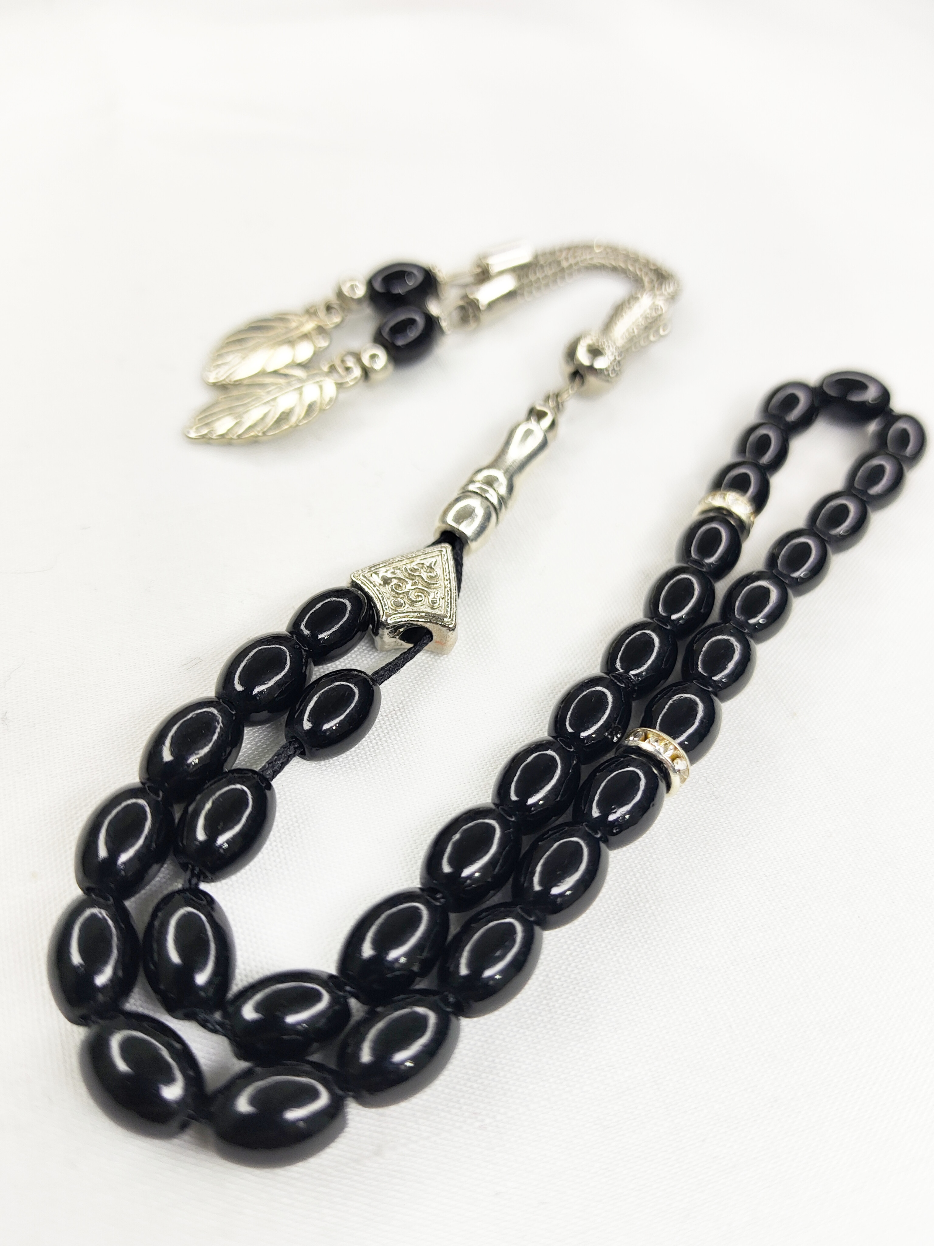 تسبیح کهربا زرافشان 33عددی رنگ سیاه خاص همراه سرتسبیح استیل شکیل