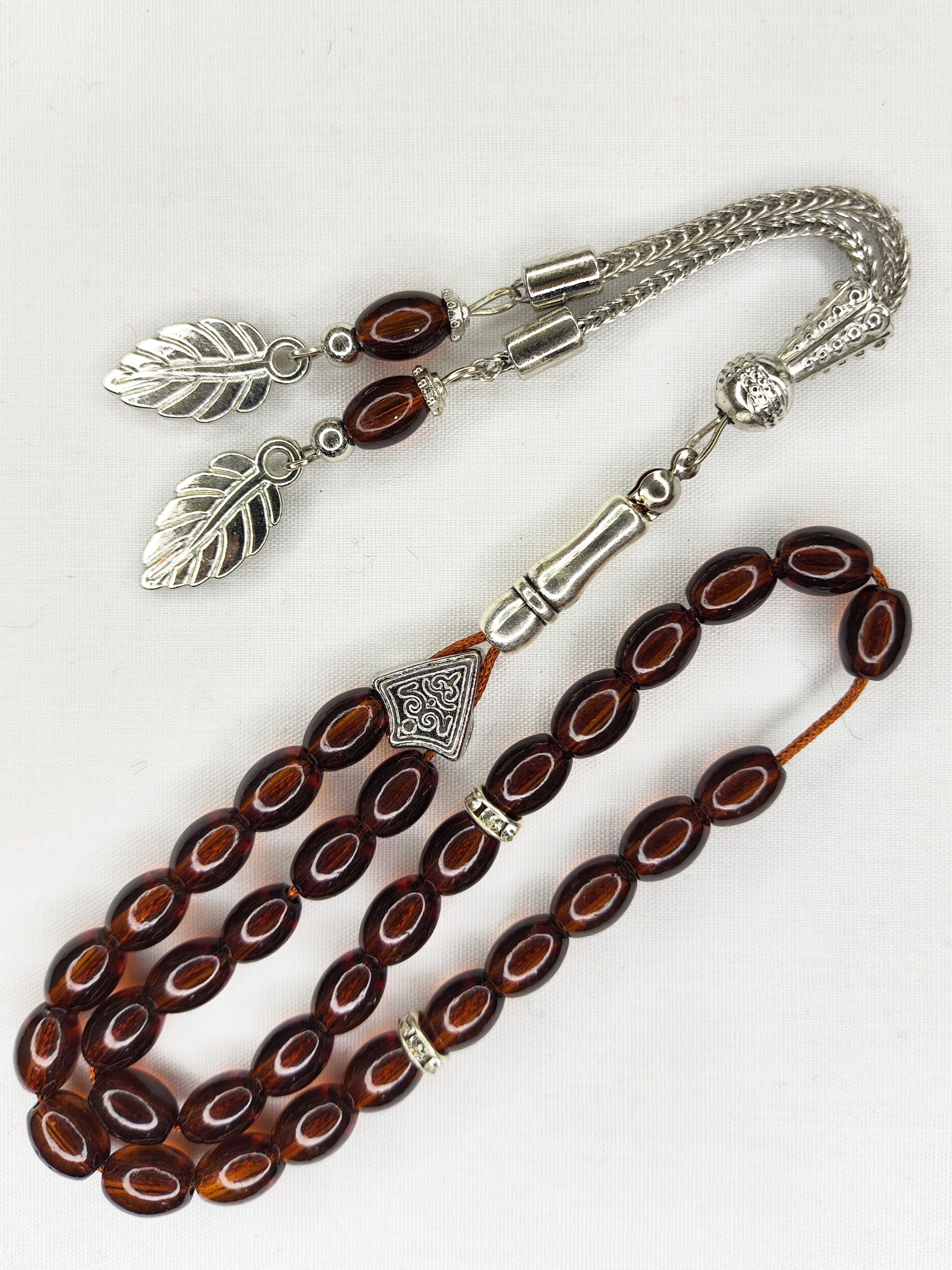 تسبیح کهربا ابرو بادی 33عددی تراش کپسولی خوشدست همراه سر تسبیح استیل شکیل