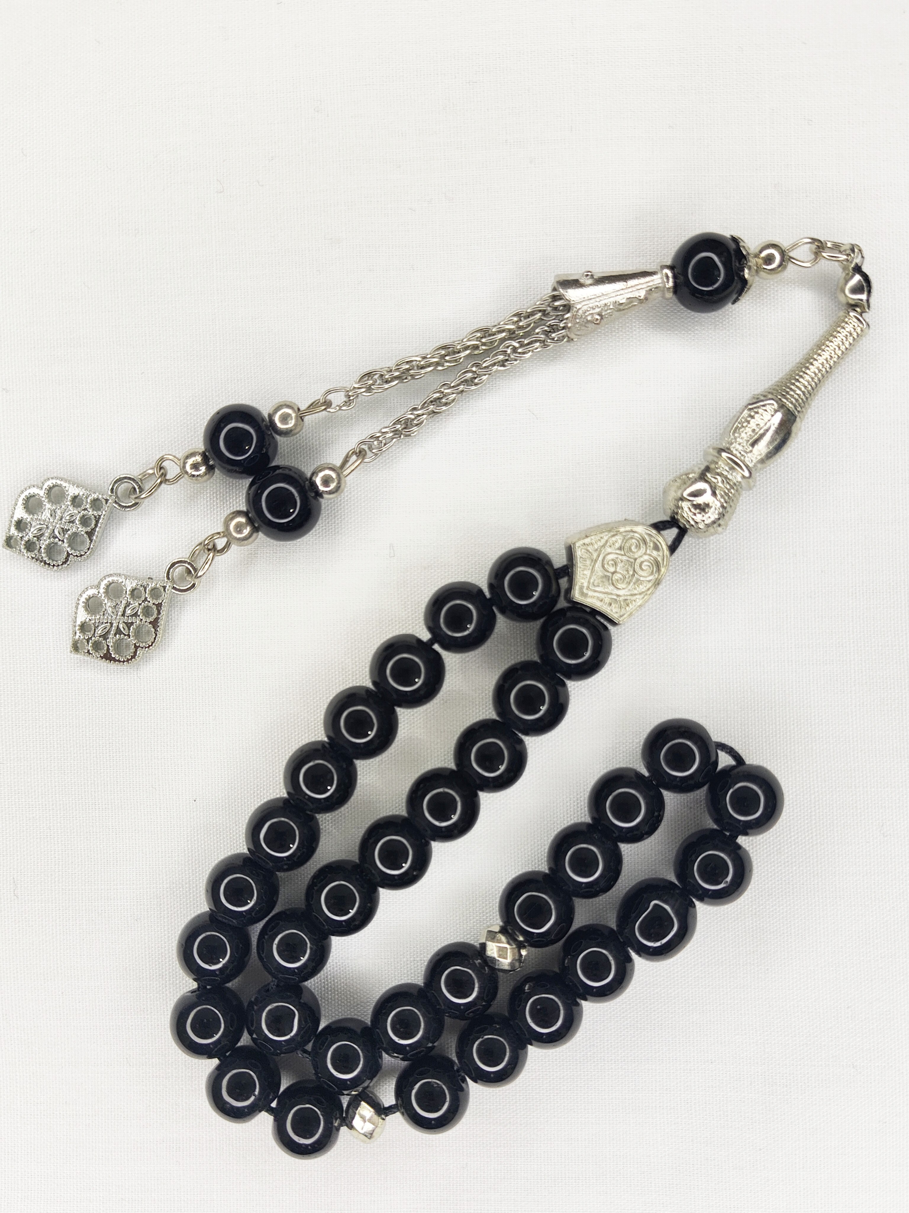 تسبیح شیشهای 33عددی رنگ مشکی تراش هلی خوشدست همراه سر تسبیح استیل شکیل