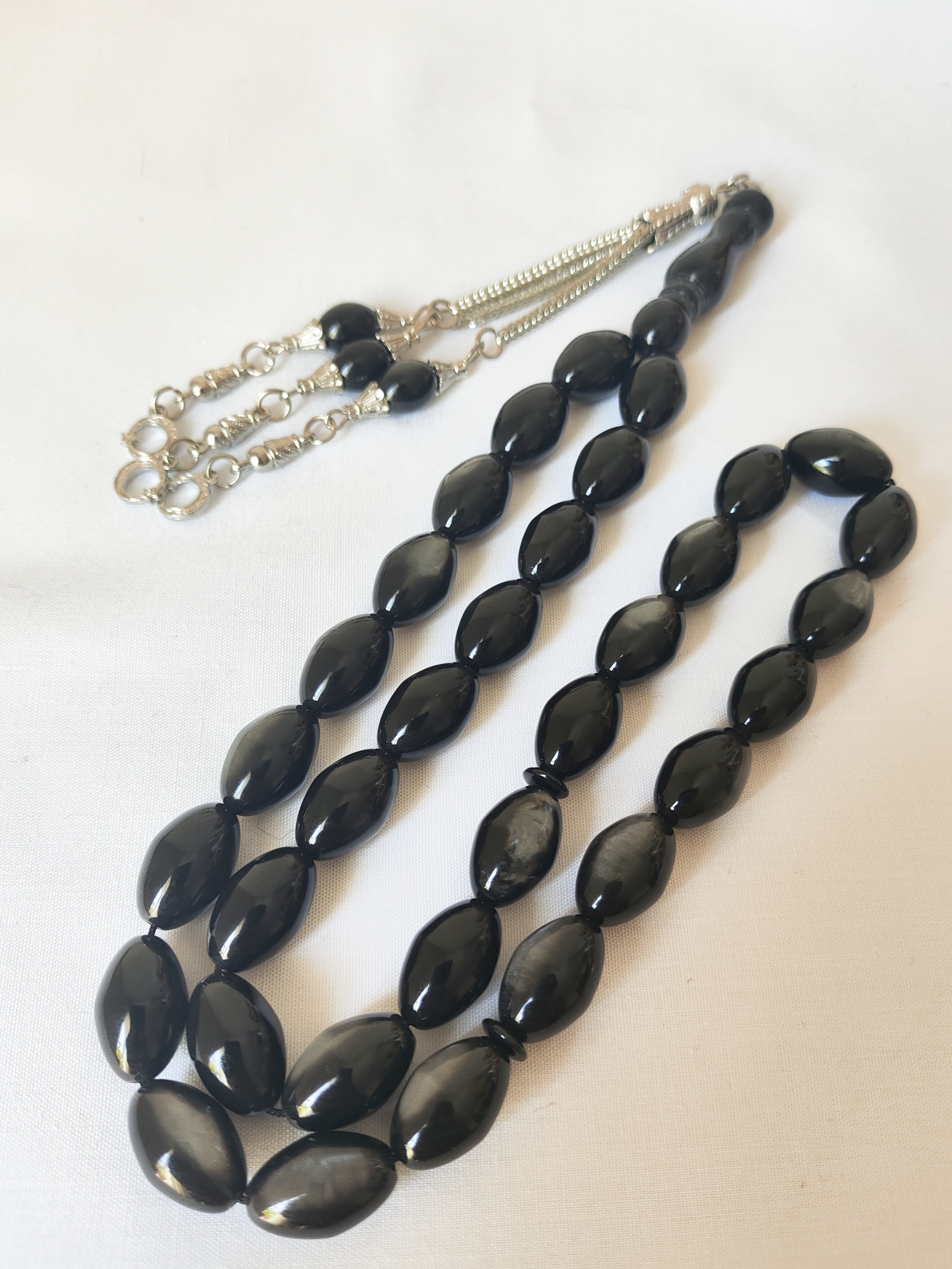 تسبیح کهربا رگه دار ابرو بادی 33عددی تراش کپسولی خوشدست همراه سر تسبیح استیل