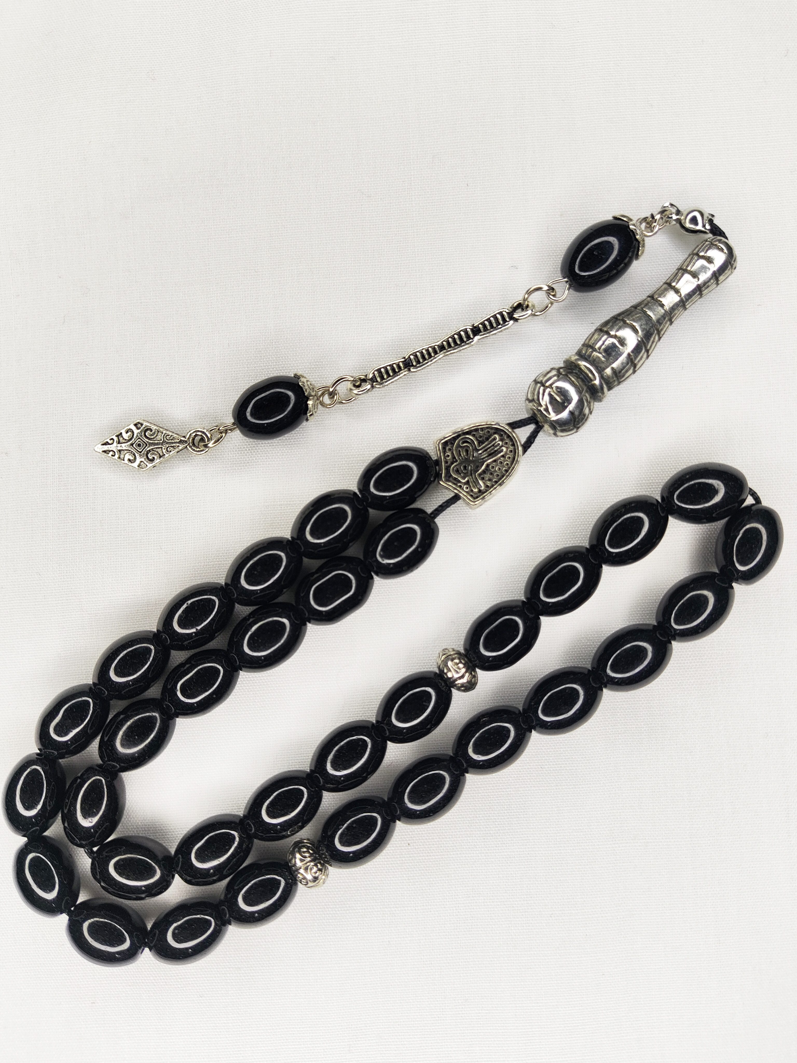 تسبیح کهربا 33عددی رنگ سیاه و سفید فاخر همراه سر تسبیح استیل شکیل