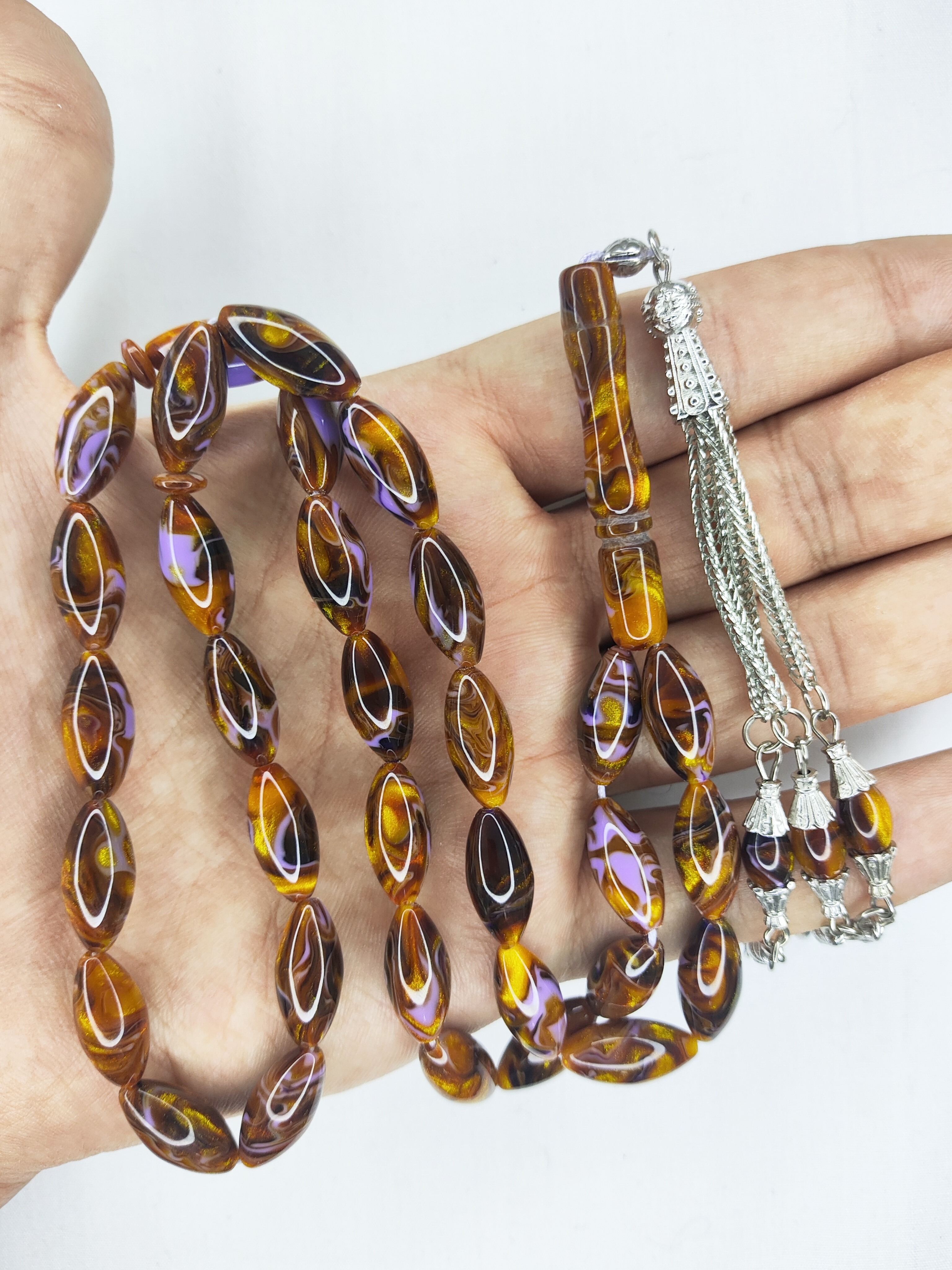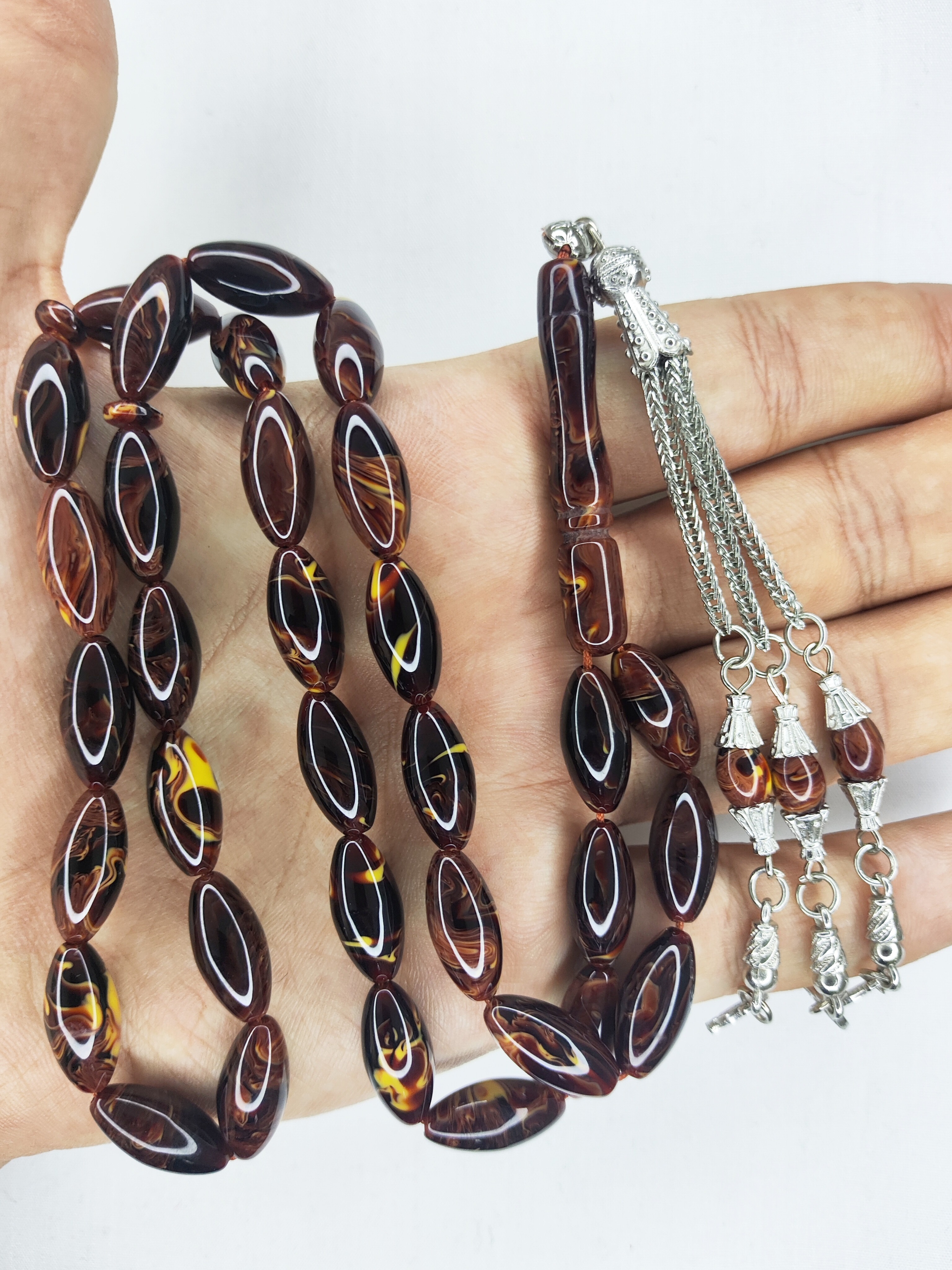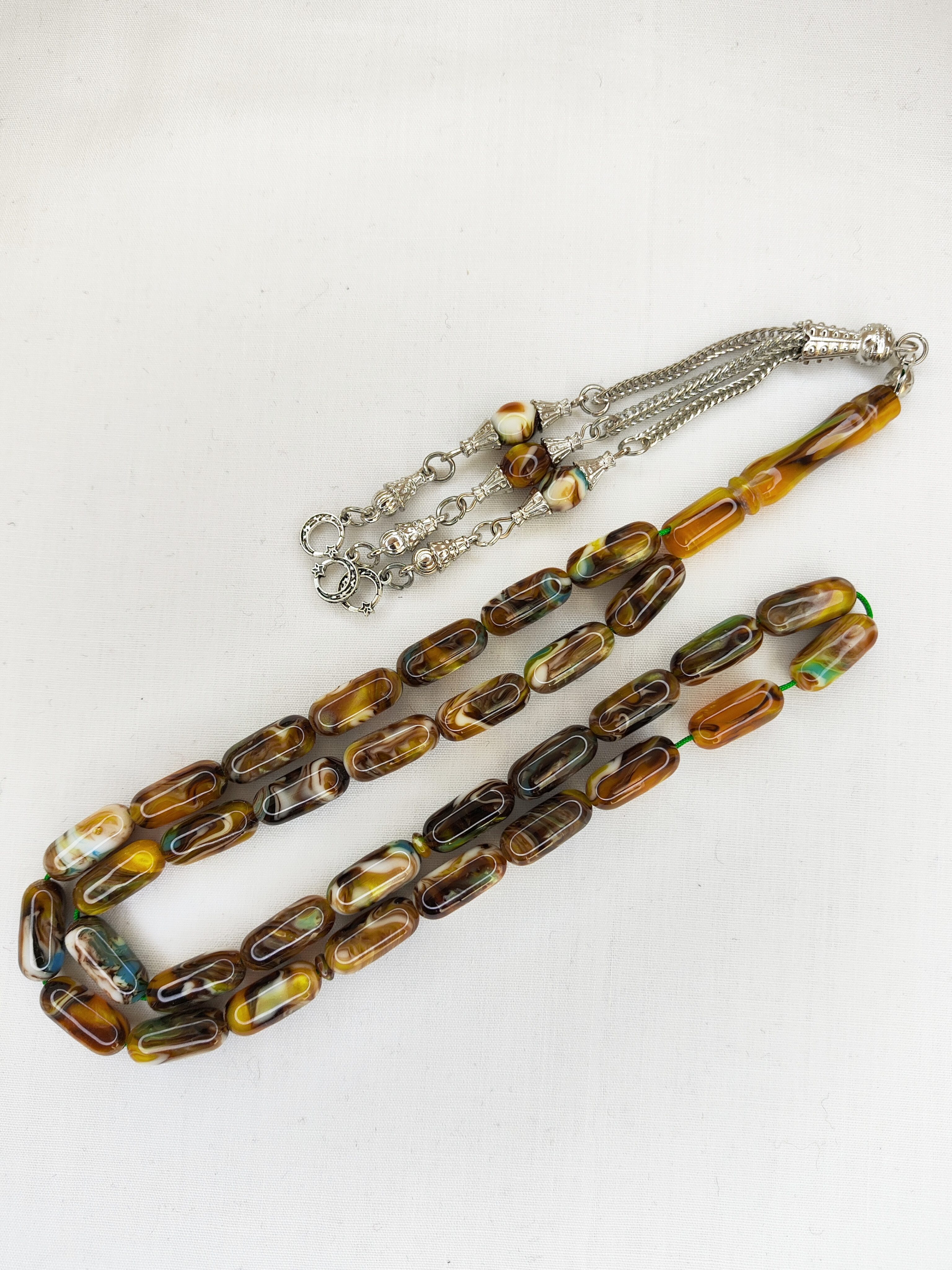 تسبیح کهربا رگه دار قهوهای رنگ تراش استانبولی زیا و خوشدست