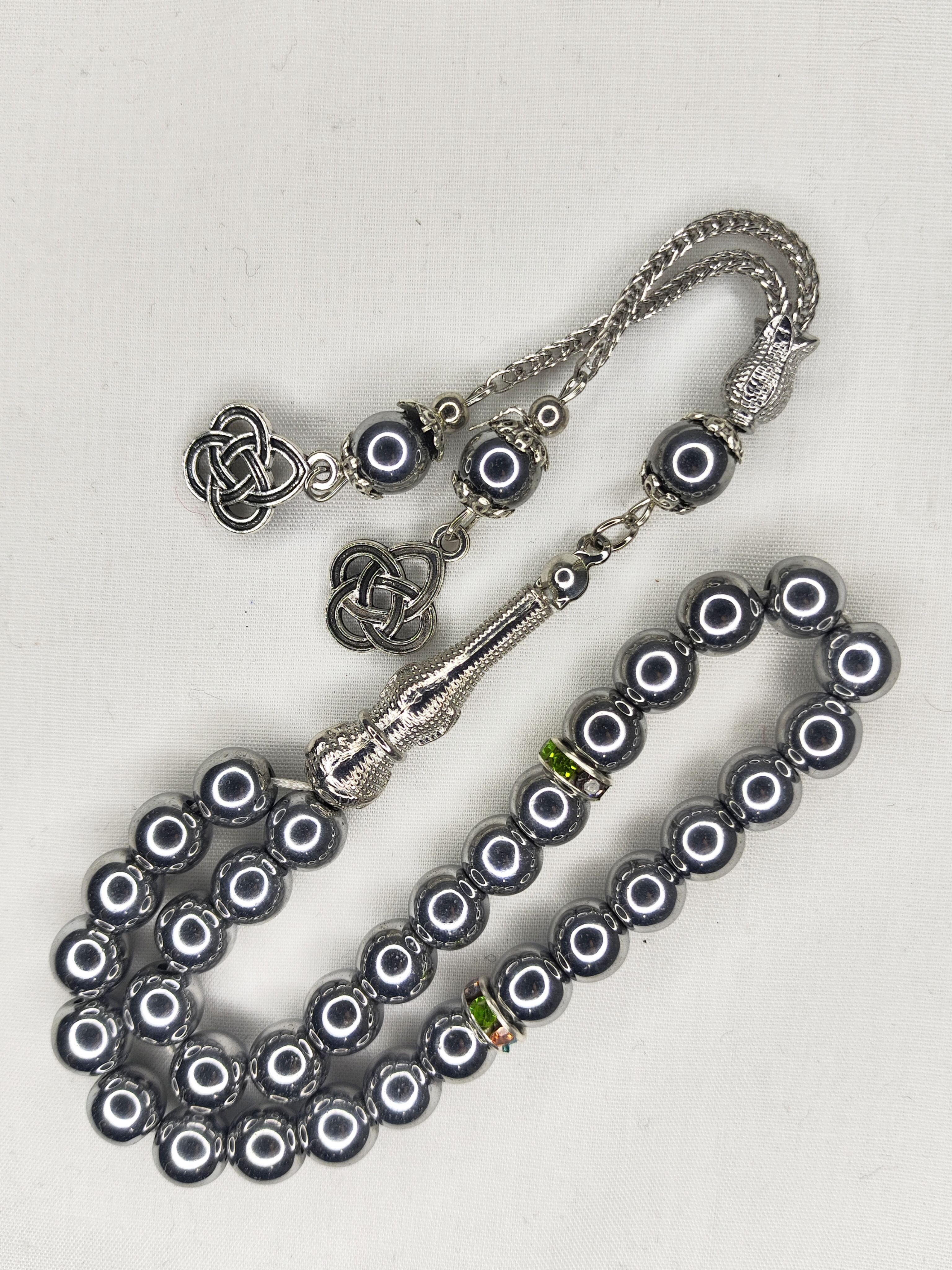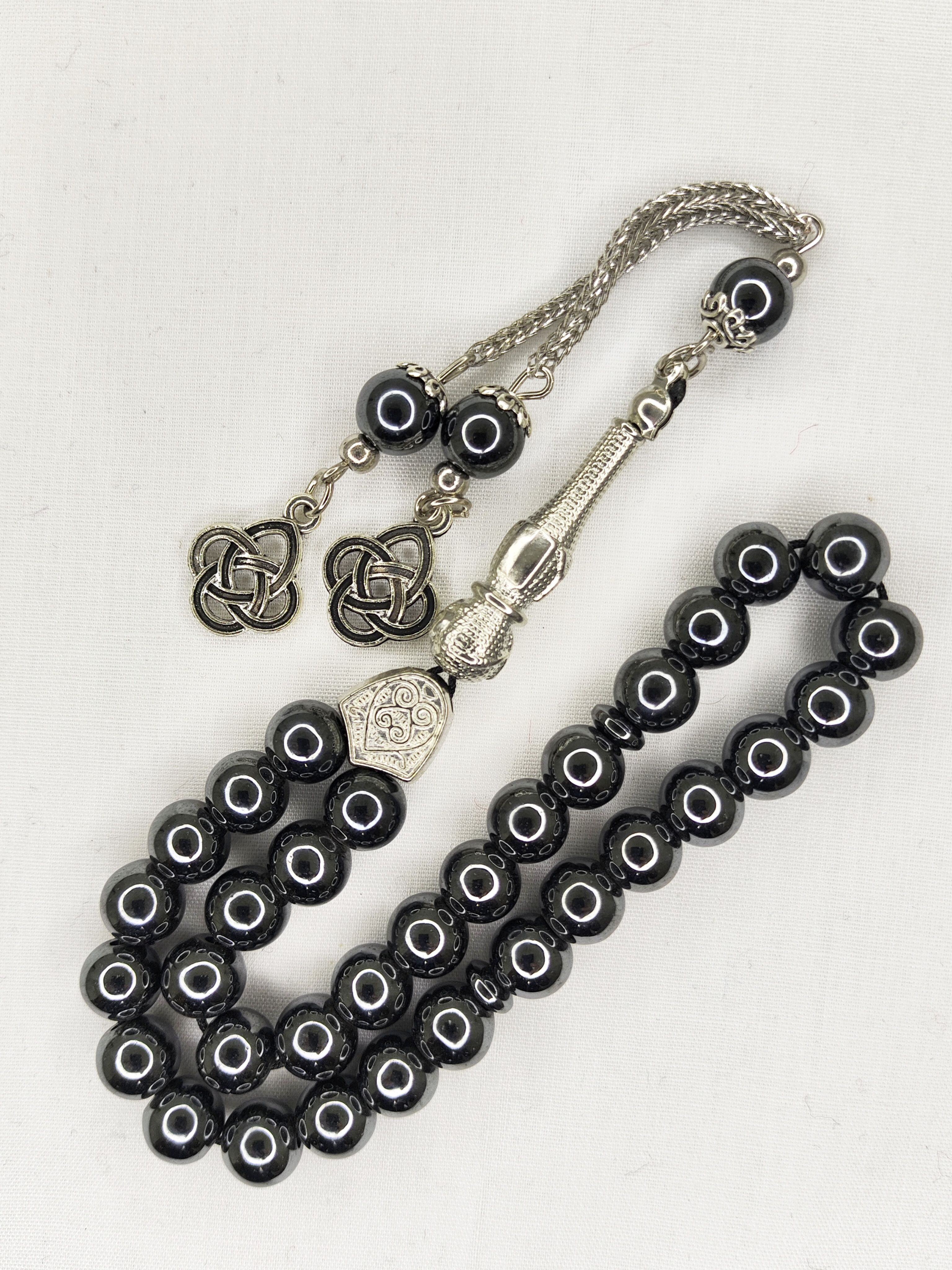 تسبیح حدید 33عددی تراش گرد نقره ای رنگ ثابت همراه سر تسبیح استیل شکیل
