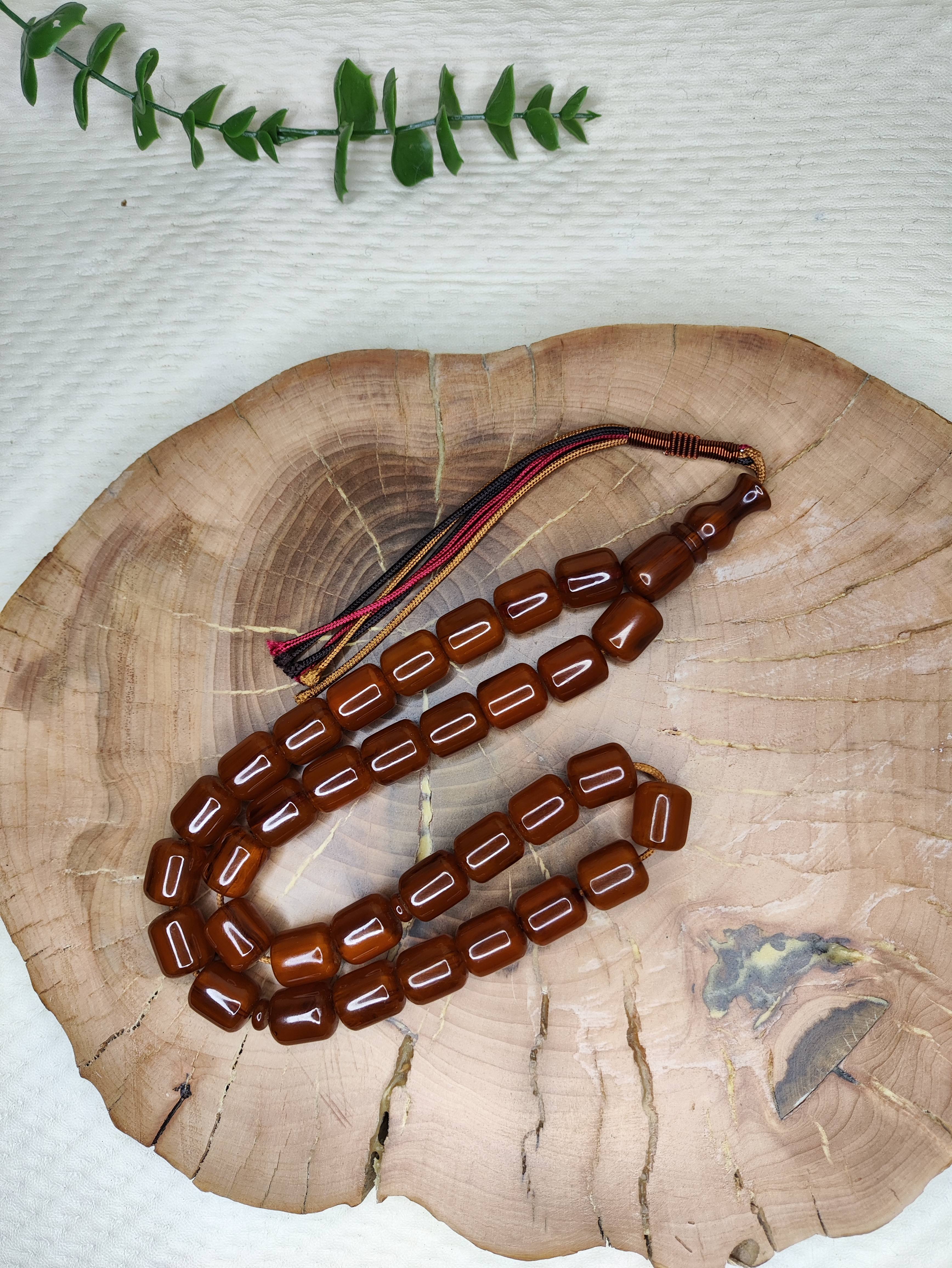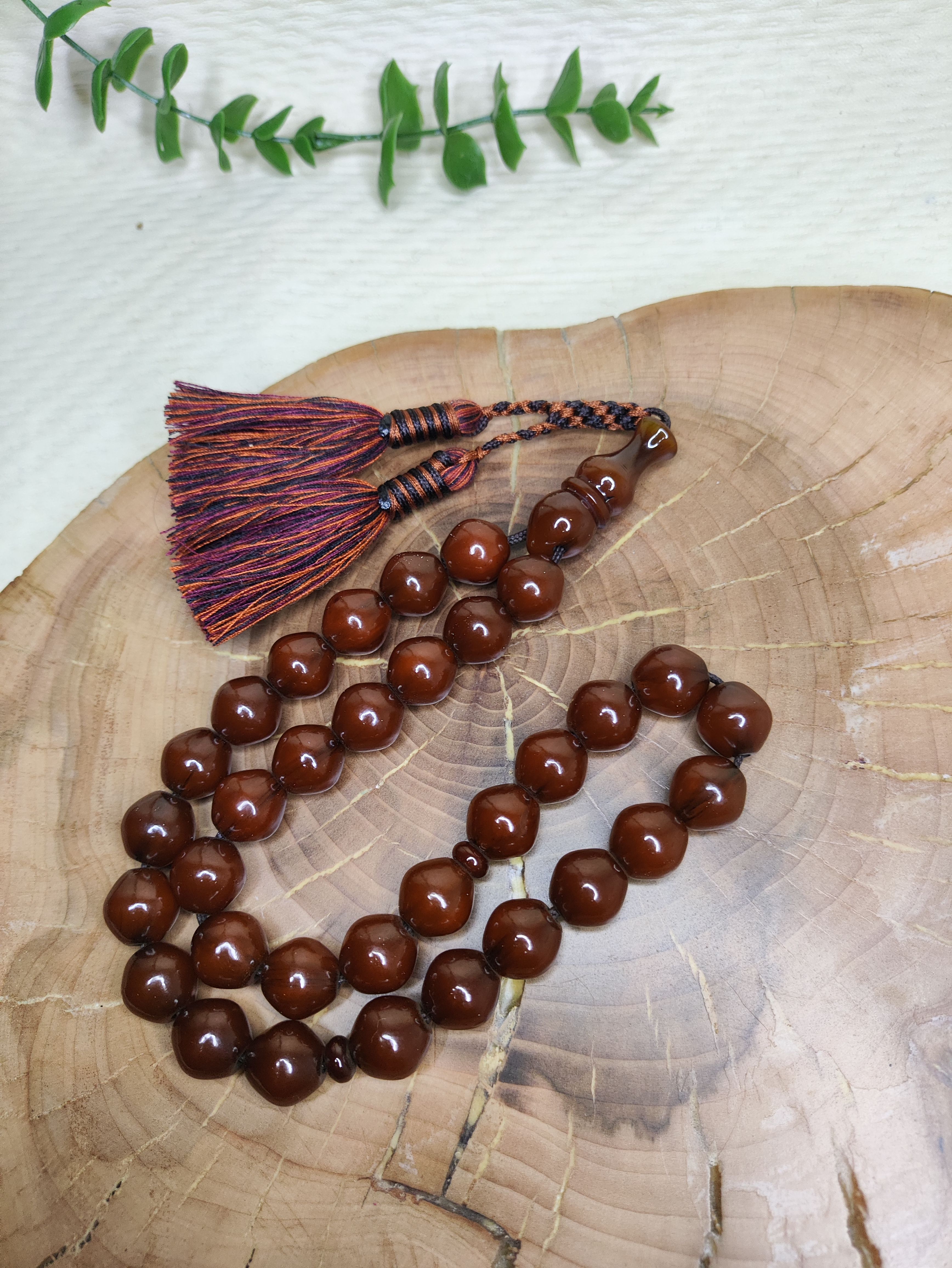تسبیح کهربا رگه دار 33عددی رنگ آجری لوکس و زیبا همراه بافت شکیل