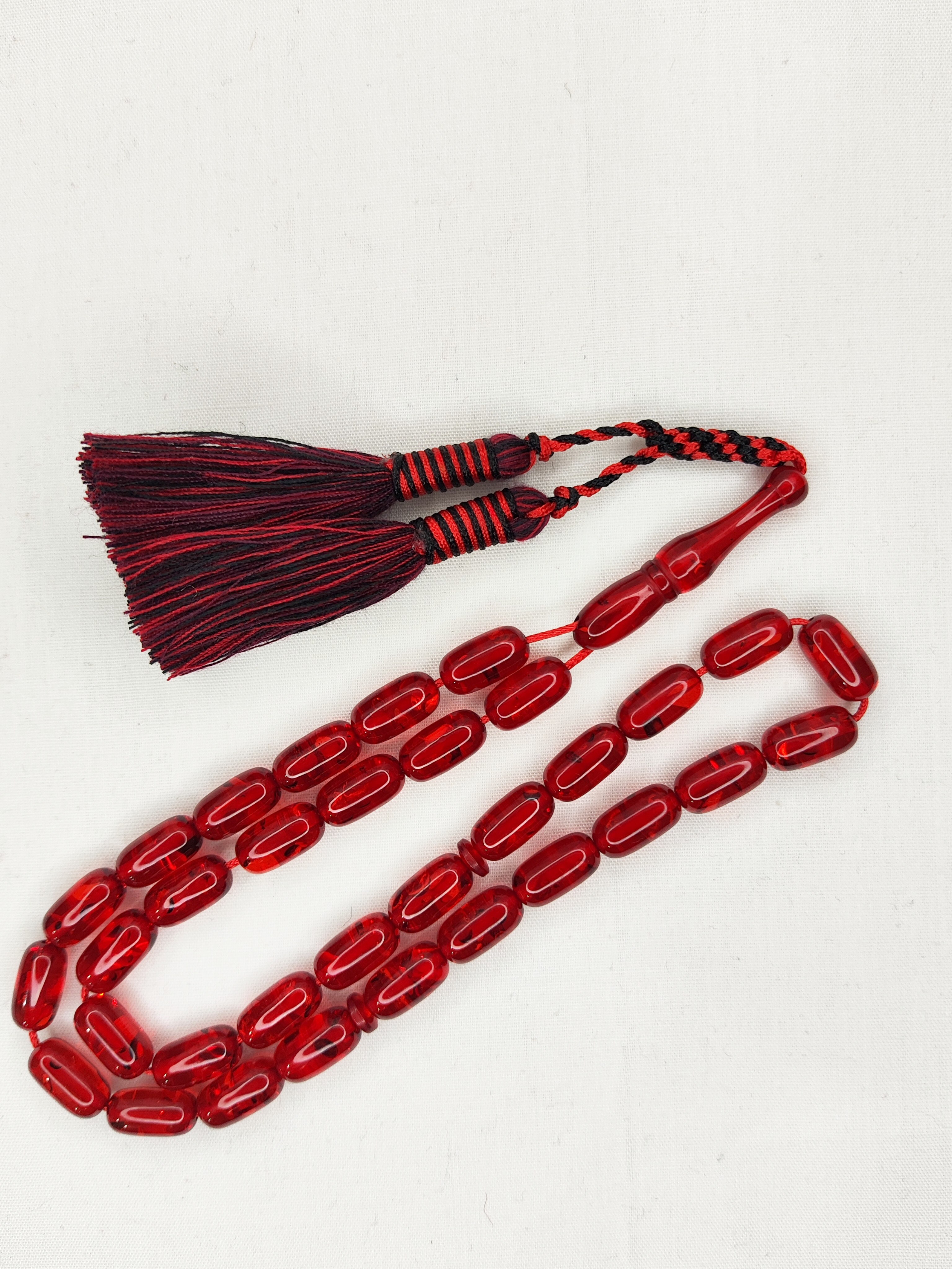 تسبیح کهربا نیم نیم 33عددی رنگ قرمز و سیاه تراش کپسولی خوشدست و زیبا