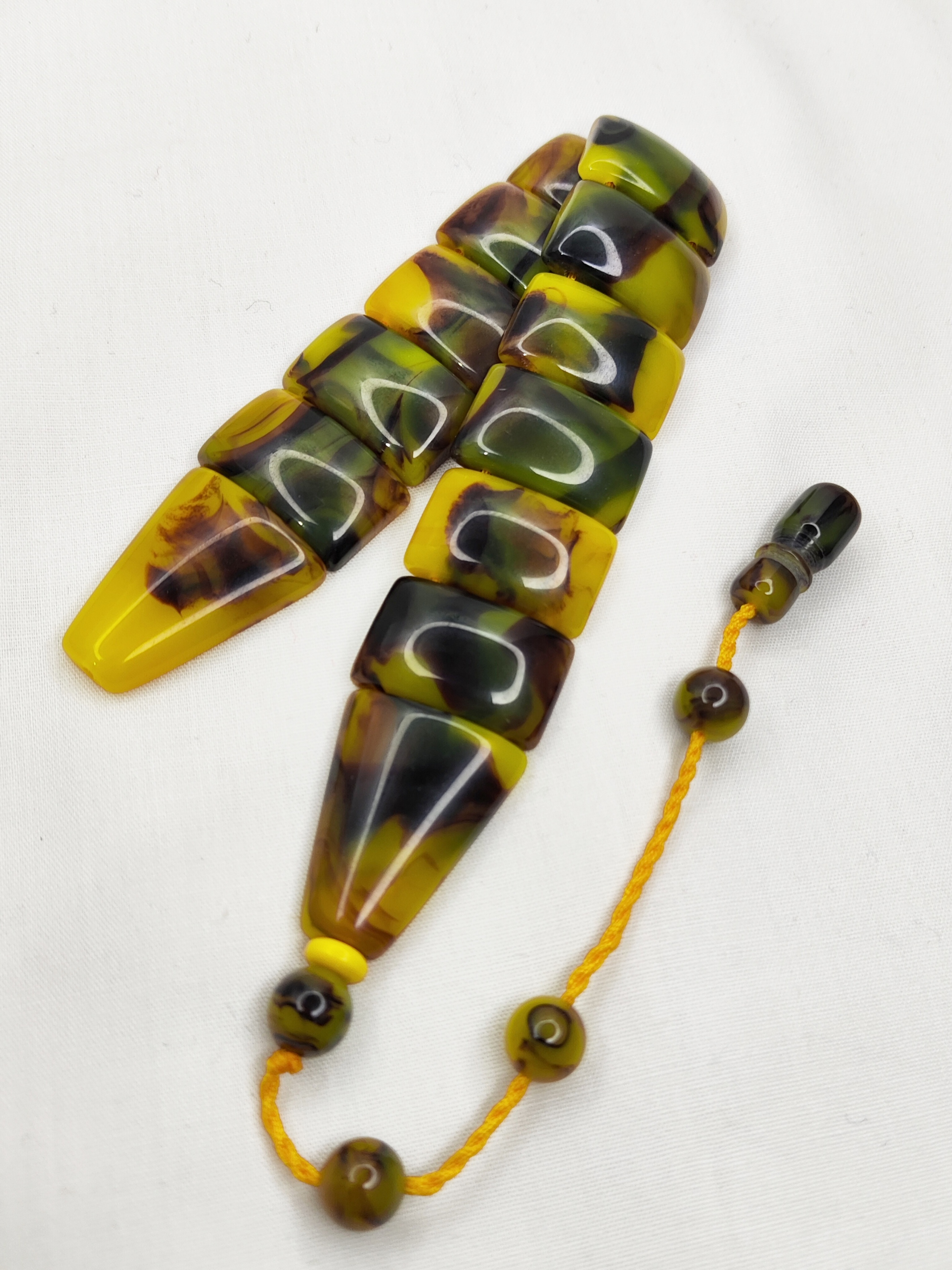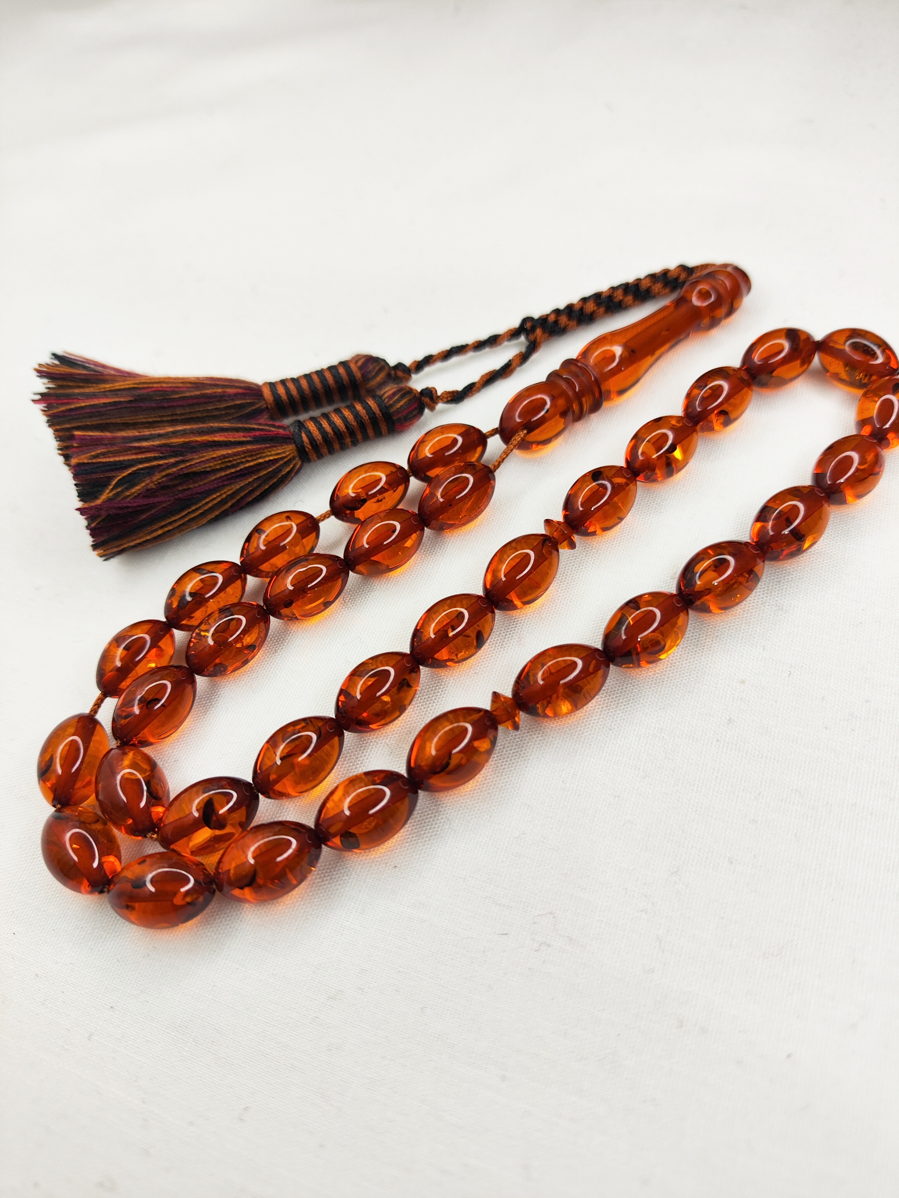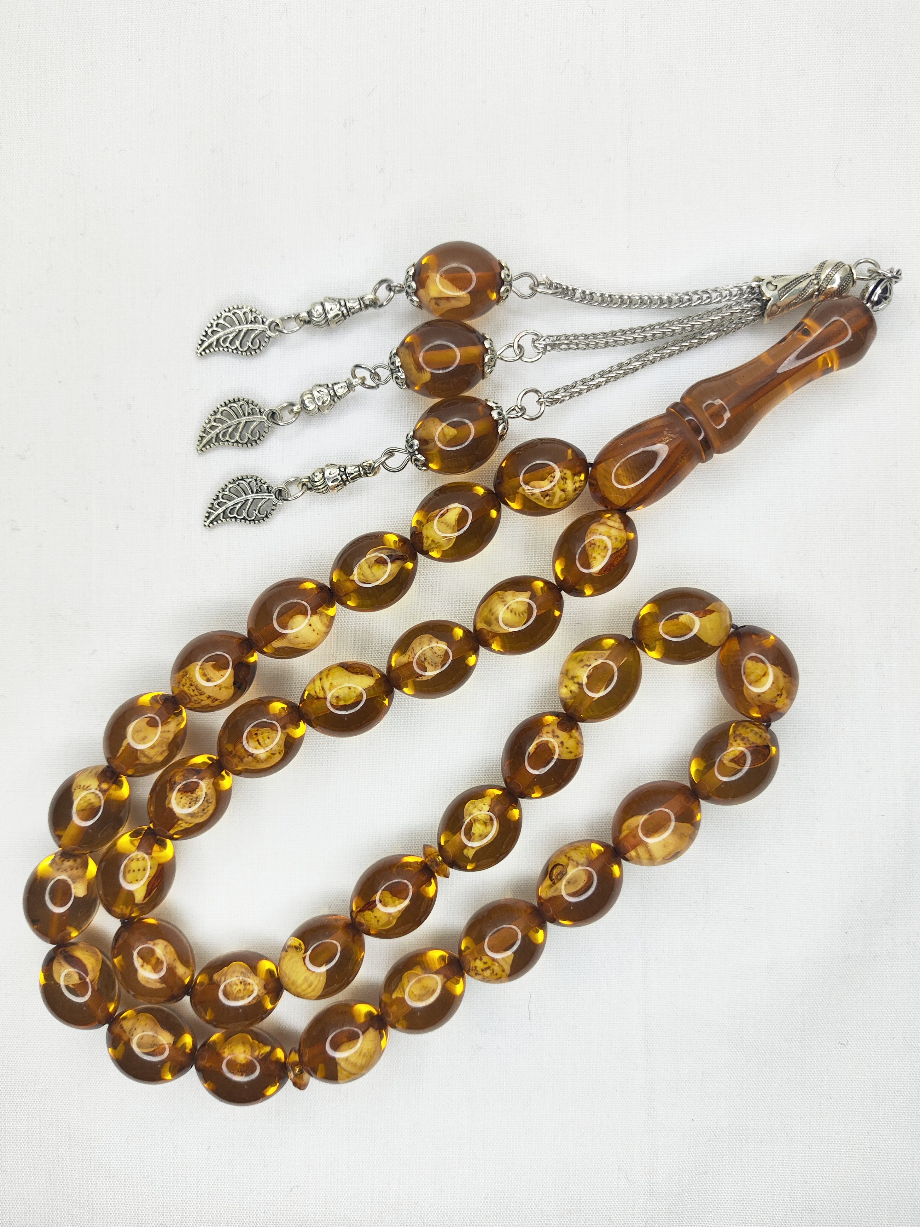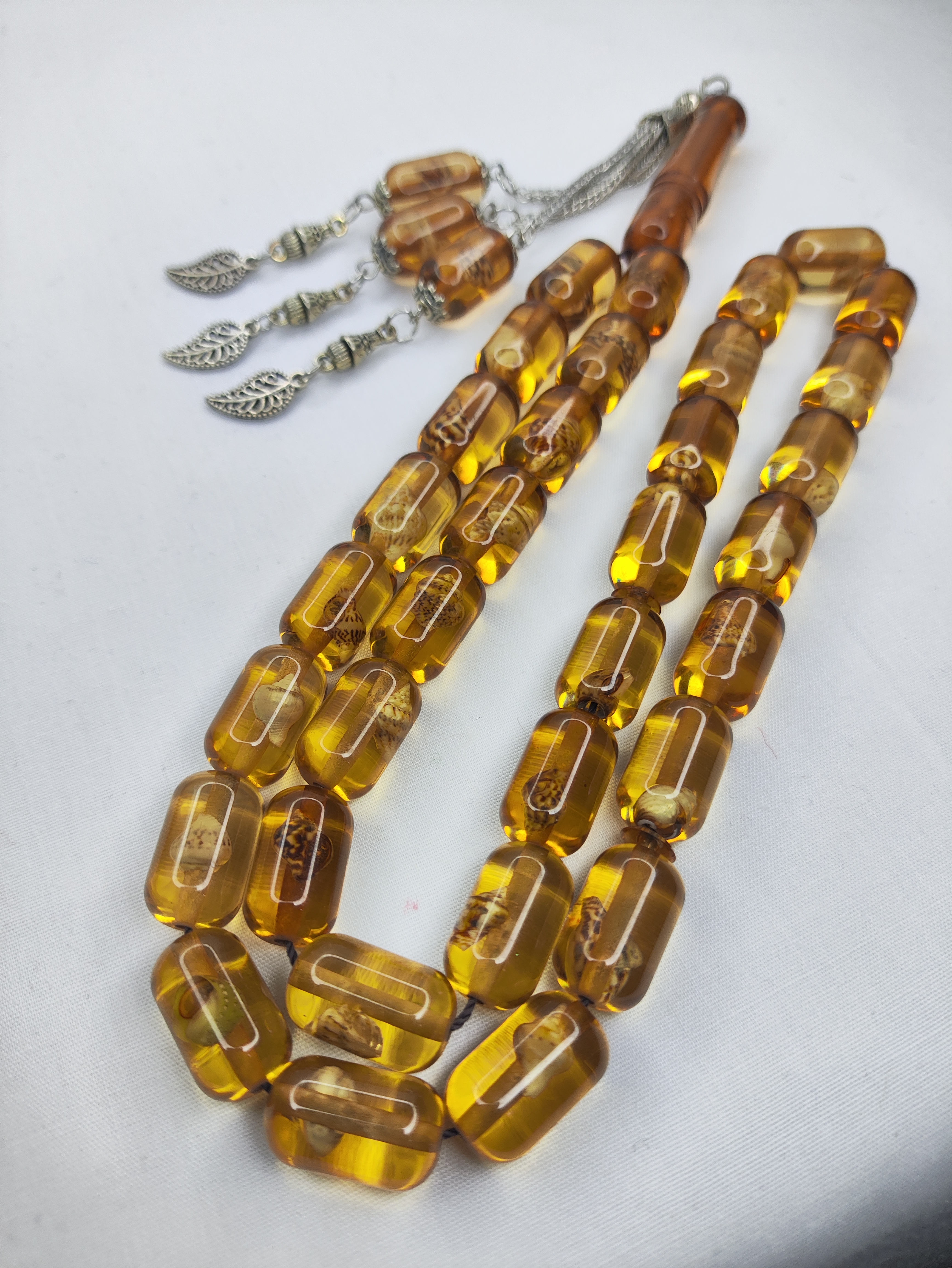 پلاستیک: برخی تسبیحهای کهربا مصنوعی از پلاستیکهای خاصی ساخته میشوند که به رنگ و بافت کهربای طبیعی شباهت دارند.