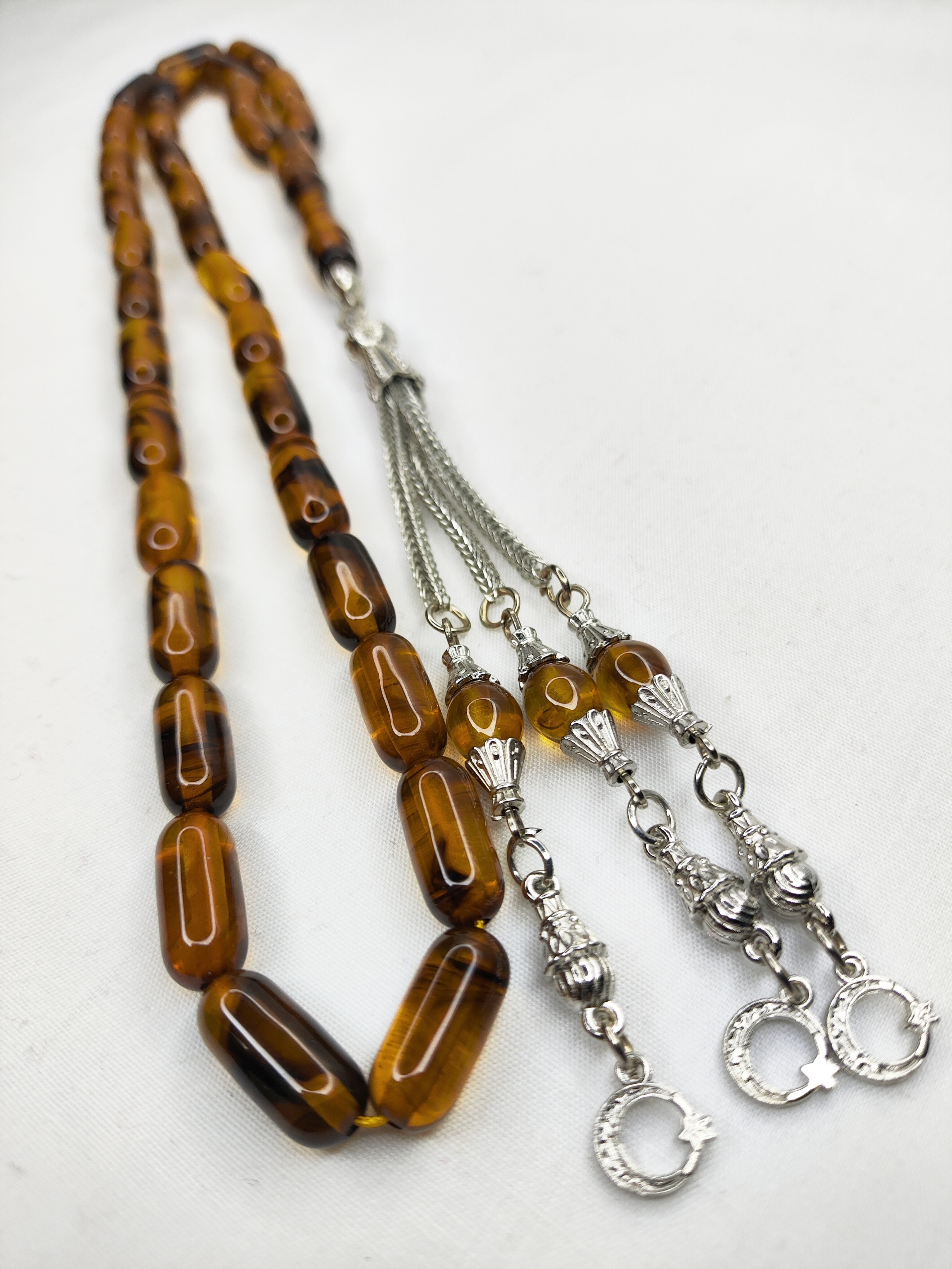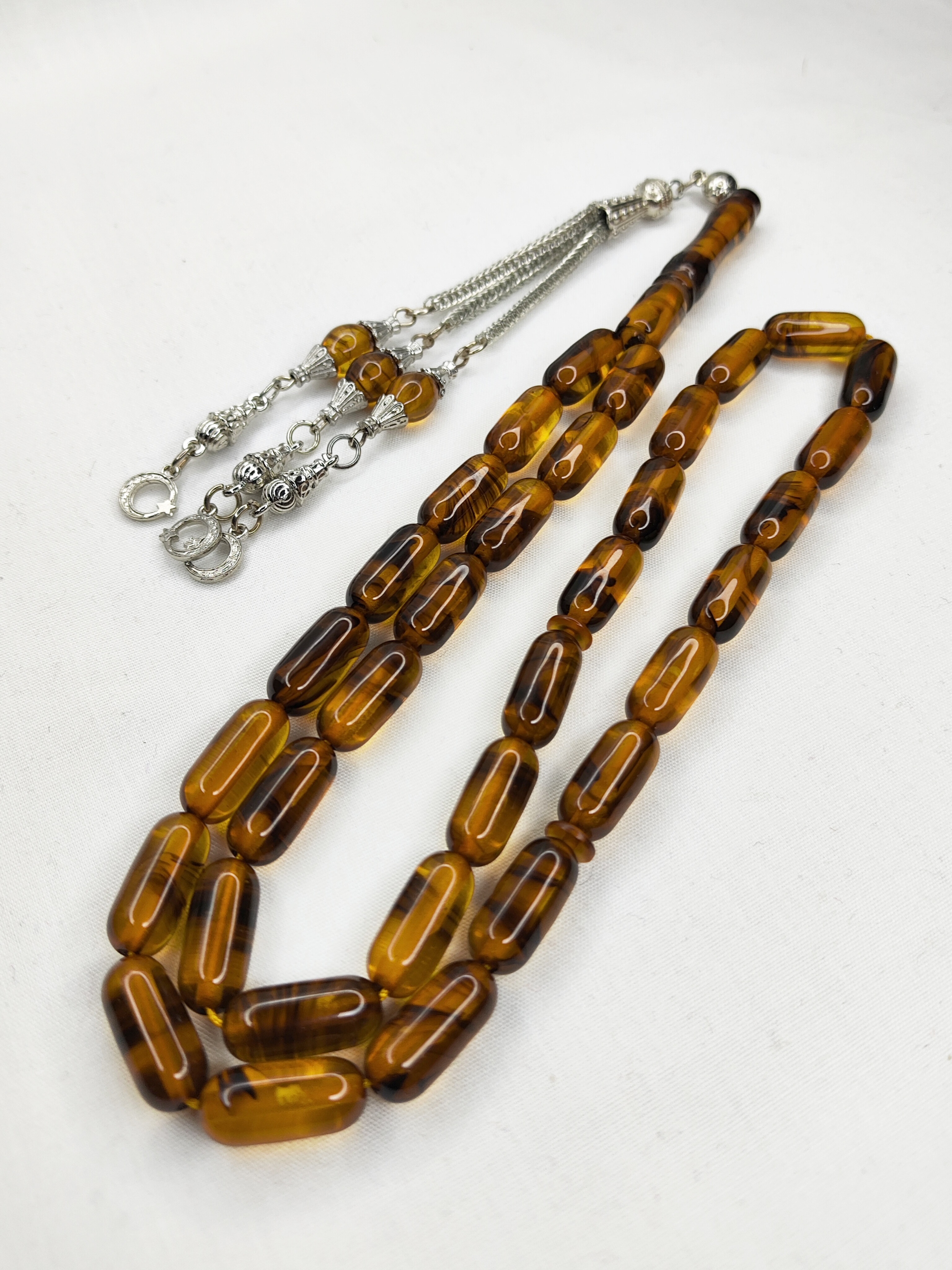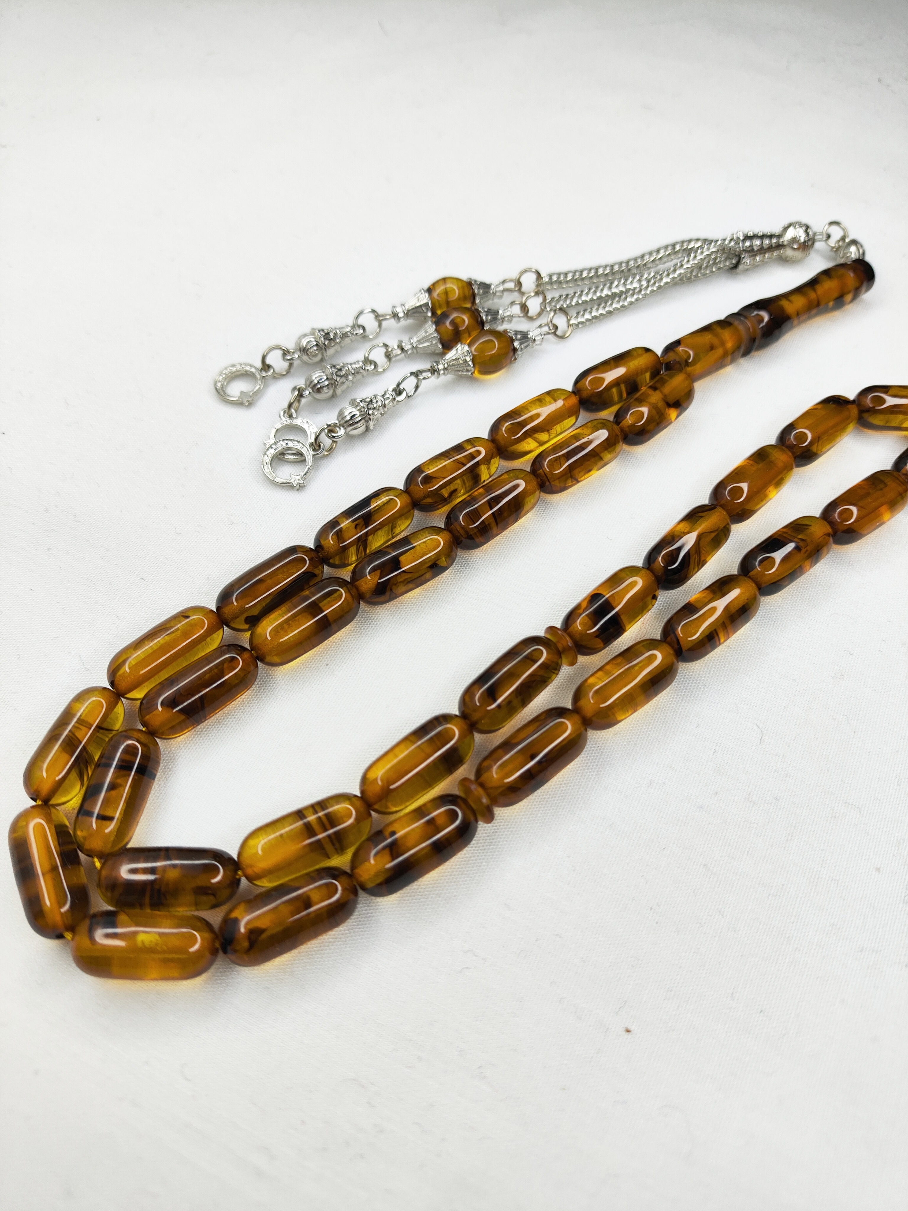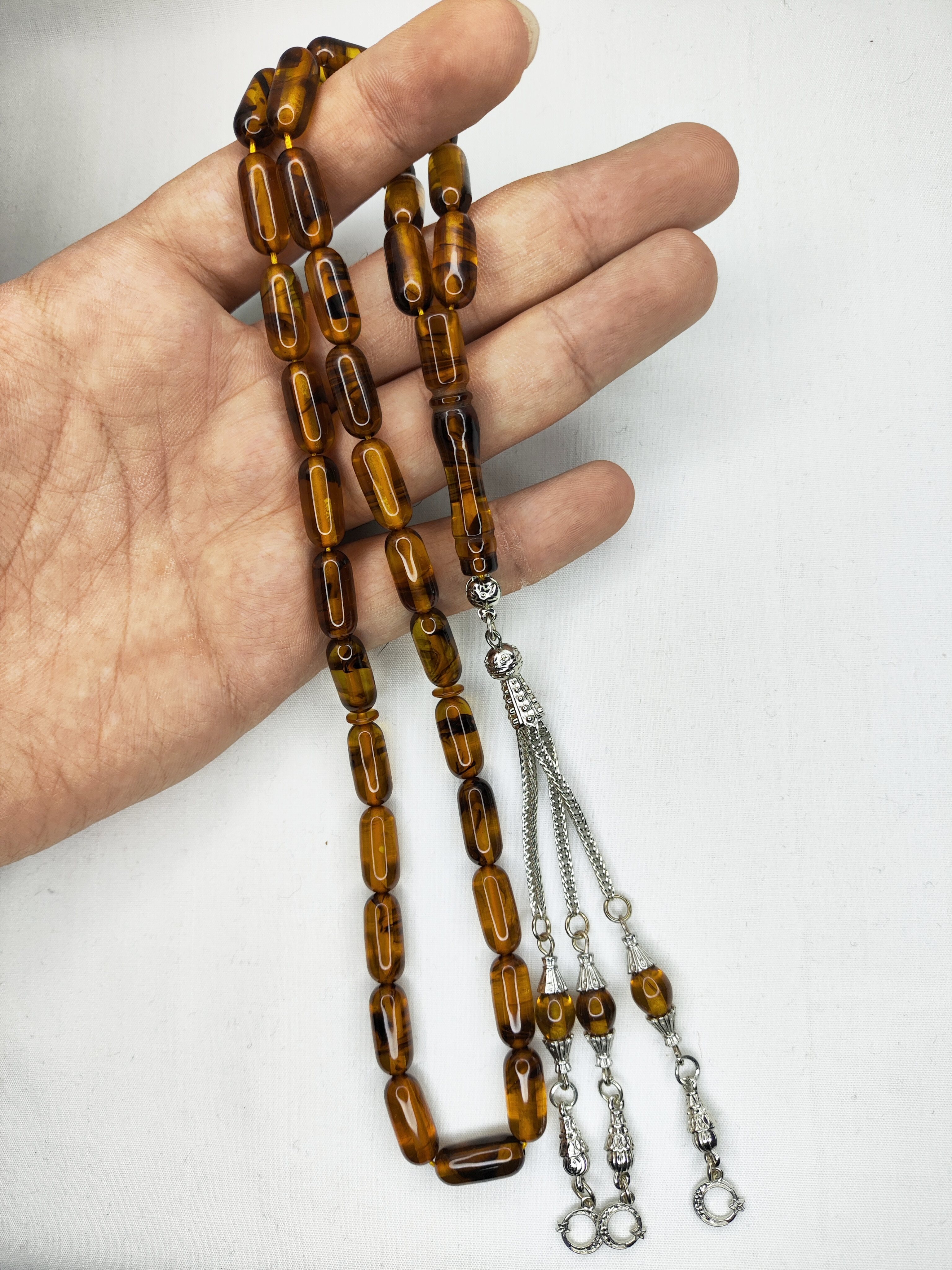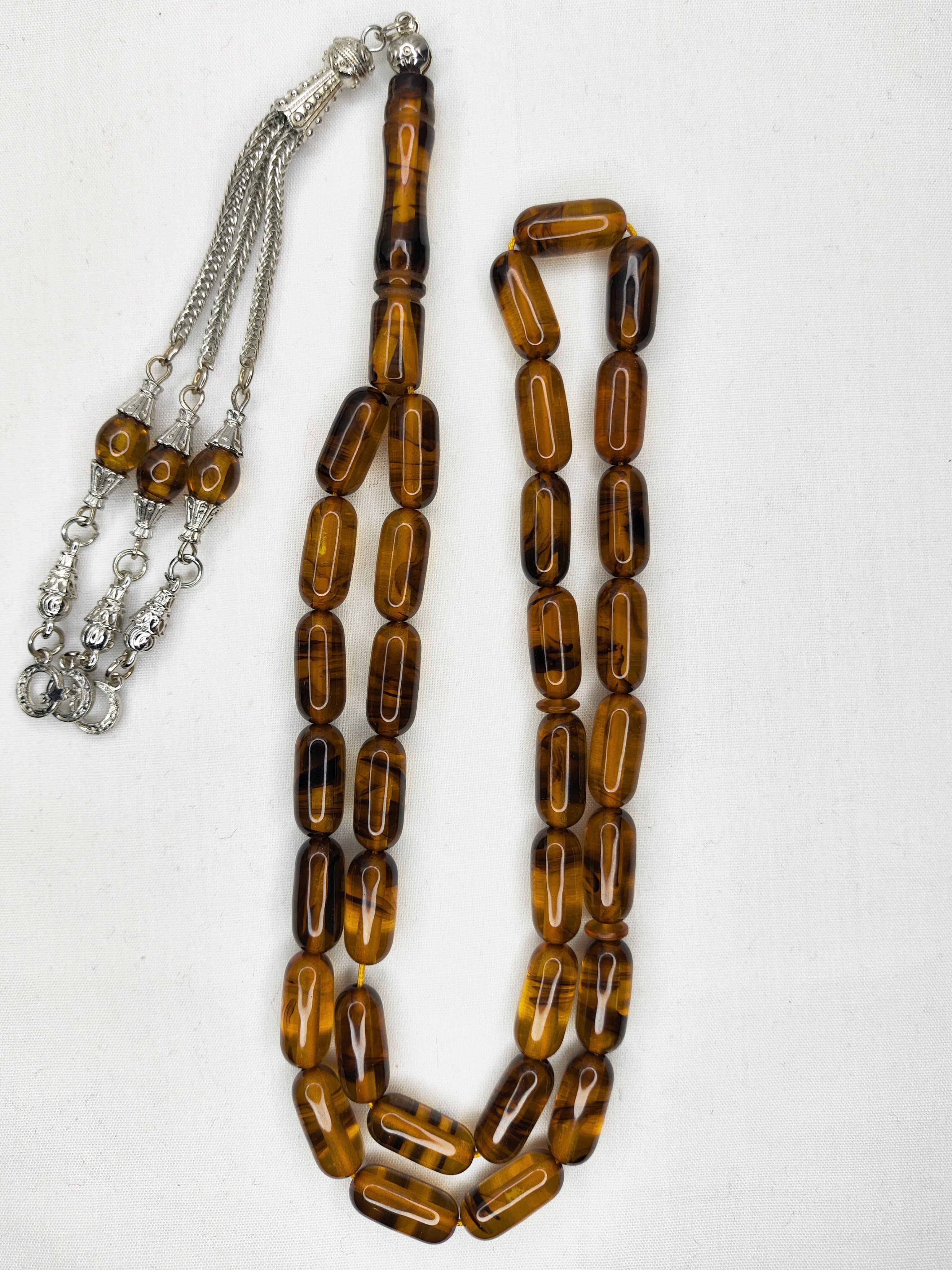 تسبیح کهربا رگه دار ابرو بادی 33عددی رنگ عسلی تراش کپسولی دقیق و خوشدست به همراه سر تسبیح فلزی شکیل تقدیمتون میشه 🌹
