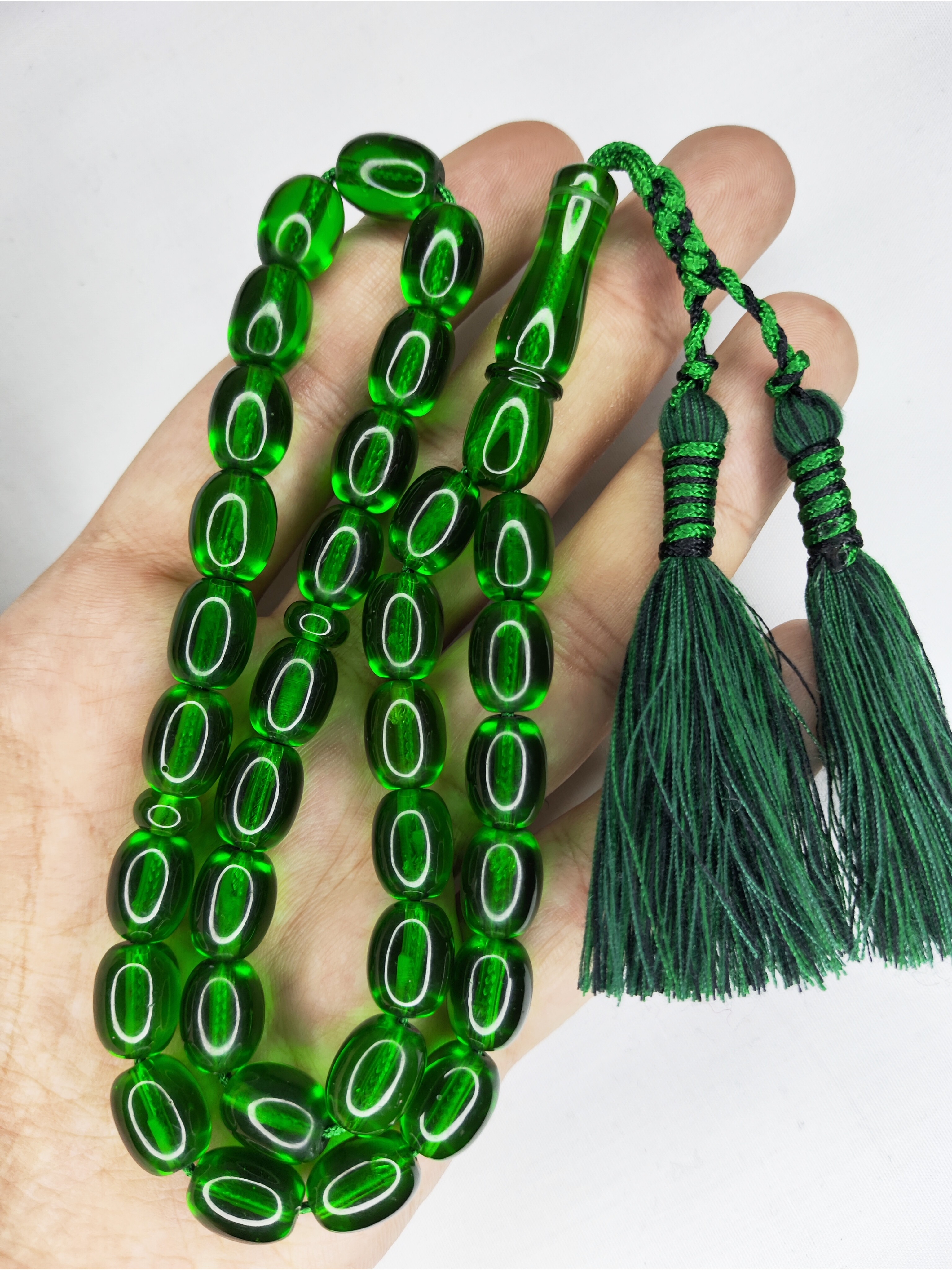 تسبیح سندلوس 33عددی سبز رنگ روشن تراش هلی خوشدست و زیبا همراه با بافت شکیل تقدیمتون میشه