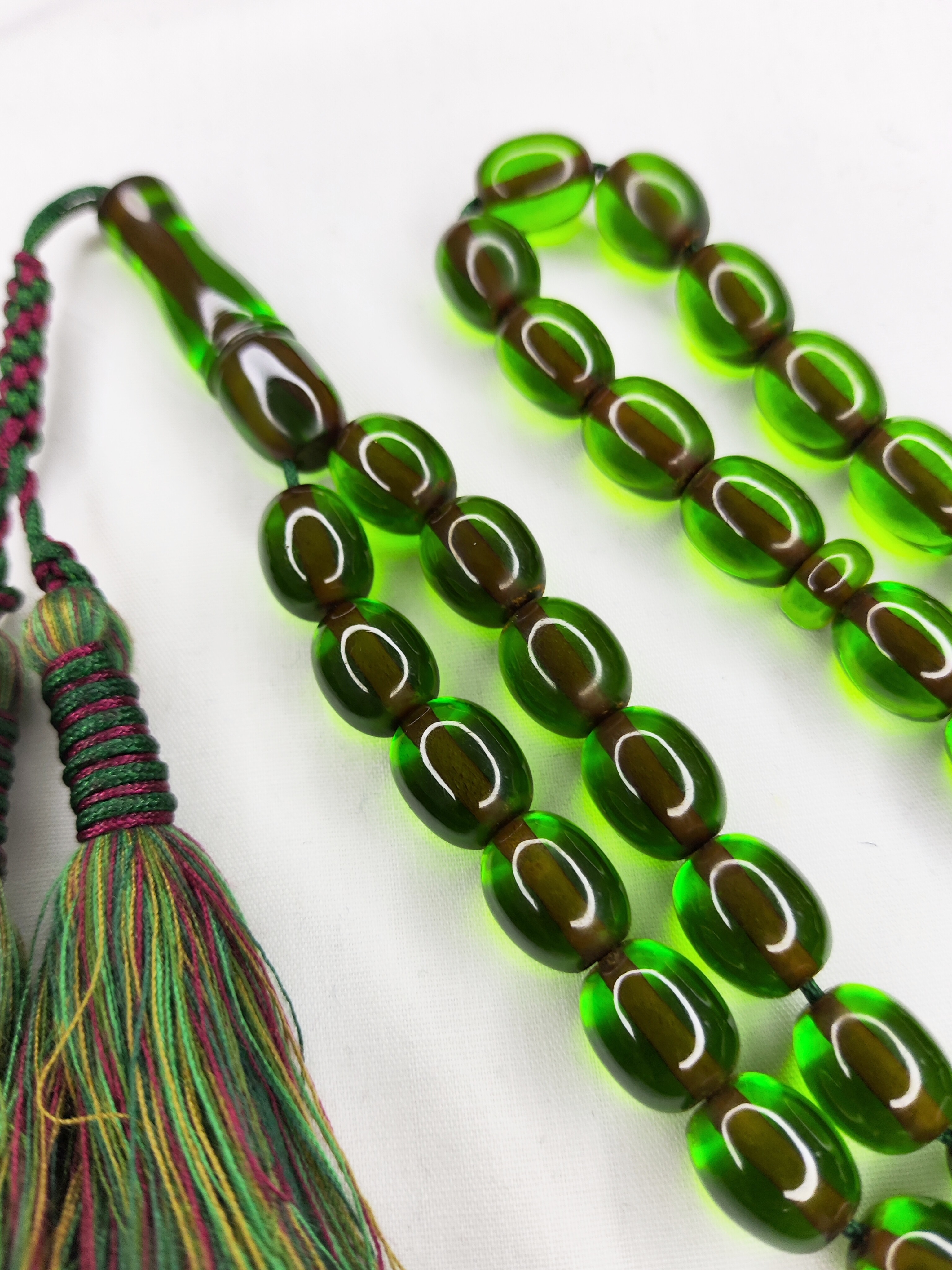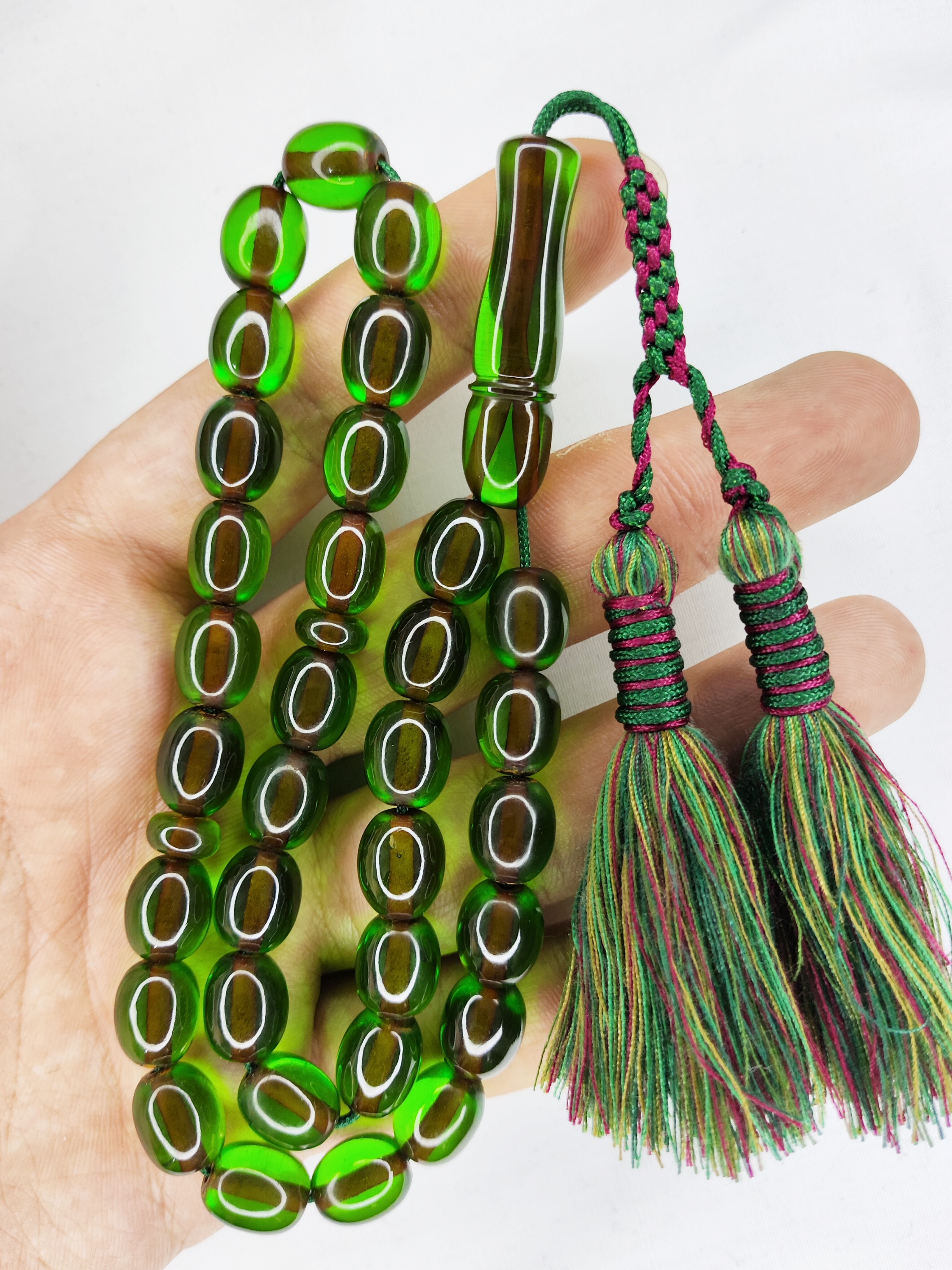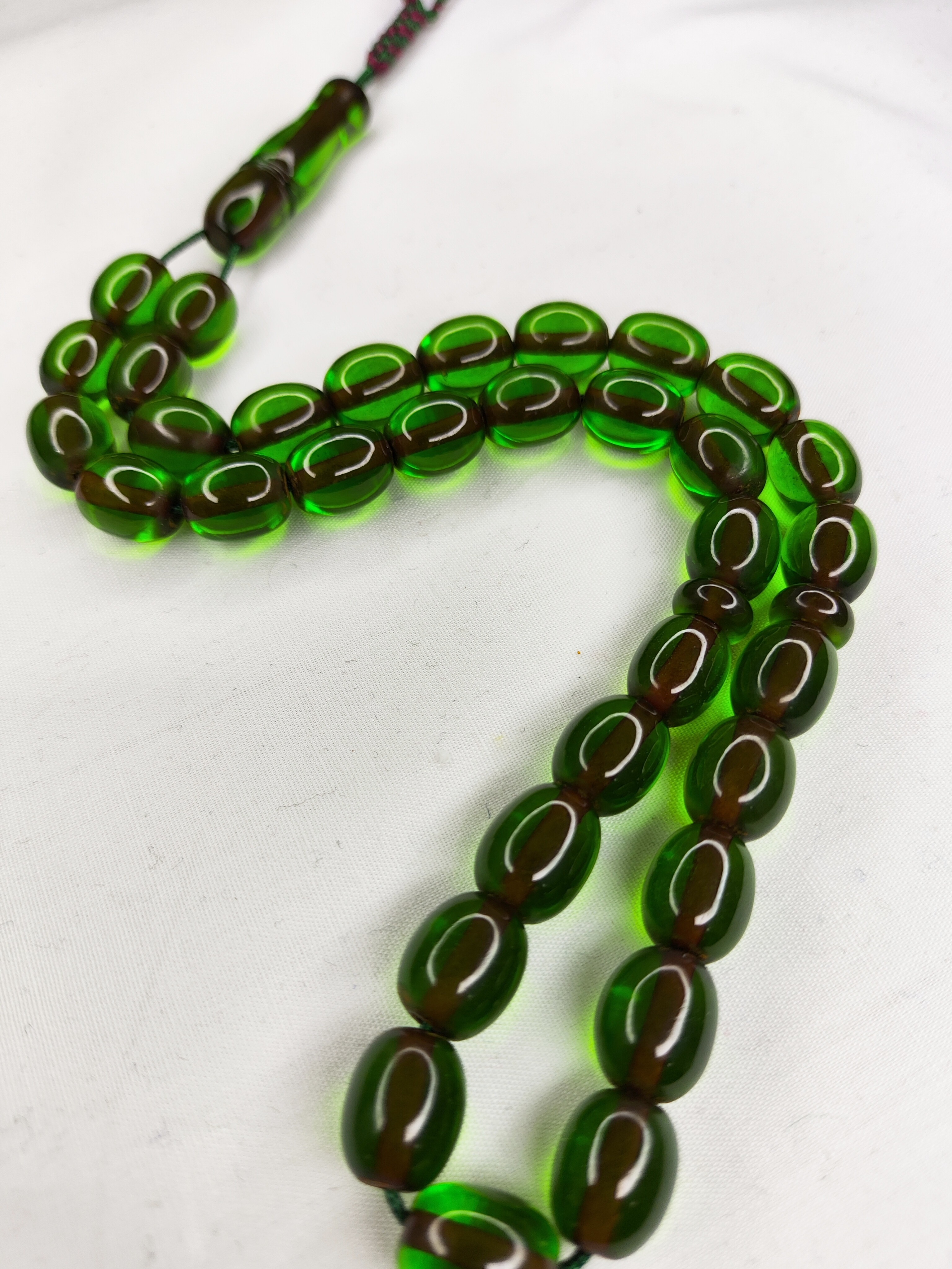 تسبیح سندلوس 33عددی تراش هلی خوشدست پاتین دار رنگ سبز خاص و شکیل