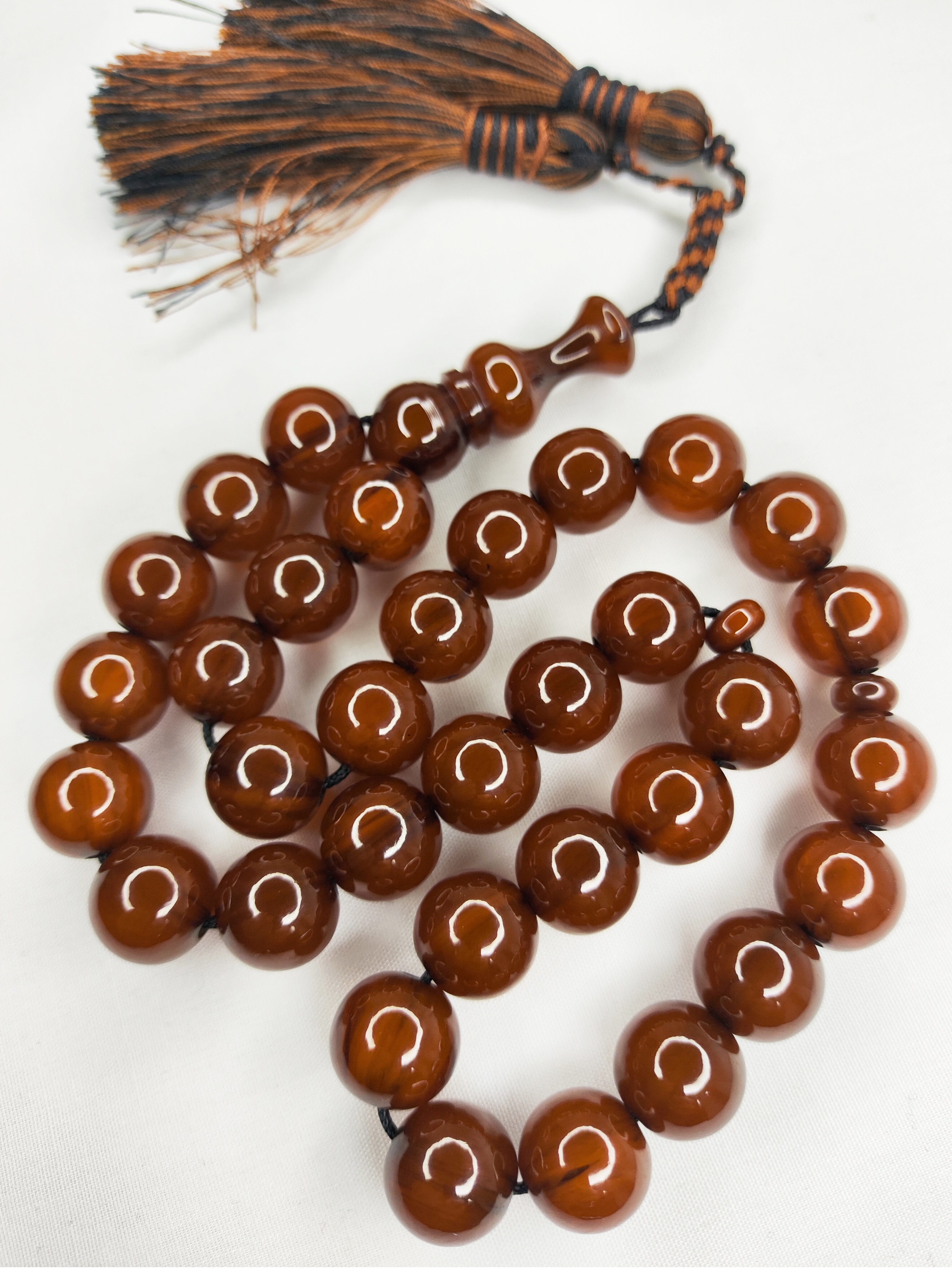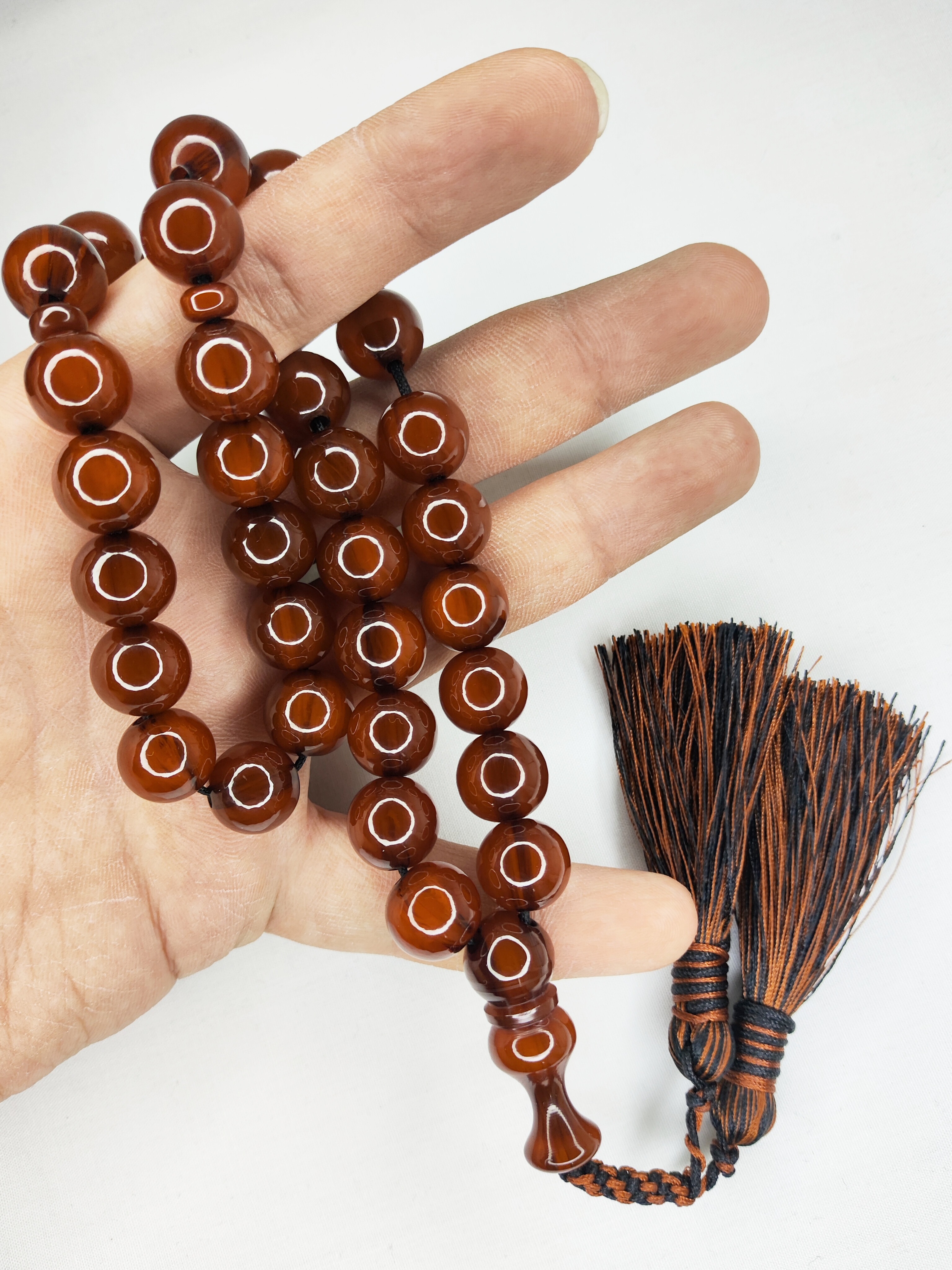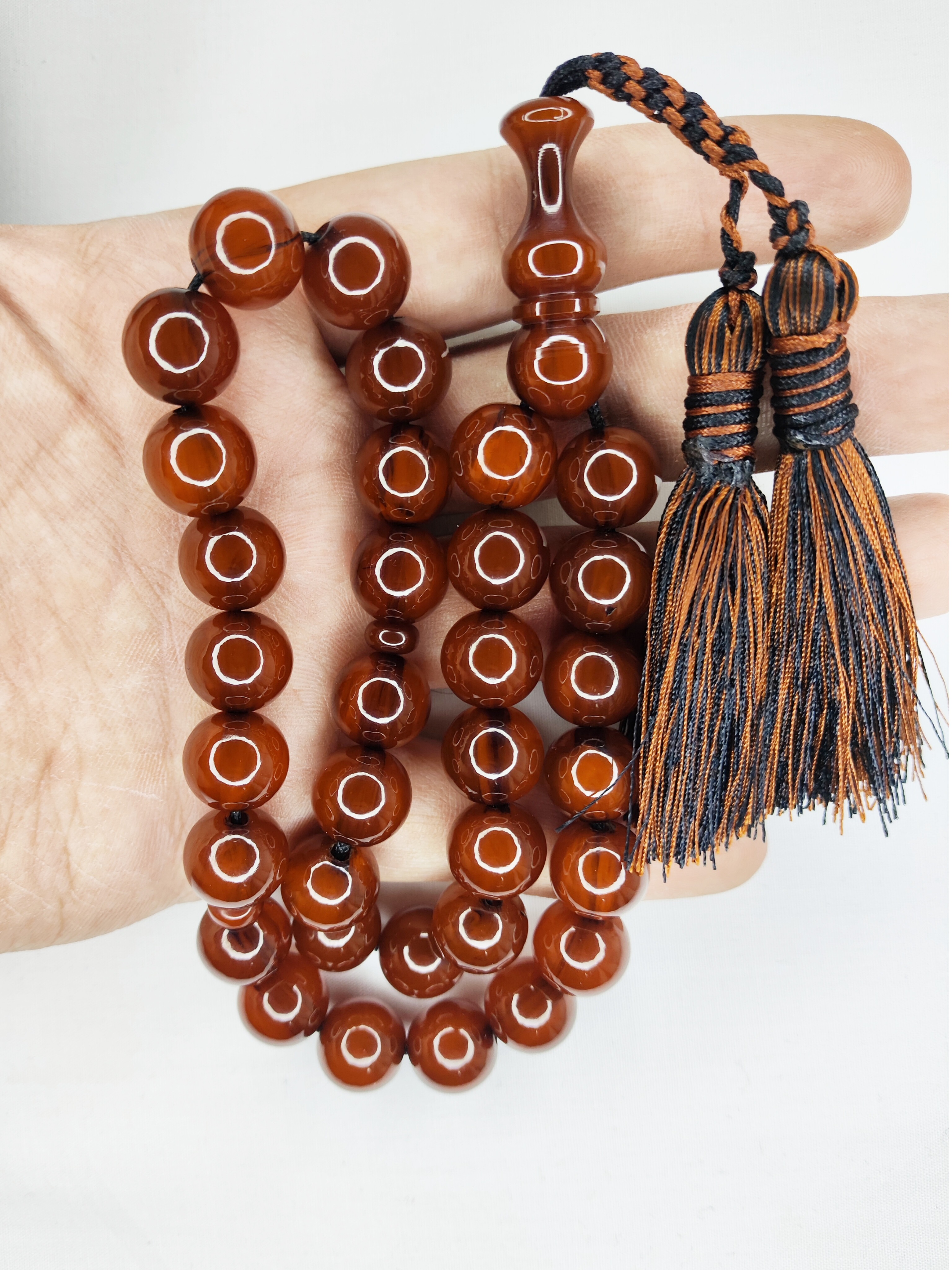 تسبیح کهربا رگه دار 33عددی رنگ قهوهای خاص و زیبا تراش گرد دقیق خوشدست و خوش صدا به همراه منگوله ابریشمی فاخرو شکیل