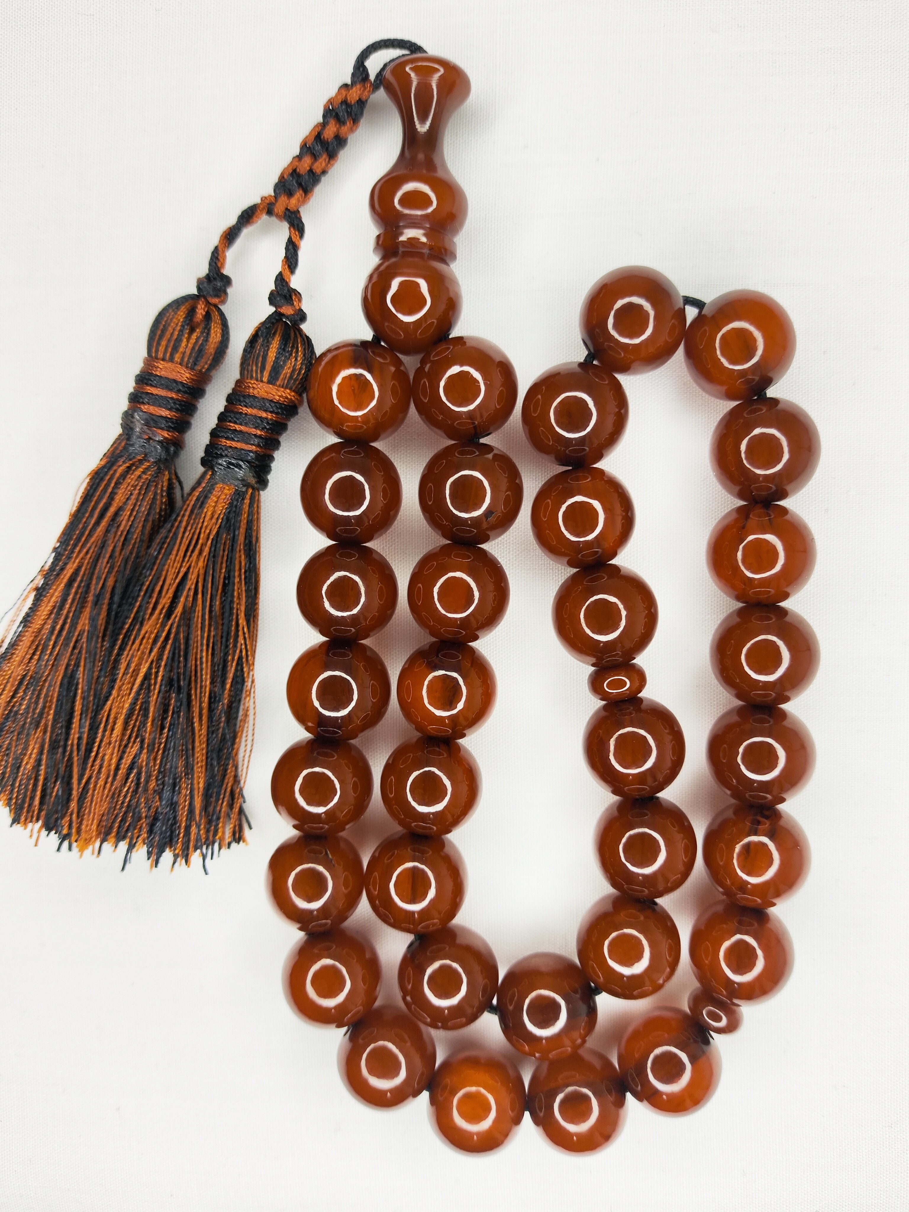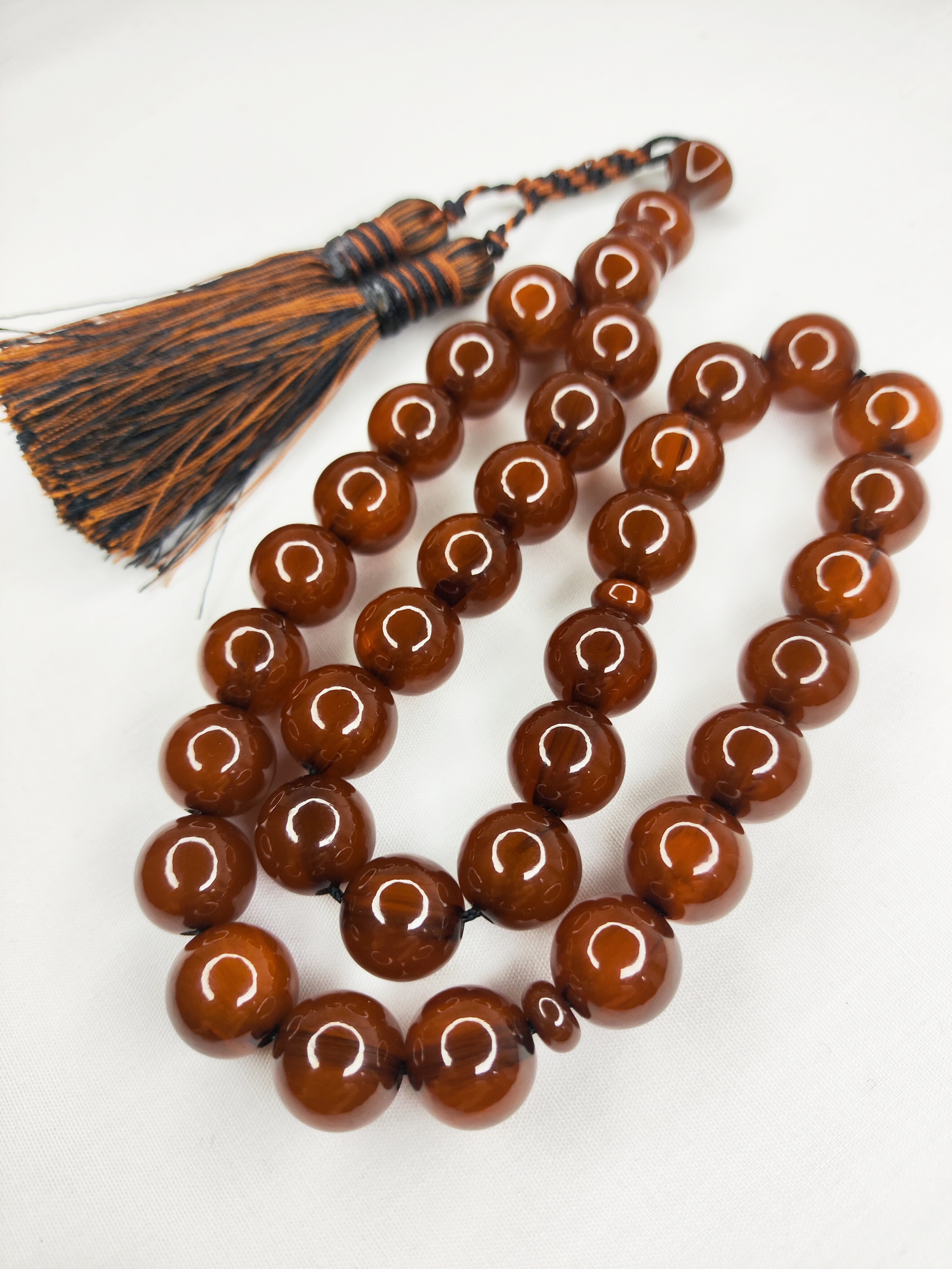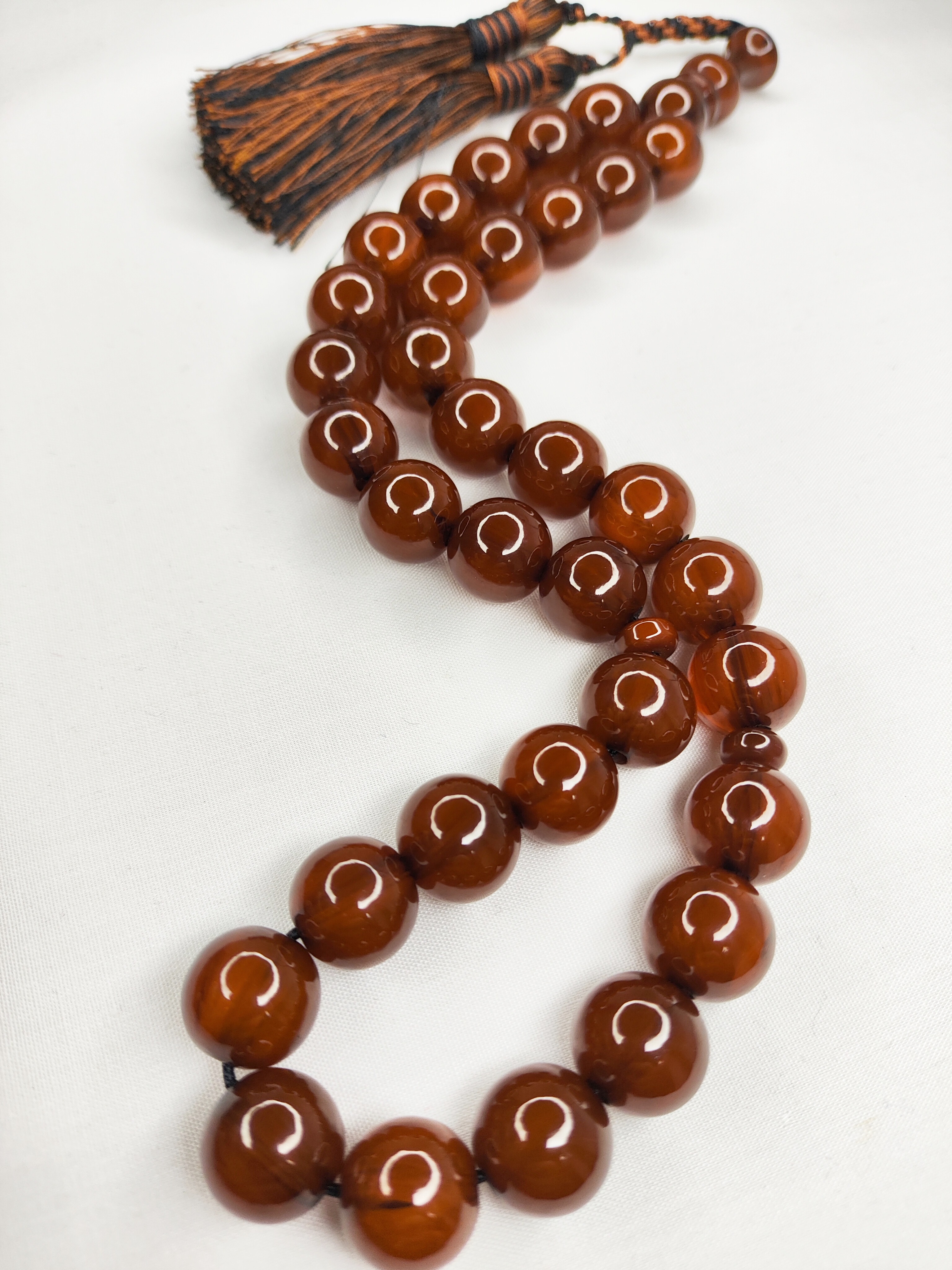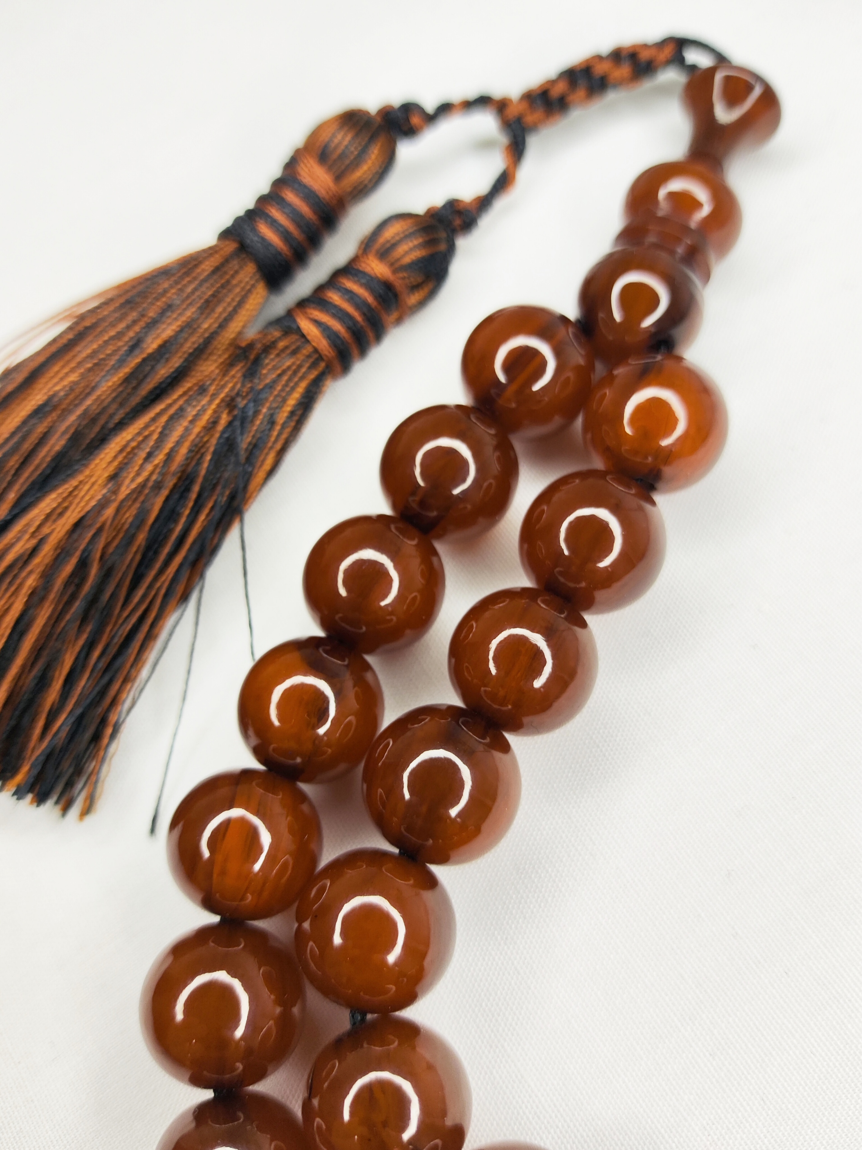 تسبیح کهربا رگه دار 33عددی رنگ قهوهای خاص و زیبا تراش گرد دقیق خوشدست و خوش صدا به همراه منگوله ابریشمی فاخرو شکیل