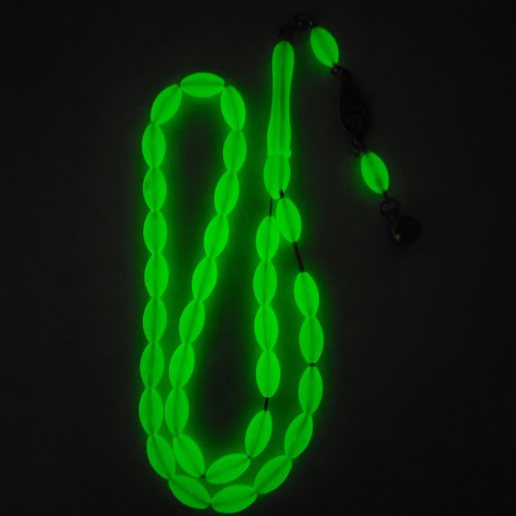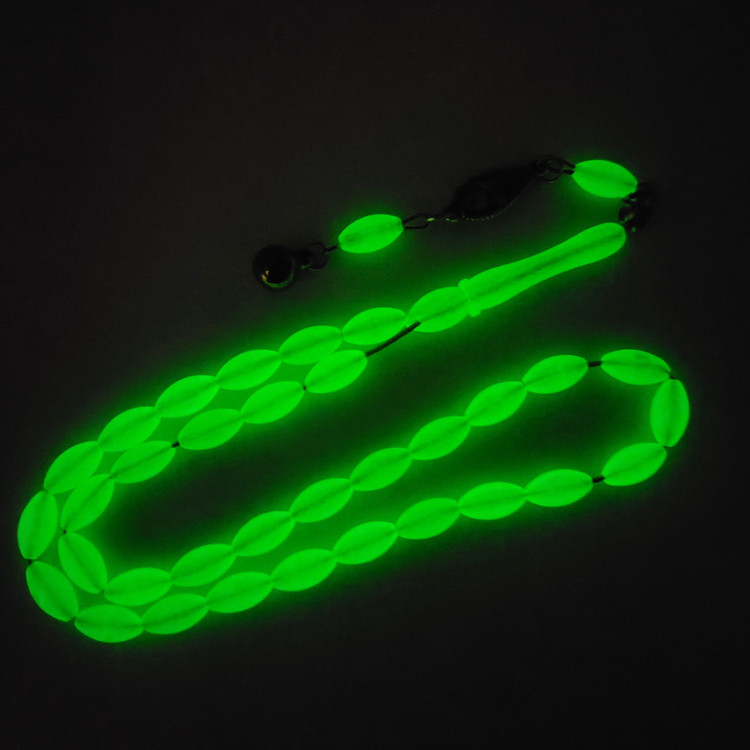 تسبیح شب نما (فسفر) 33عددی تراش هلی خوشدست و زیبا همراه با سر تسبیح استیل شکیل ، این تسبیح در روز و روشنایی نور را جذب کرده و در شب و تاریکی از خود به رنگ سبز زیبا بازتاب می دهد.