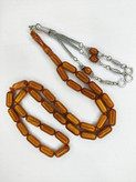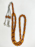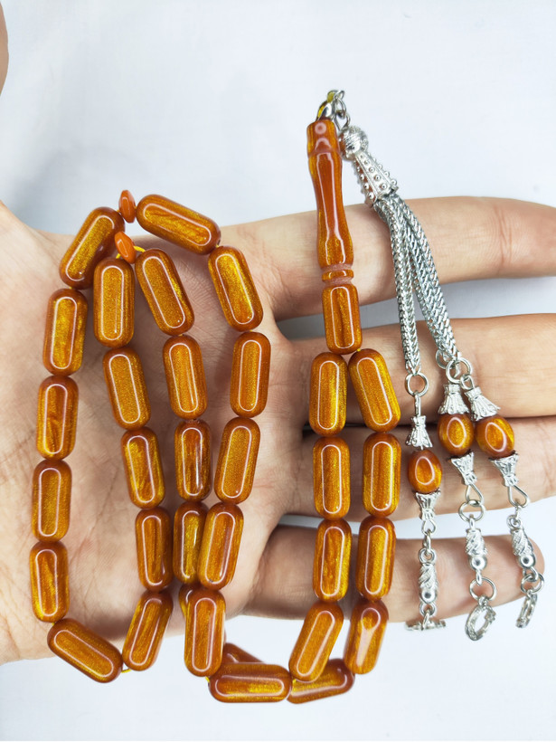 تسبیح کهربا زرافشان 33عددی تراش کپسولی خوشدست و زیبا رنگ عسلی همراه با سر تسبیح استیل شکیل