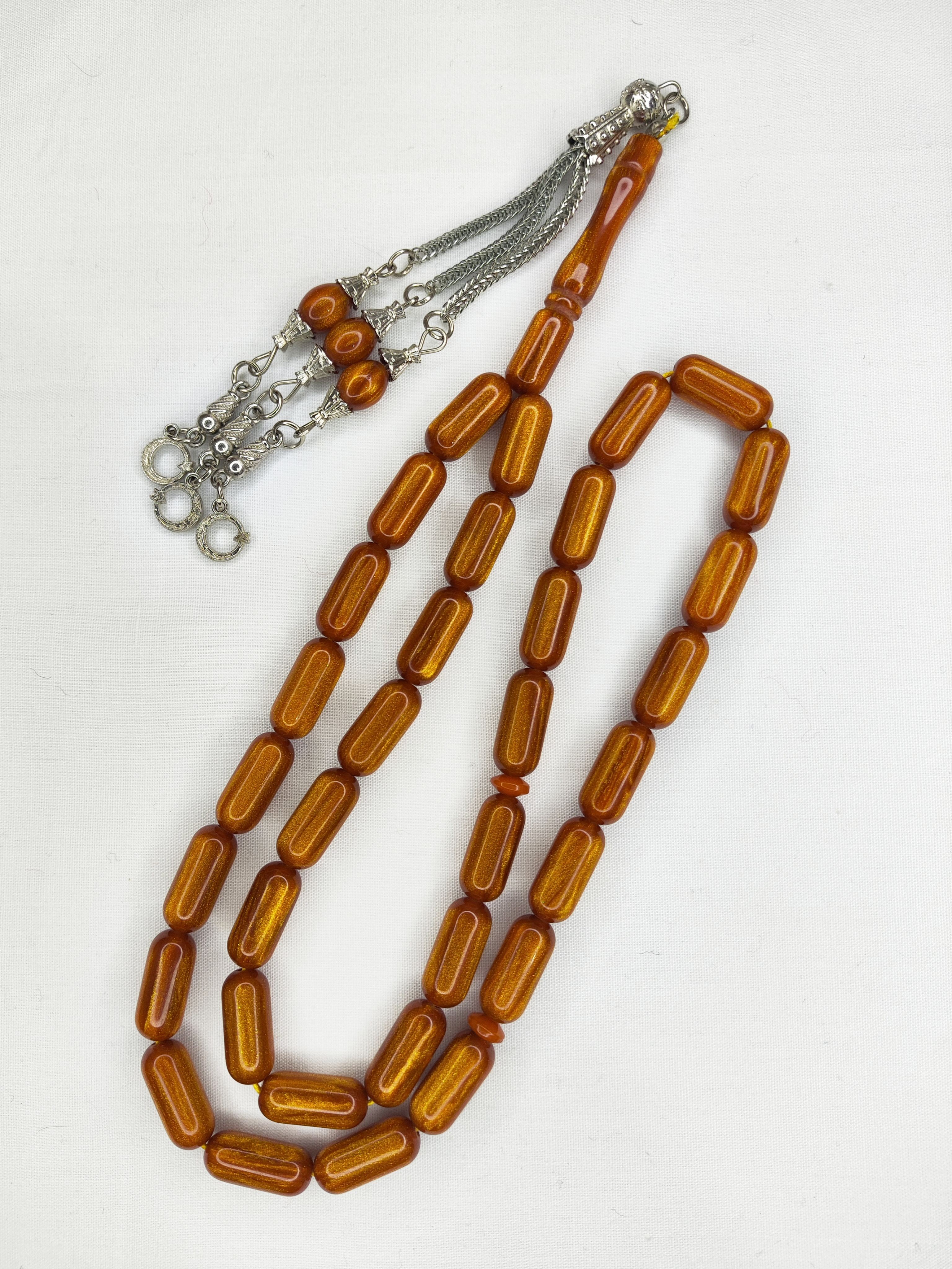 تسبیح کهربا زرافشان 33عددی تراش کپسولی خوشدست و زیبا رنگ عسلی همراه با سر تسبیح استیل شکیل