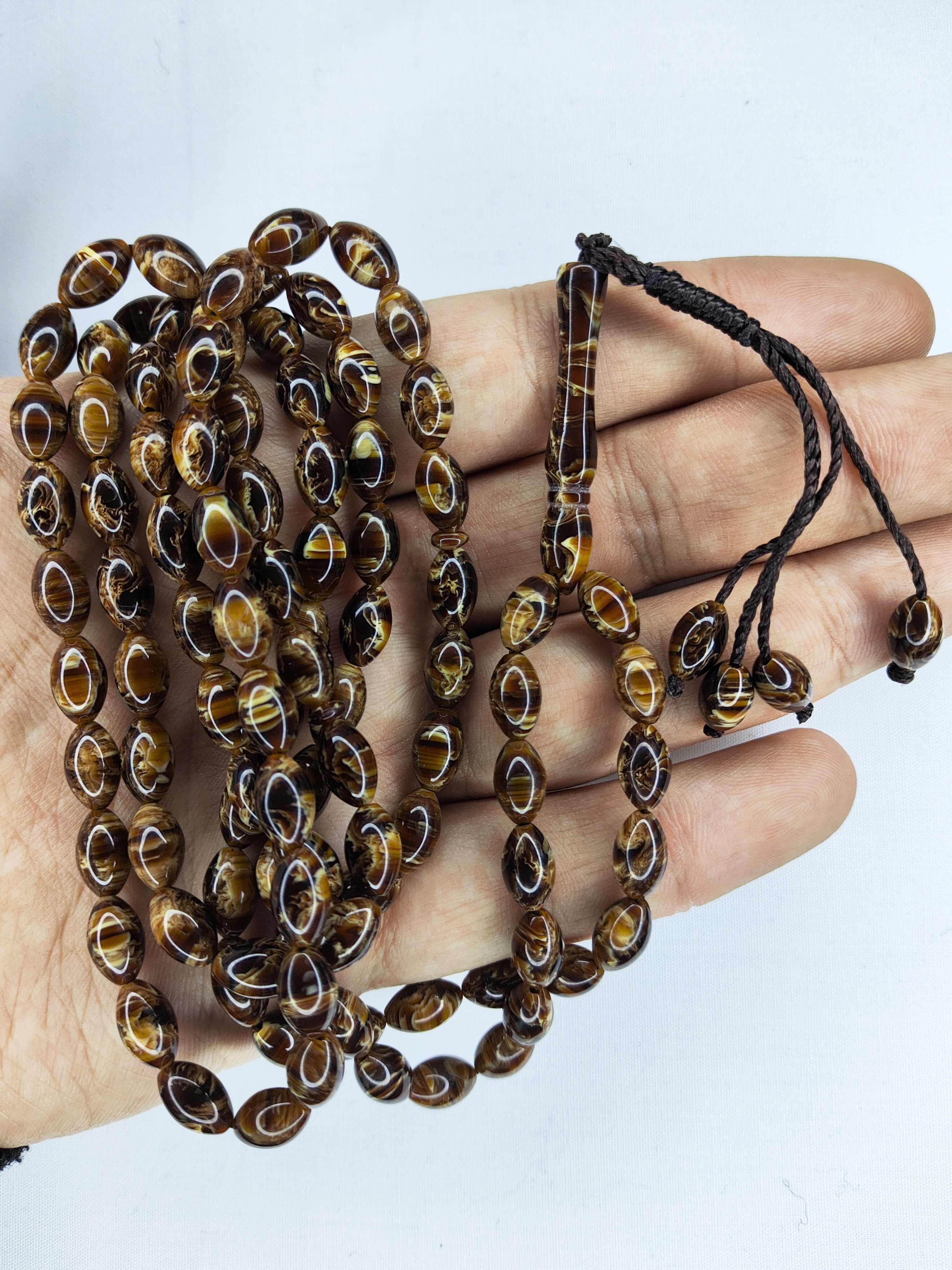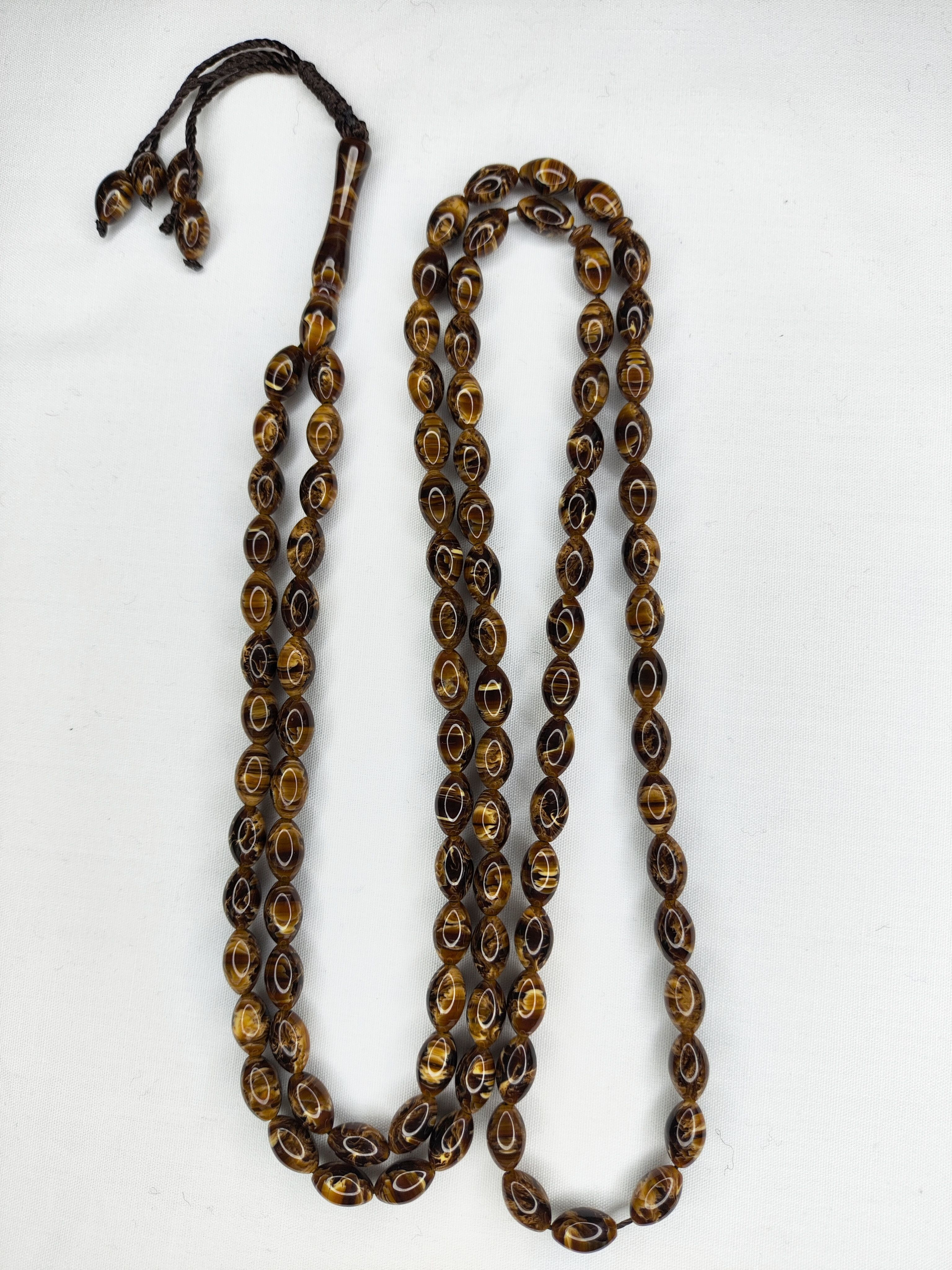 تسبیح کهربا رگه دار شکلاتی 101 عددی تراش هلی خوشدست