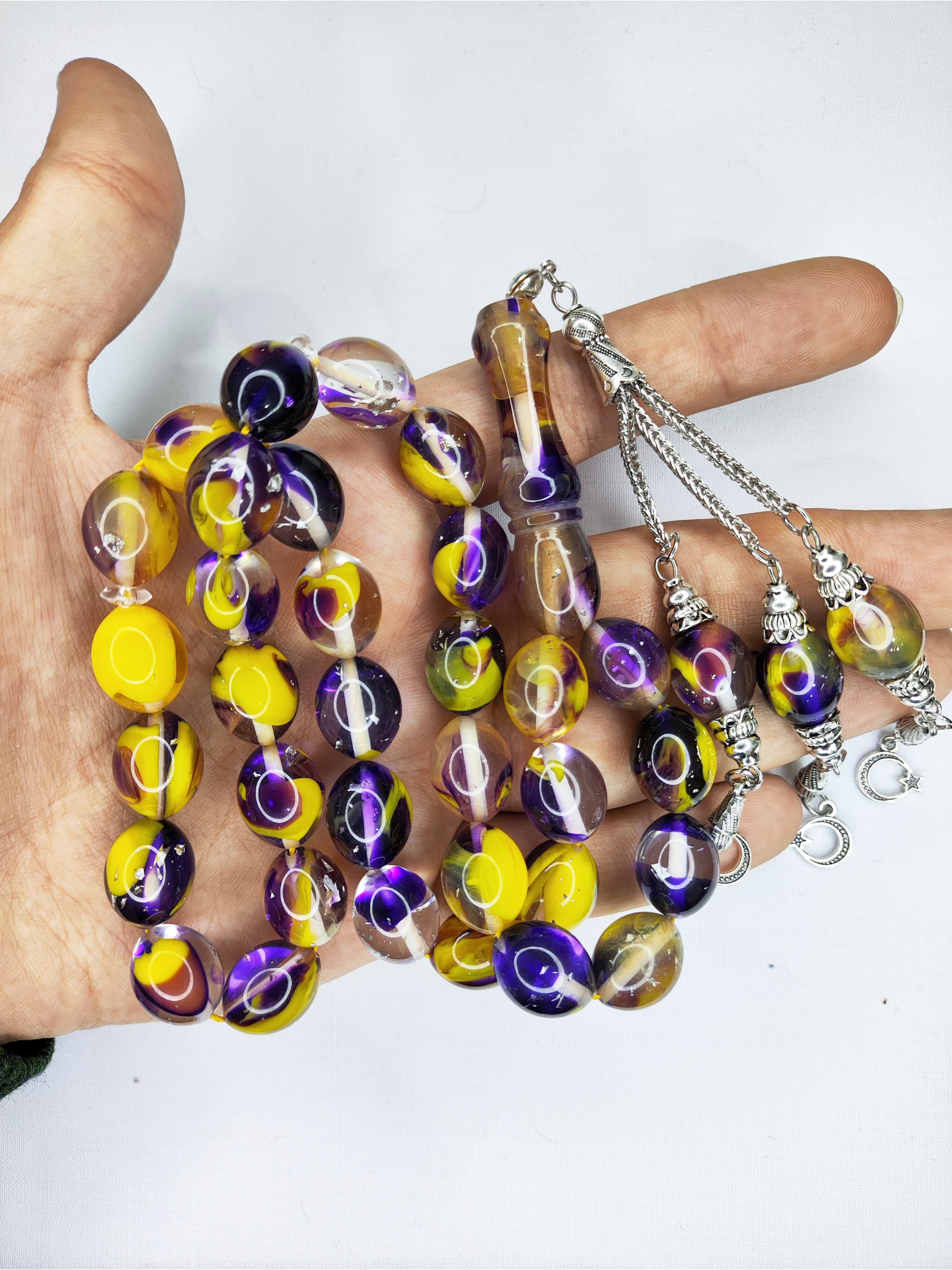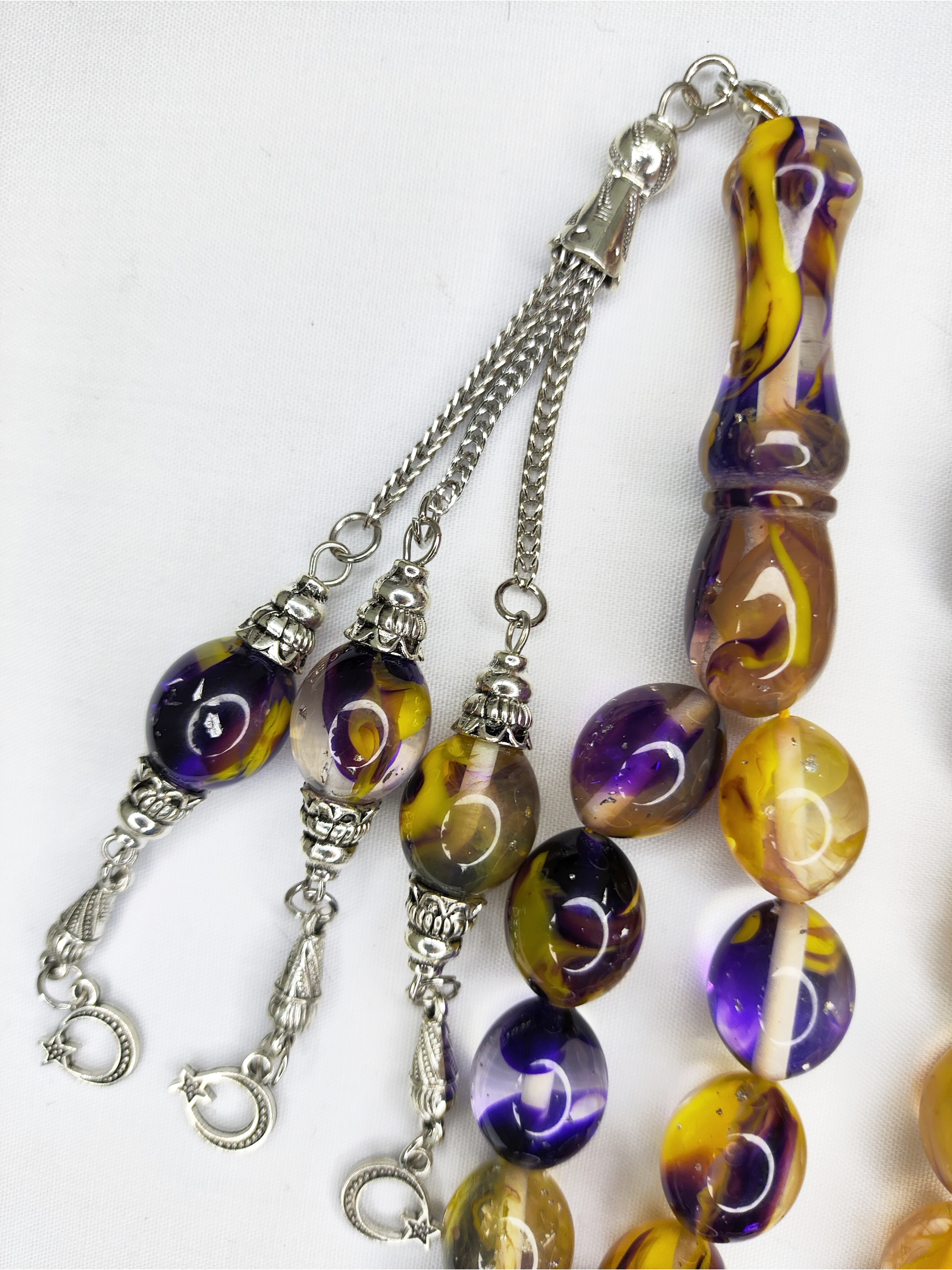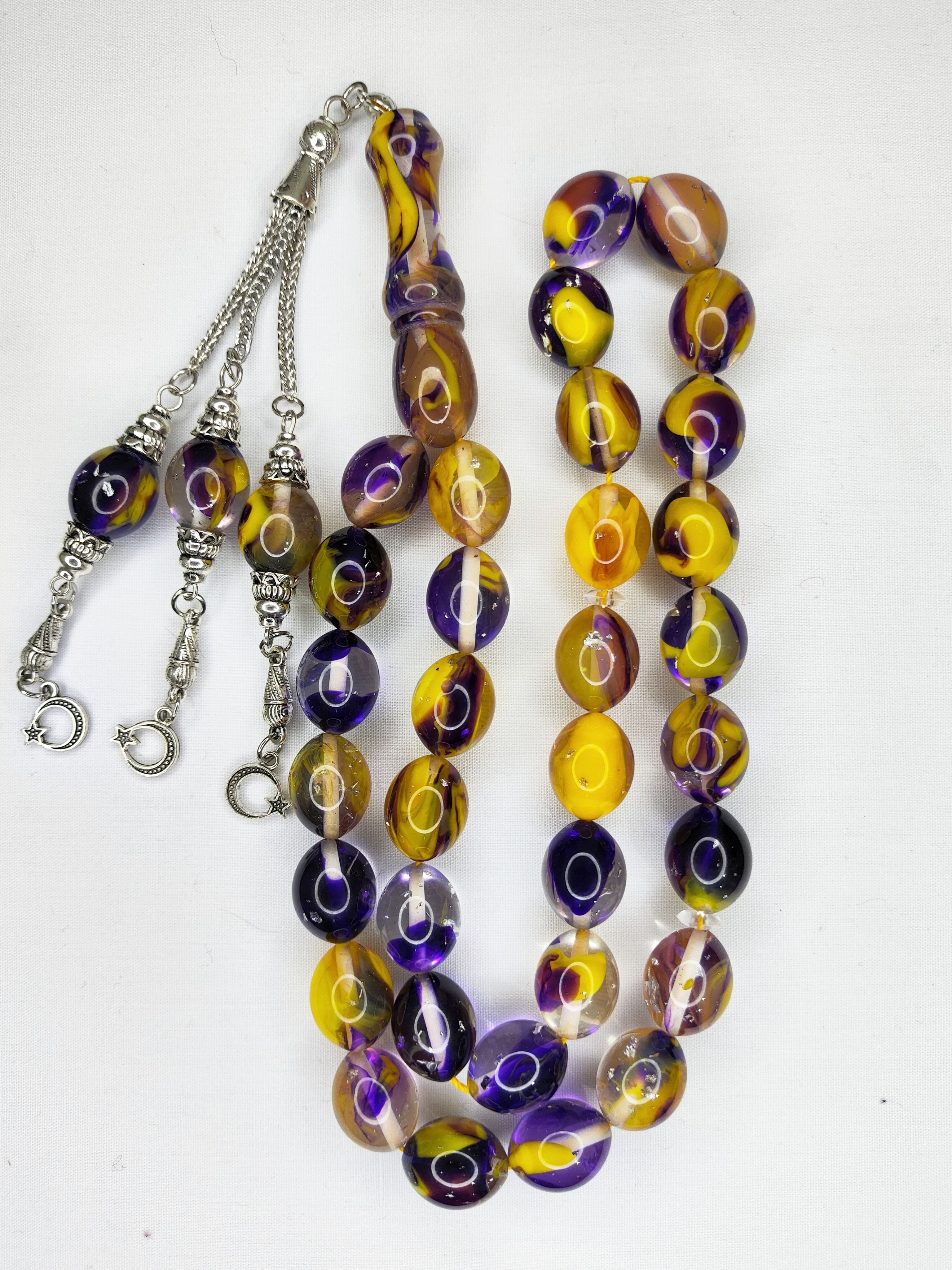 تسبیح کهربا کهکشانی 33عددی با ورقه های نقره ای و سرتسبیح استیل شکیل