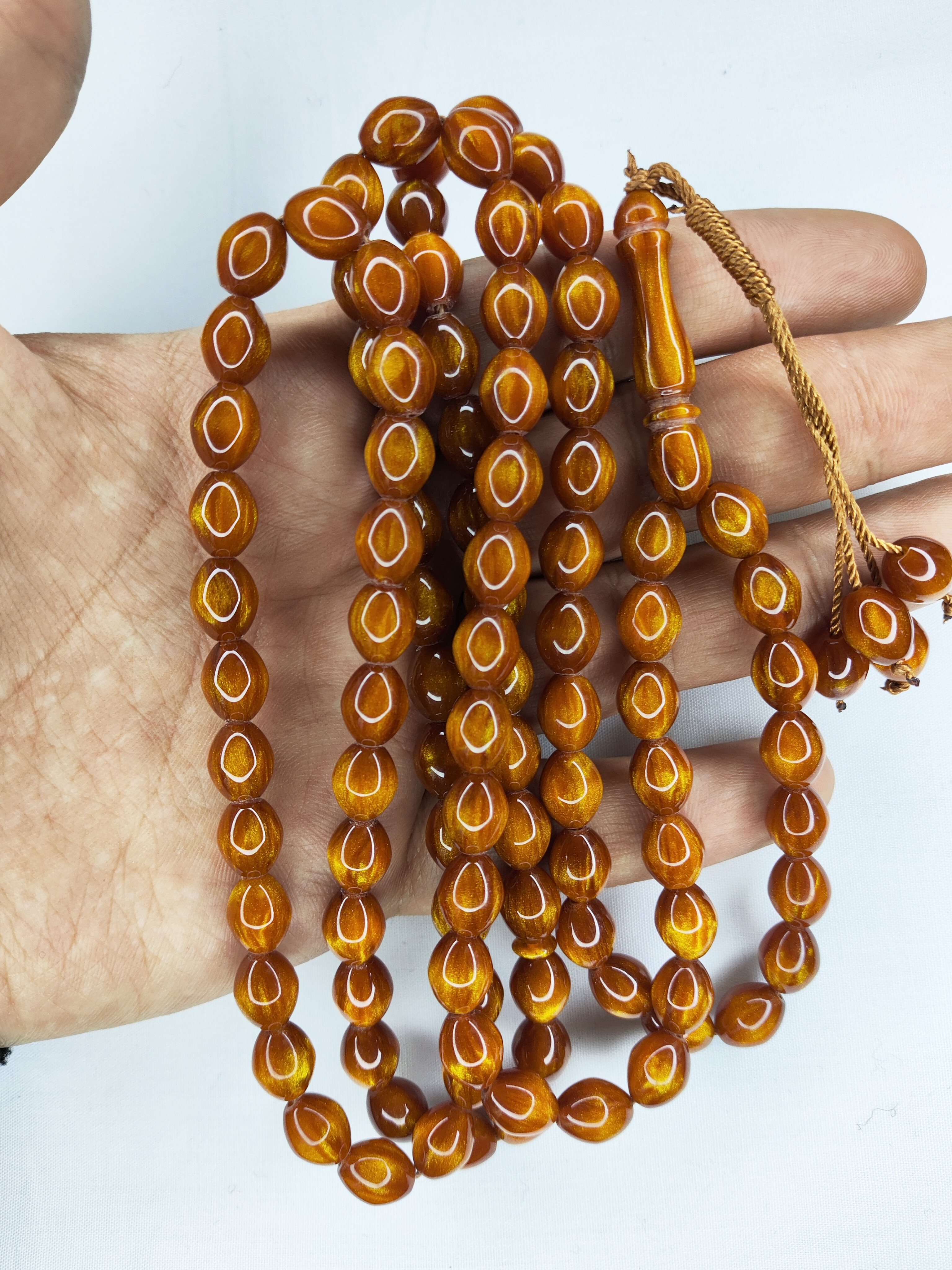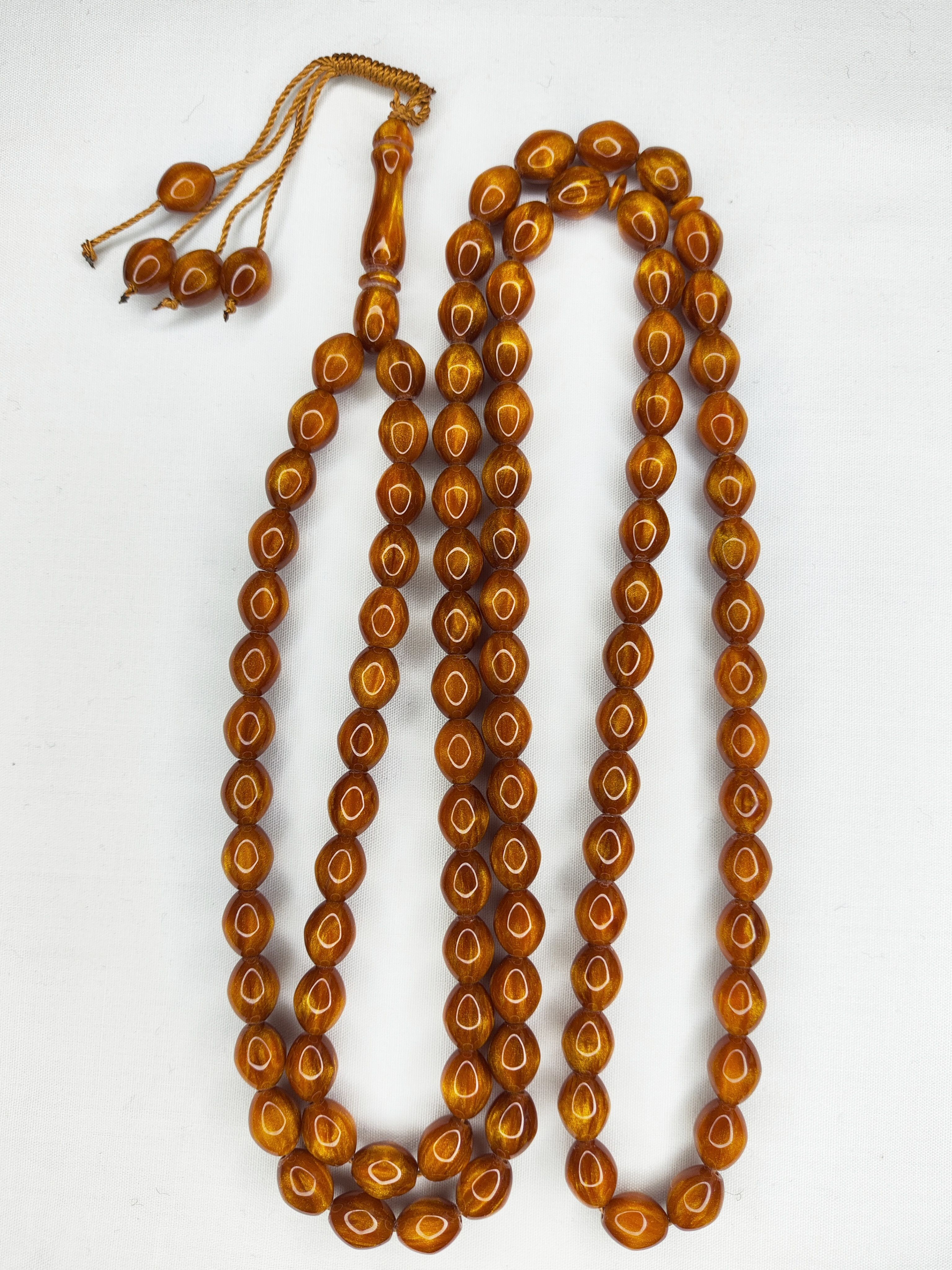 تسبیح کهربا زرافشان 101 عددی رنگ عسلی خوشدست همراه 4دانه اضافی