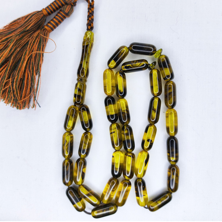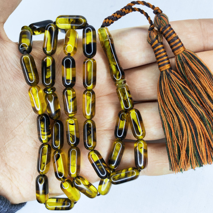 تسبیح کهربای 33 عددی تراش کپسولی دقیق و منظم ، رنگ سبز وسیاه ابرو بادی زیبا و تک این تسبیح با توجه به نوع تراش که دانه های آن کشیده هستند بسیار خوشدسته و حس آرامش میده.