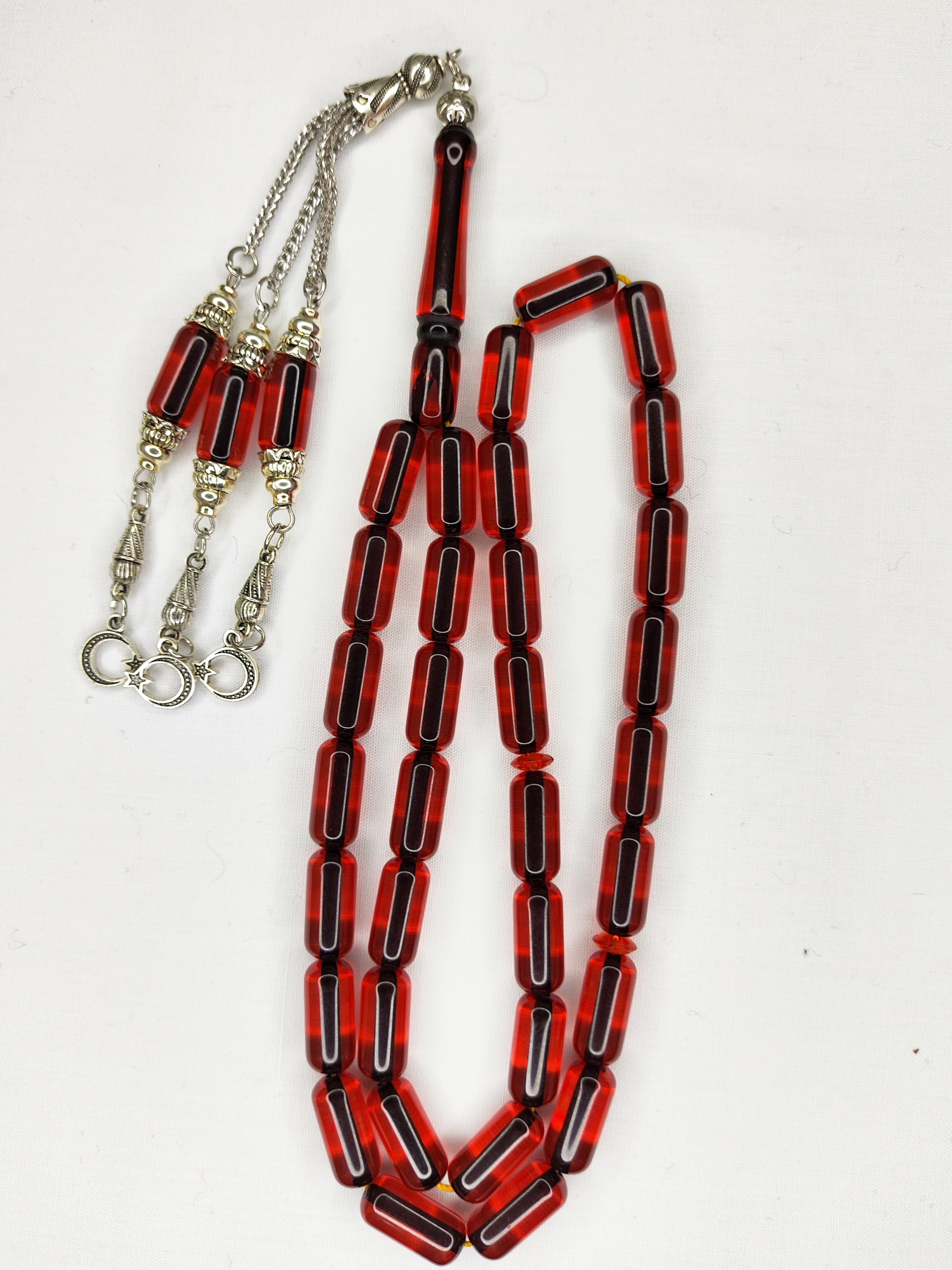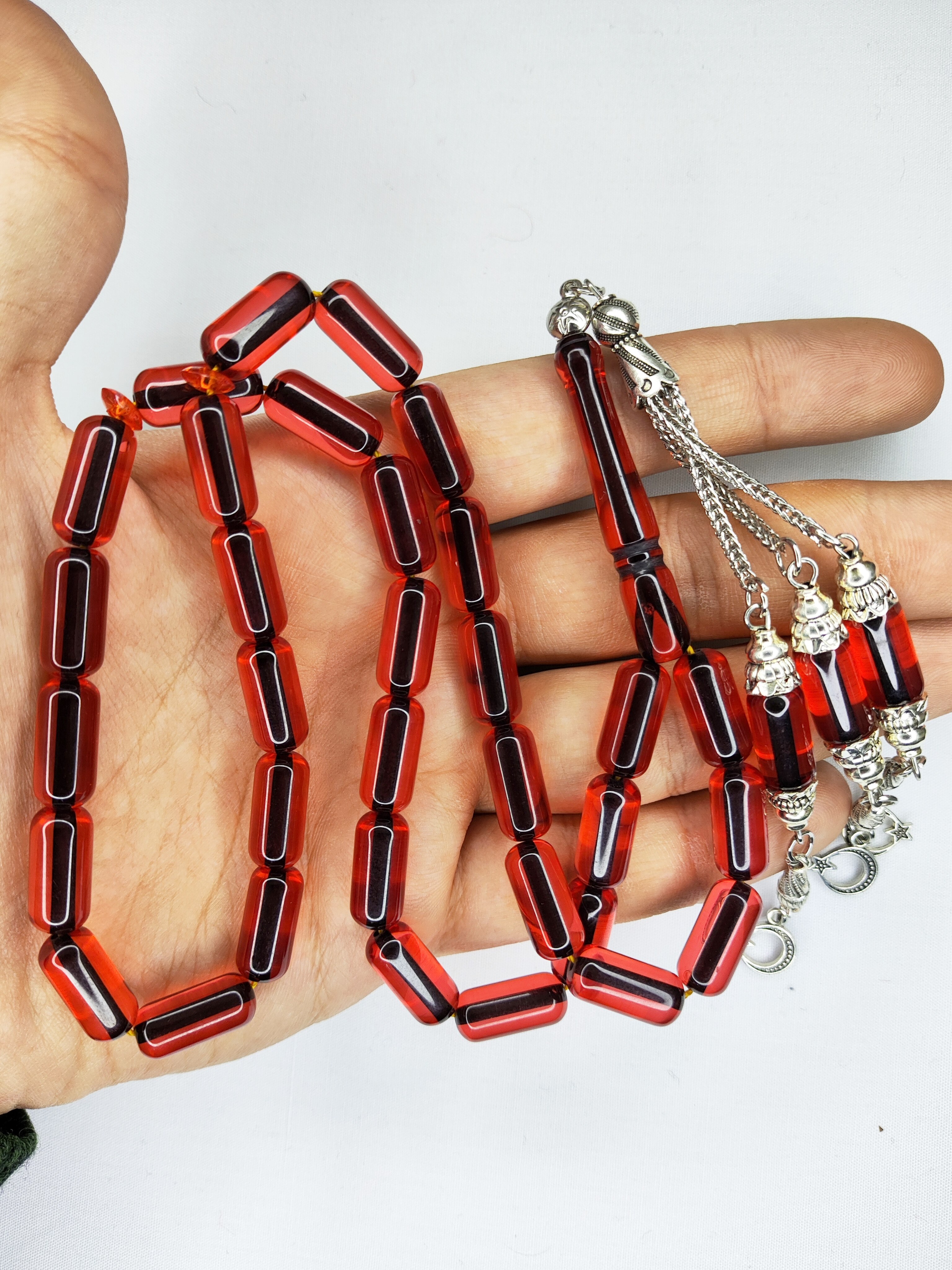 تسبیح کهربا 33 عددی کلکسیونی رنگ قرمز و سیاه همراه سر تسبیح استیل فاخر و زیبا