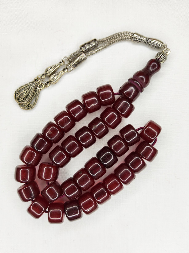 تسبیح سندلوس 33عددی تراش کسمه (قیچی بر) دقیق رنگ قرمز تیره زیبا همراه سرتسبیح استیل