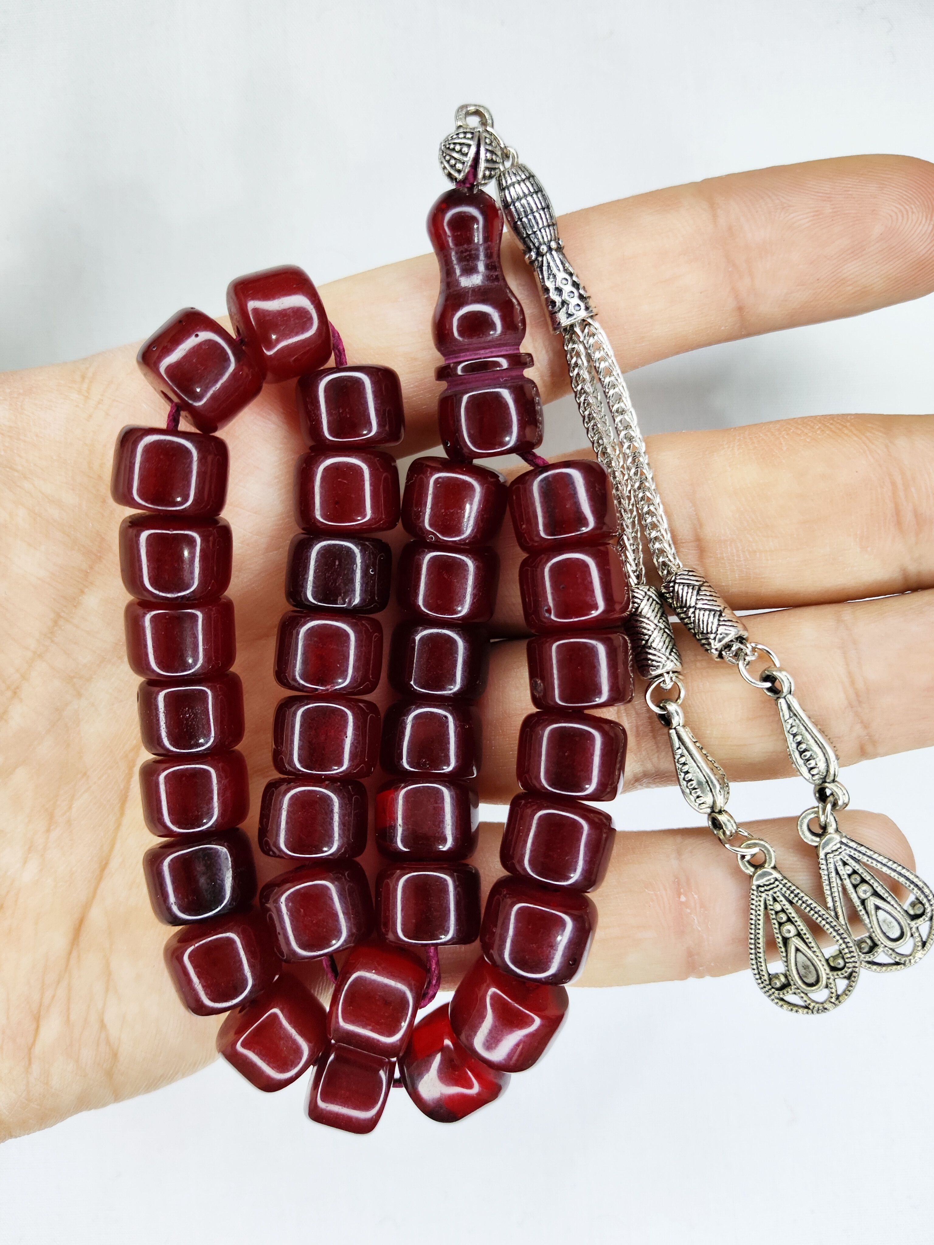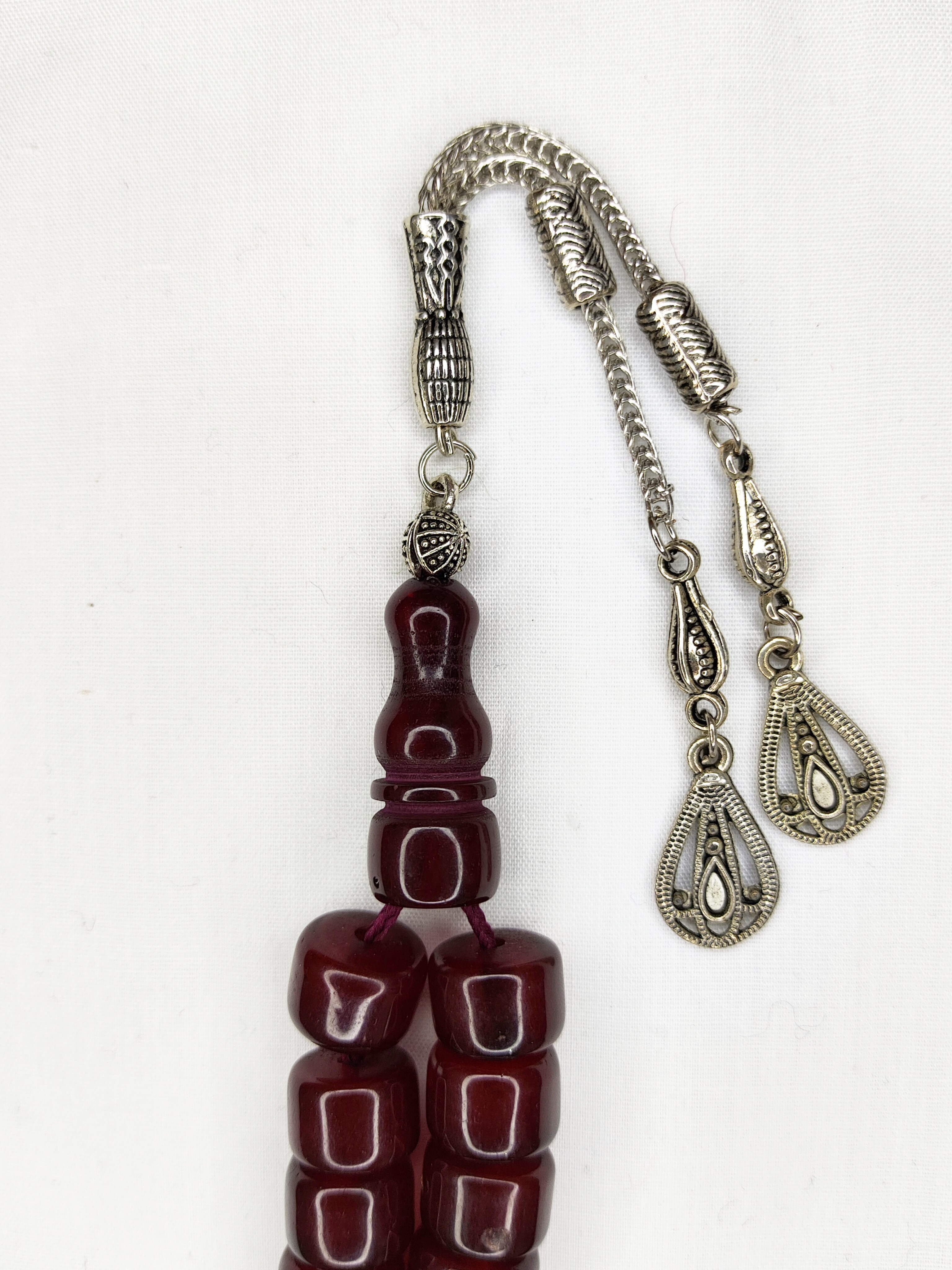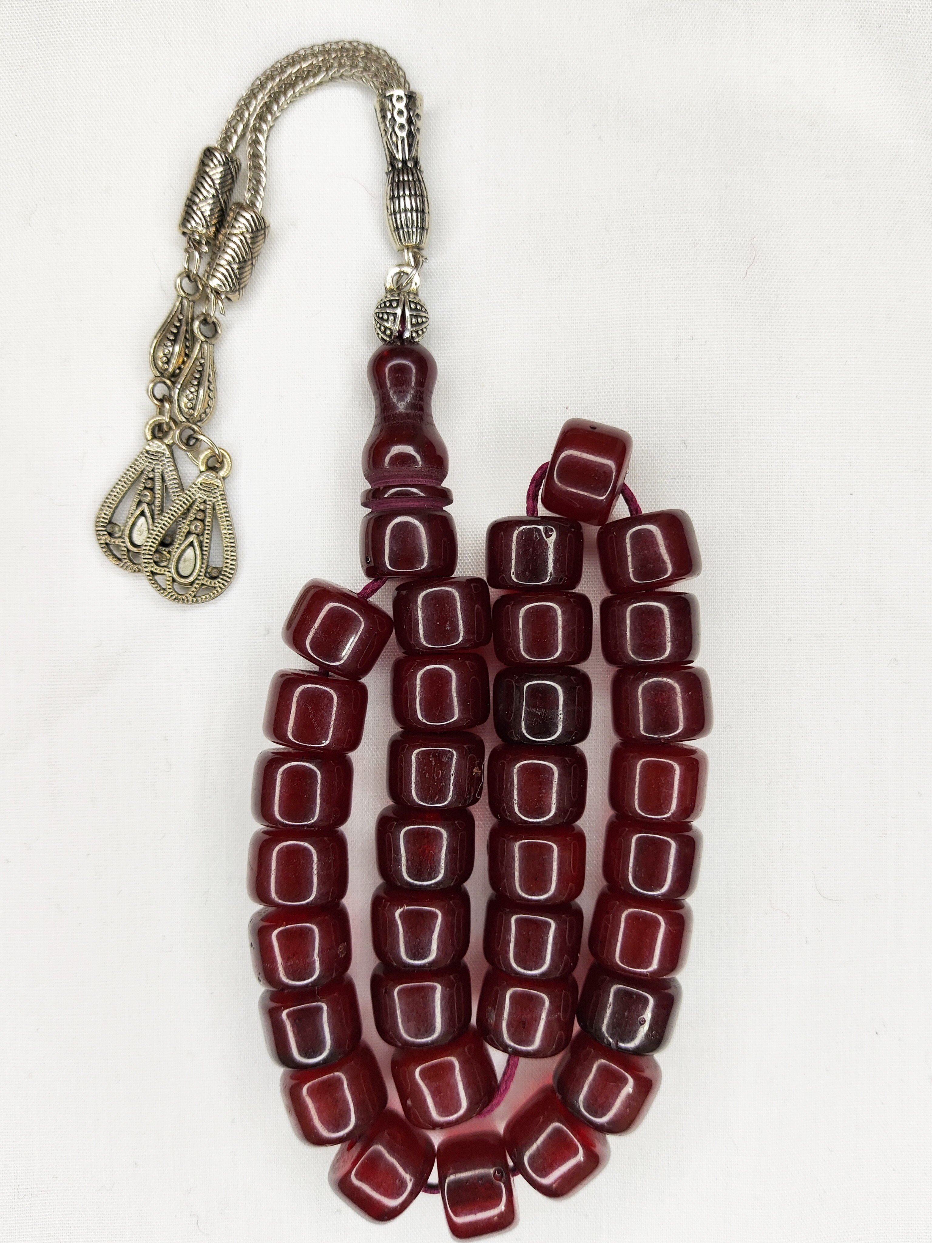 تسبیح سندلوس 33عددی تراش کسمه (قیچی بر) دقیق رنگ قرمز تیره زیبا همراه سرتسبیح استیل