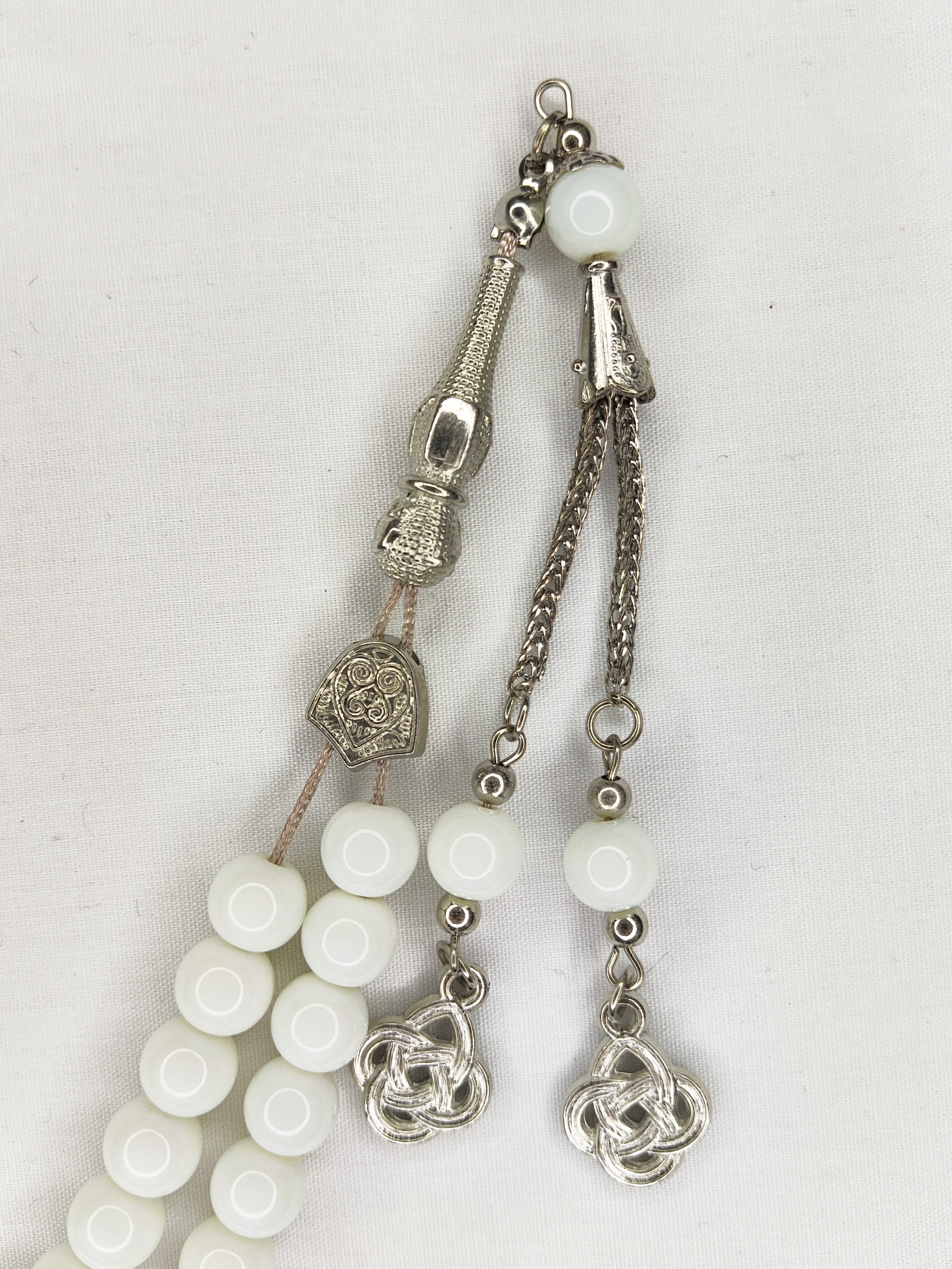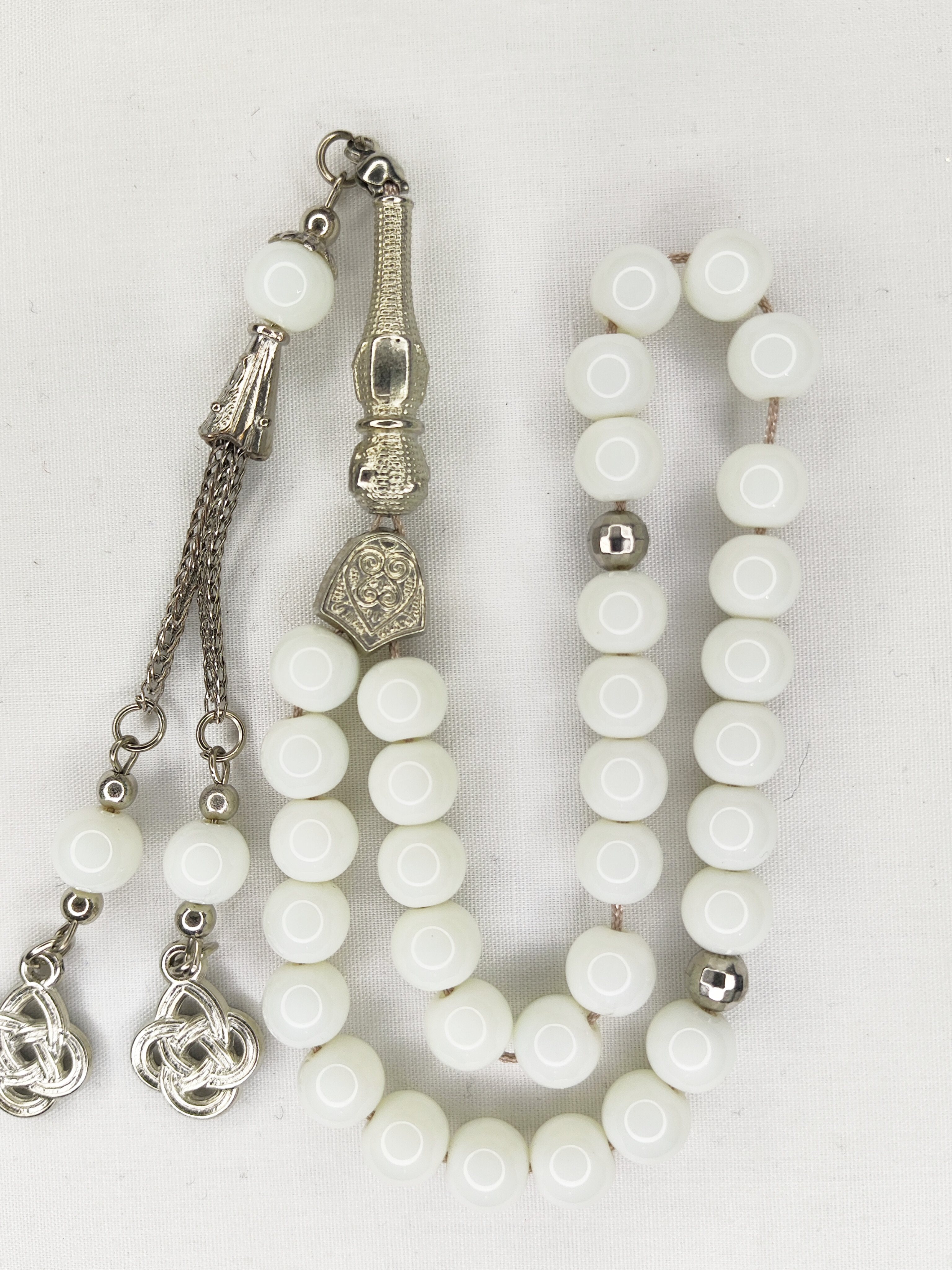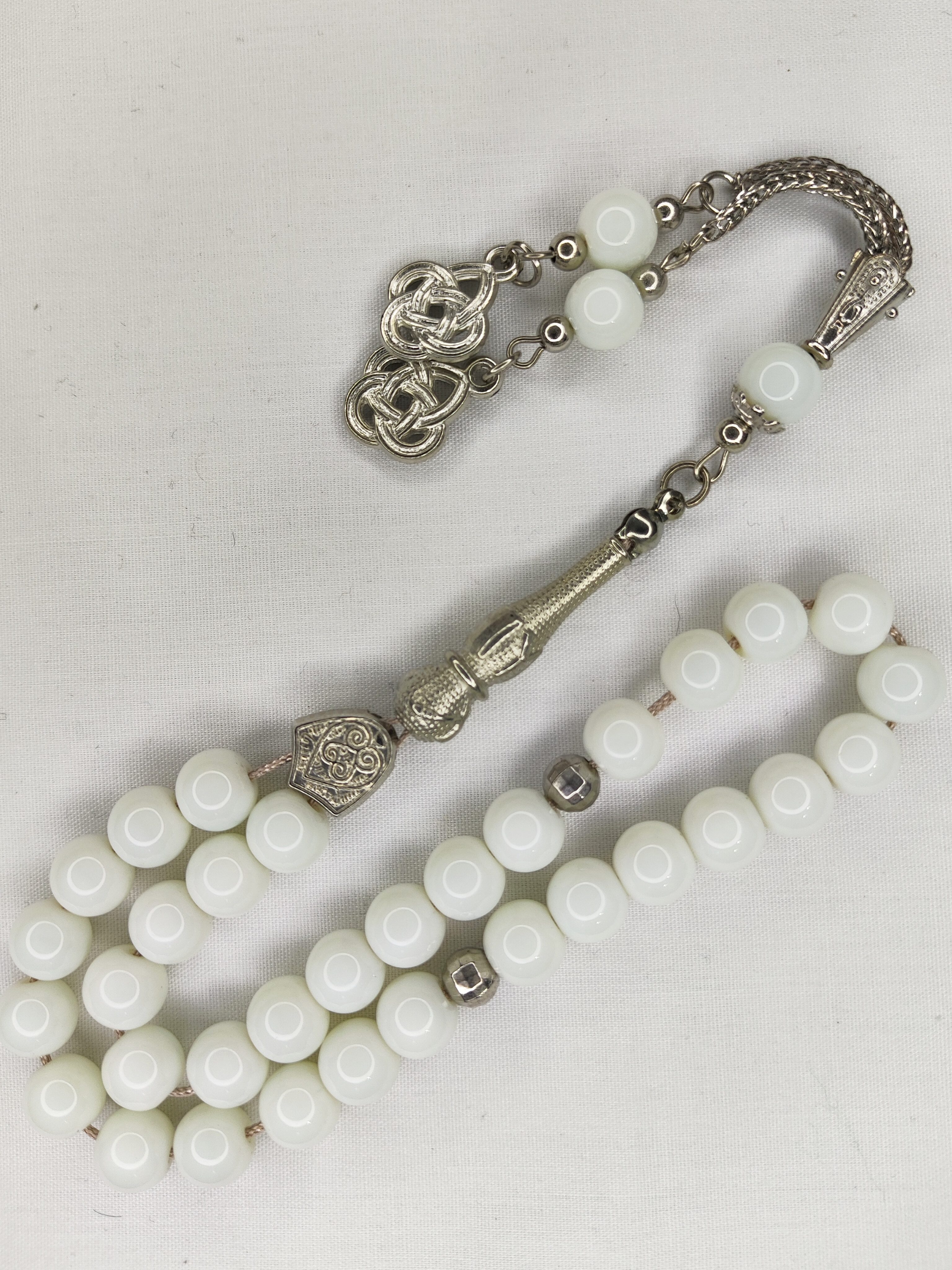 تسبیح شیشه‌ای 33عددی رنگ سفید شیری همراه سرتسبیح استیل شکیل قیمت مناسب