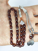 تسبیح شیشهای 33عددی قیمت مناسب رنگ قهوهای خوشدست و زیبا همراه سرتسبیح استیل شکیل