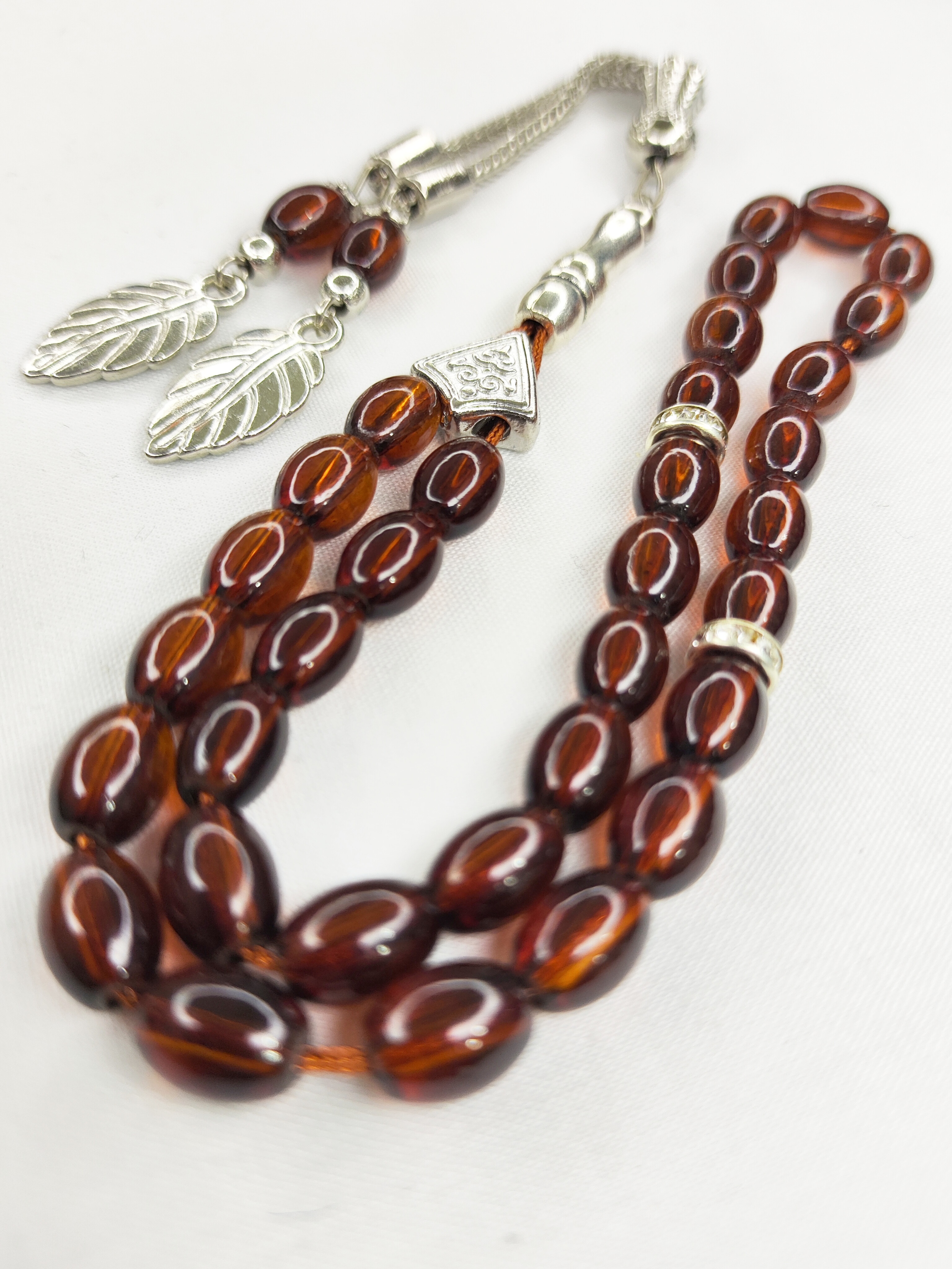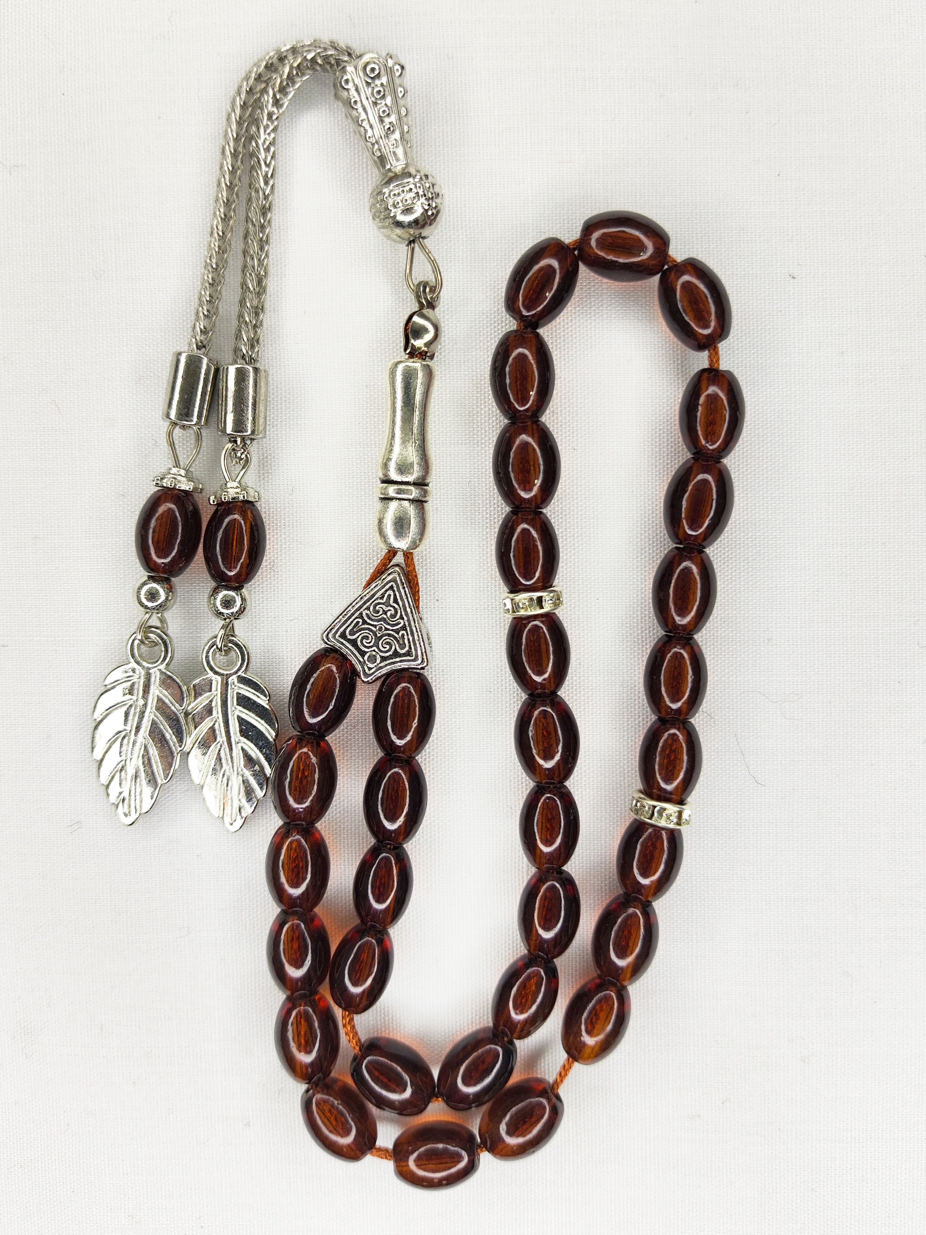 تسبیح شیشهای 33عددی قیمت مناسب رنگ قهوهای خوشدست و زیبا همراه سرتسبیح استیل شکیل