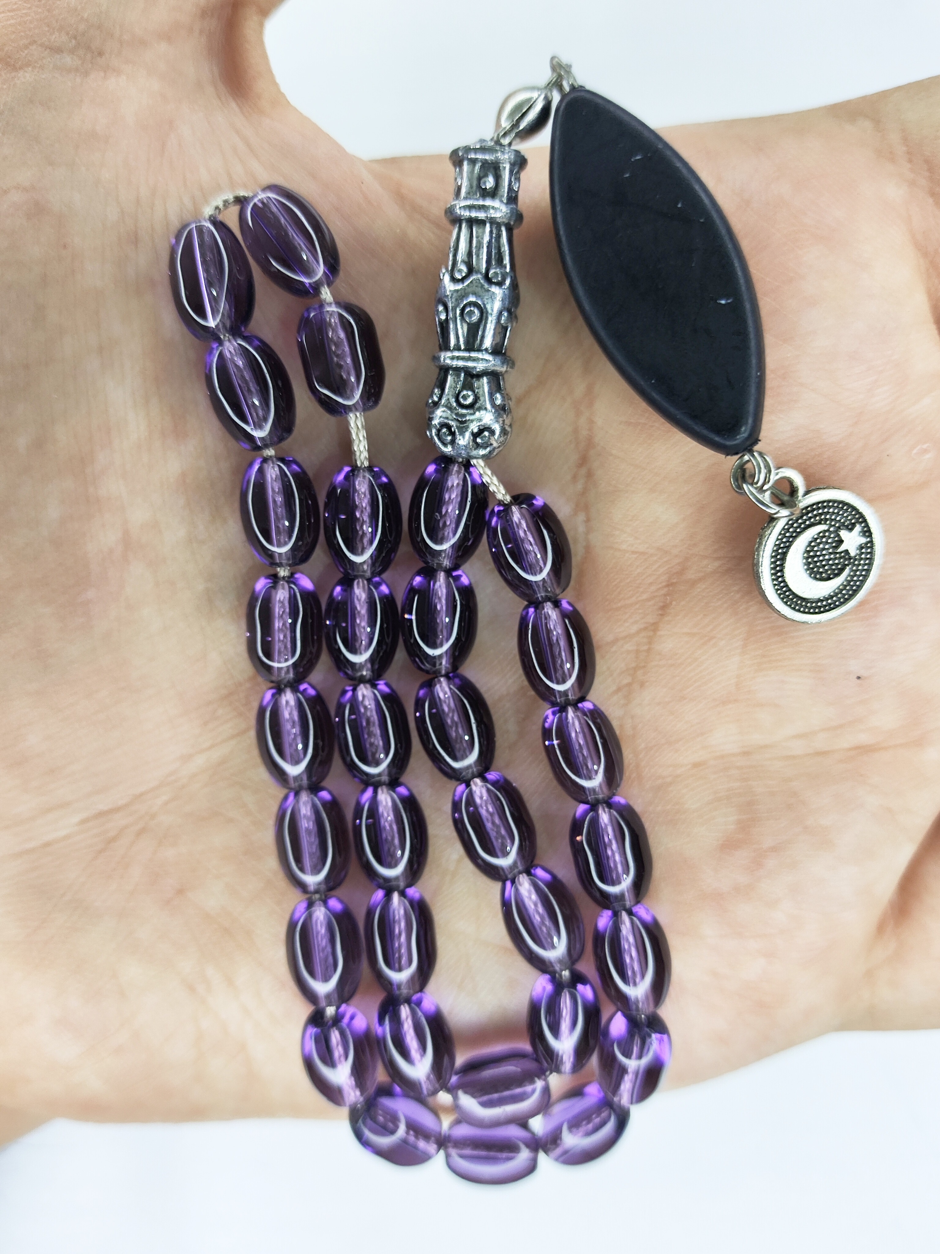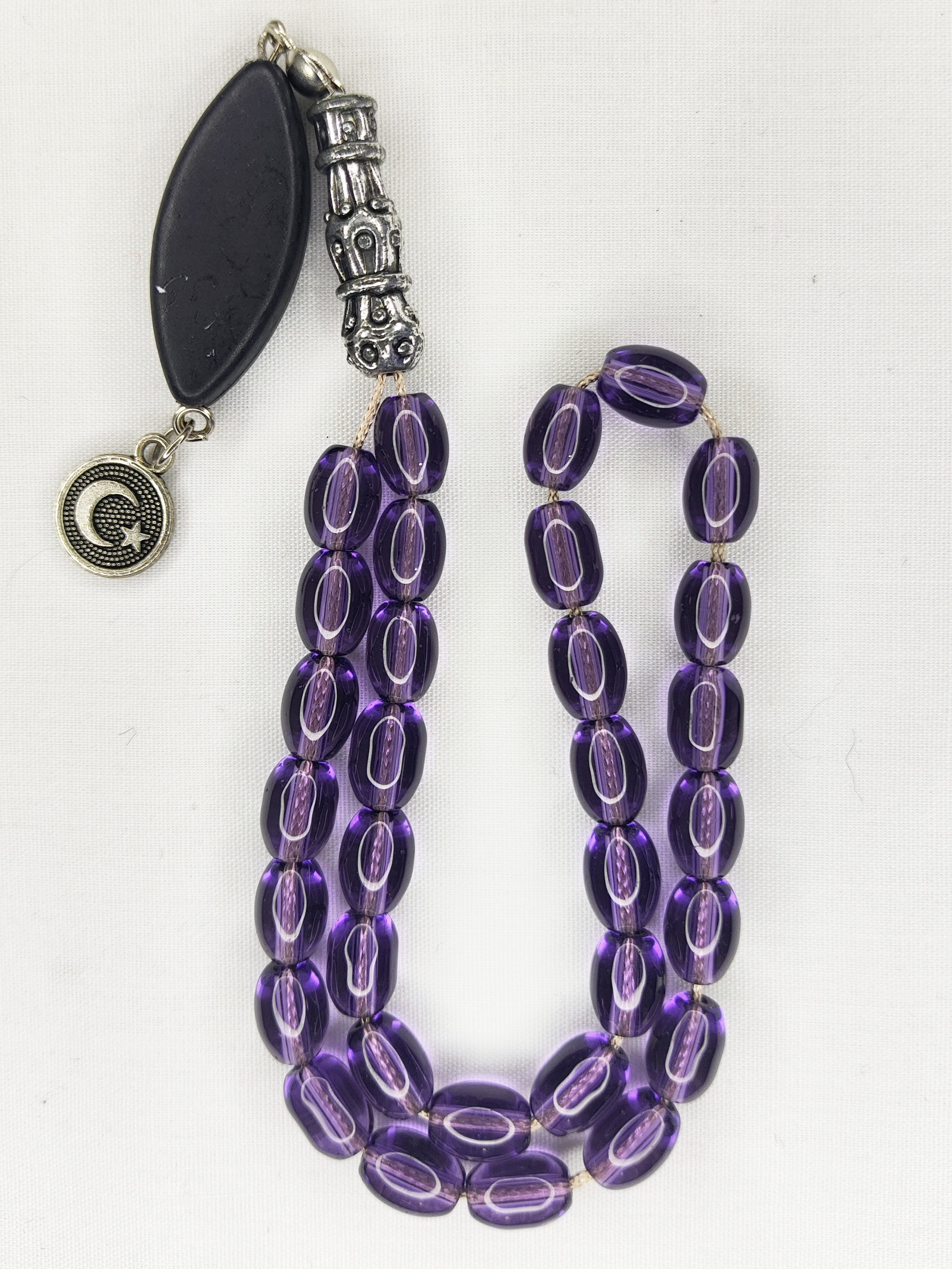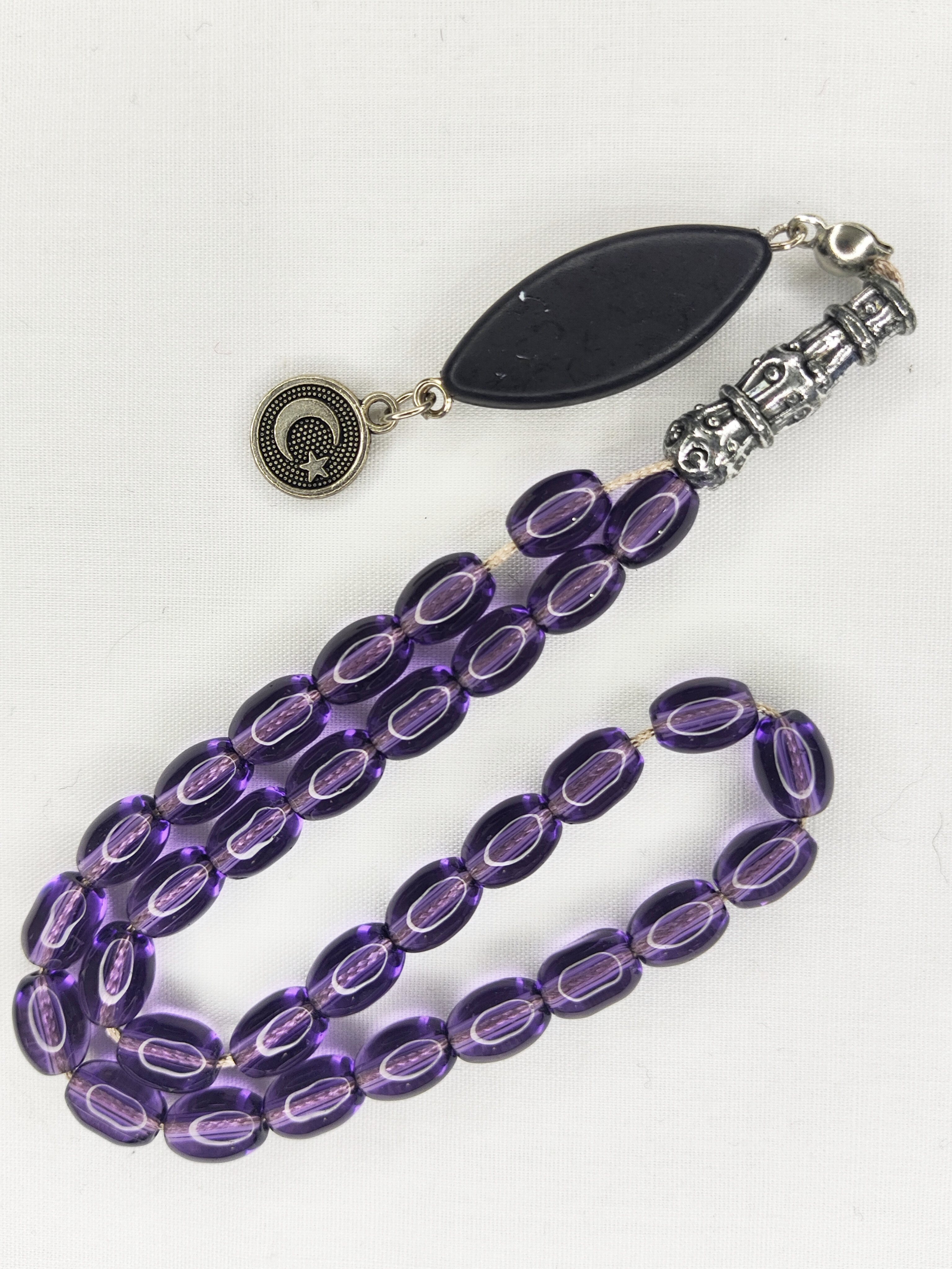 تسبیح شیشه‌ای 33عددی قیمت مناسب رنگ بنفش فاخر و شکیل و خوشدست