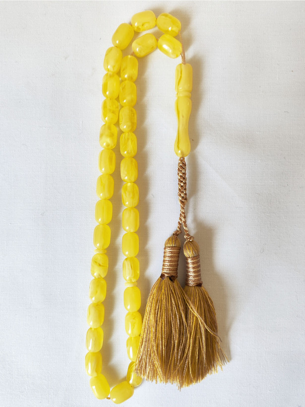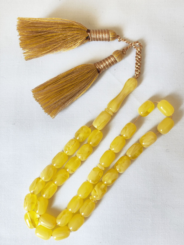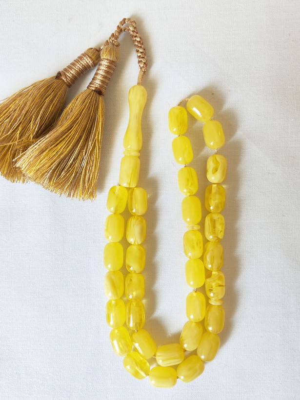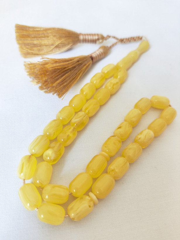 تسبیح کهربا رگه دار 33عددی تراش حبه ای قواره تاجری رنگ خاص زرد مایل به سفید فوق العاده خوشدست و زیبا همراه بافت و منگوله فاخر و شکیل تقدیمتون میشه 🌹