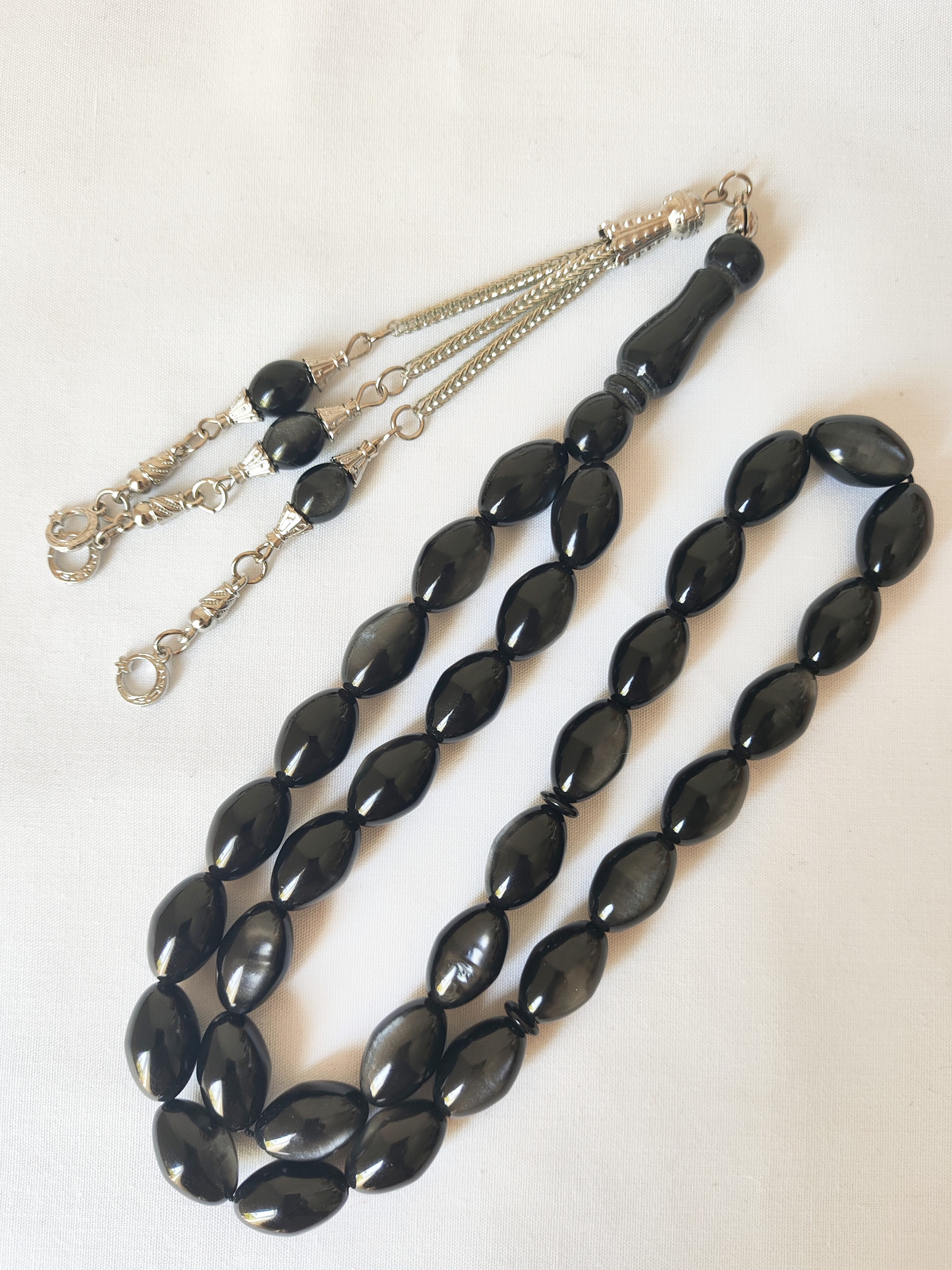 تسبیح کهربا زرافشان 33عددی رنگ سیاه خاص همراه سرتسبیح استیل شکیل