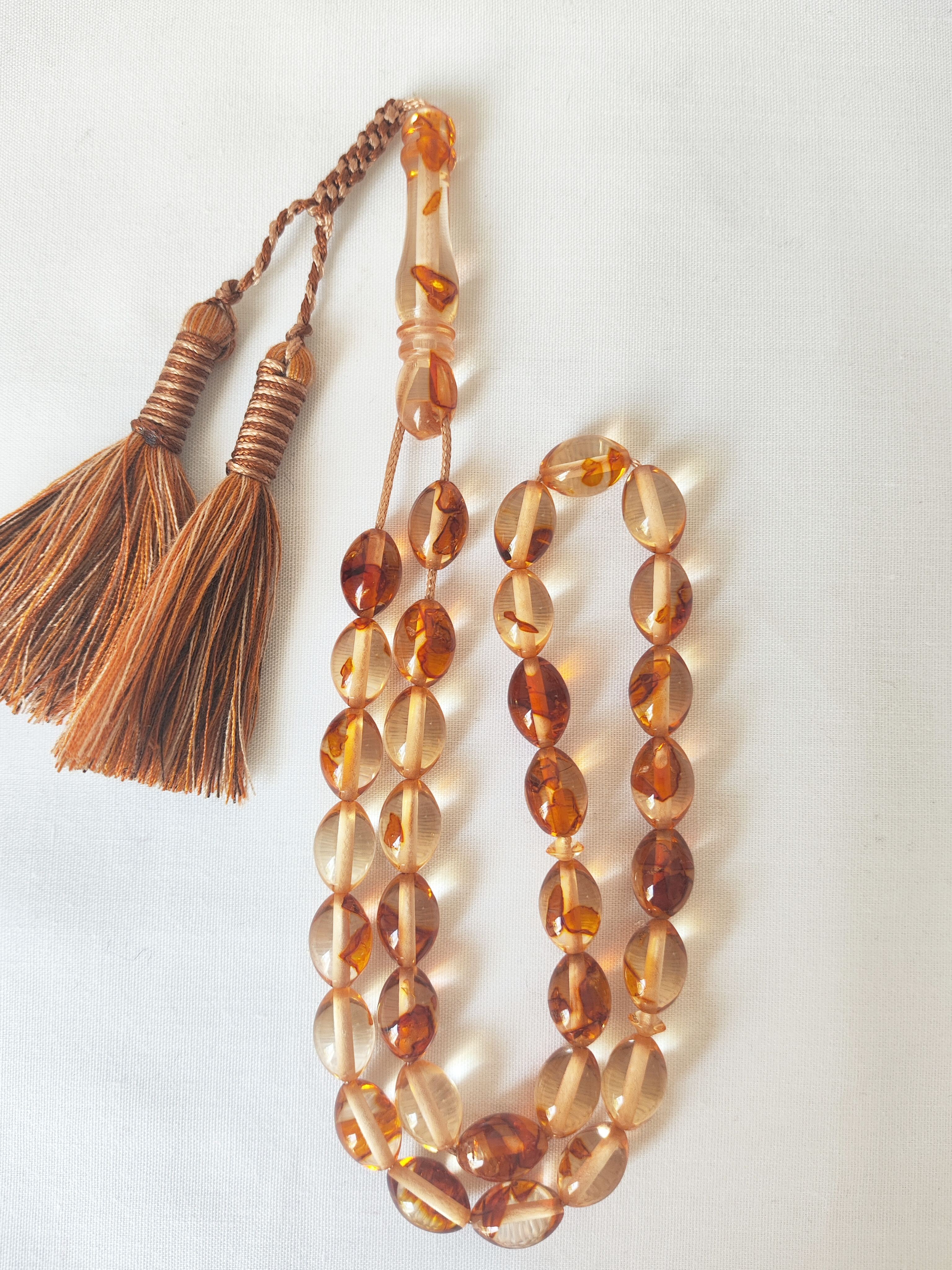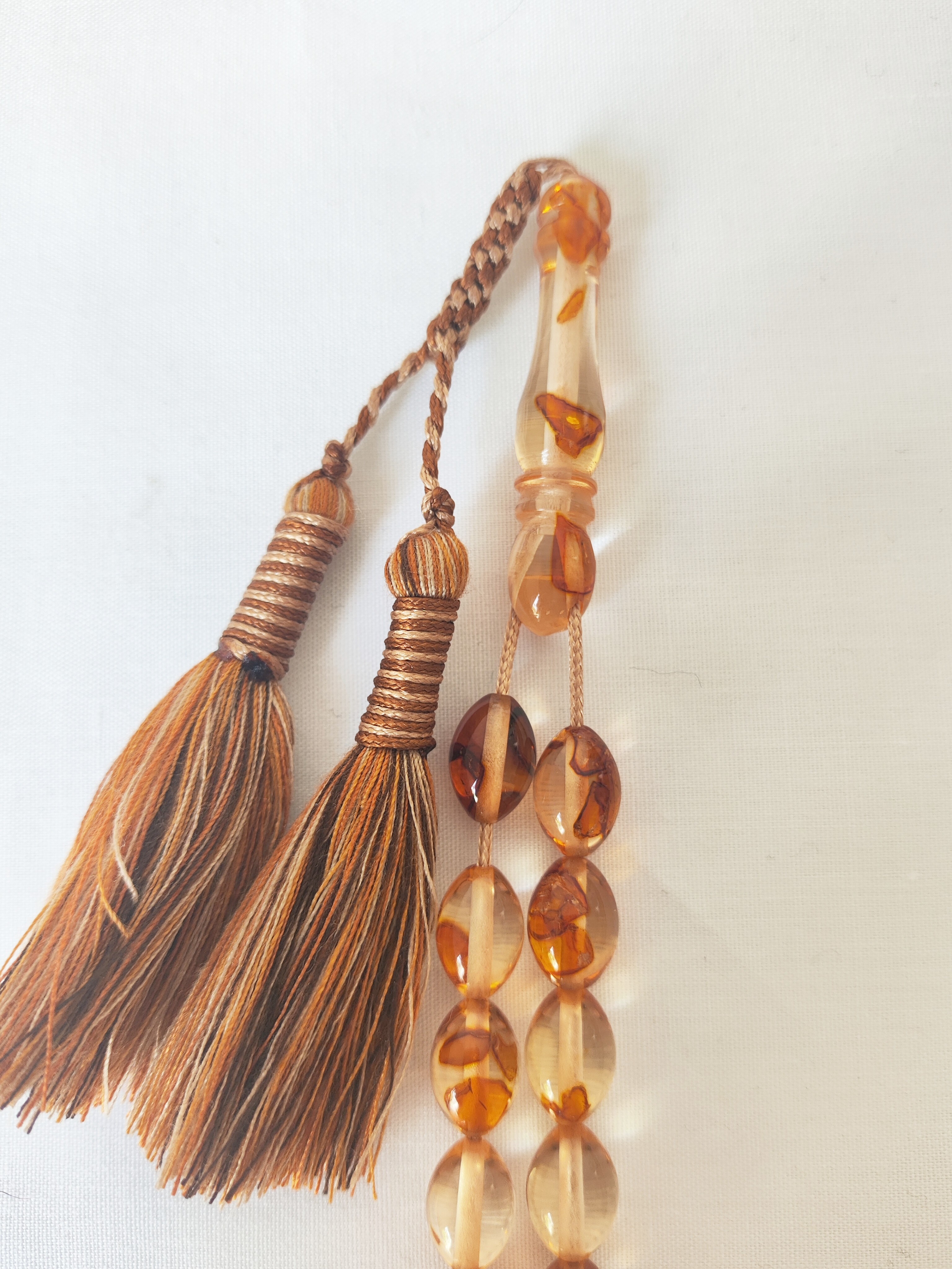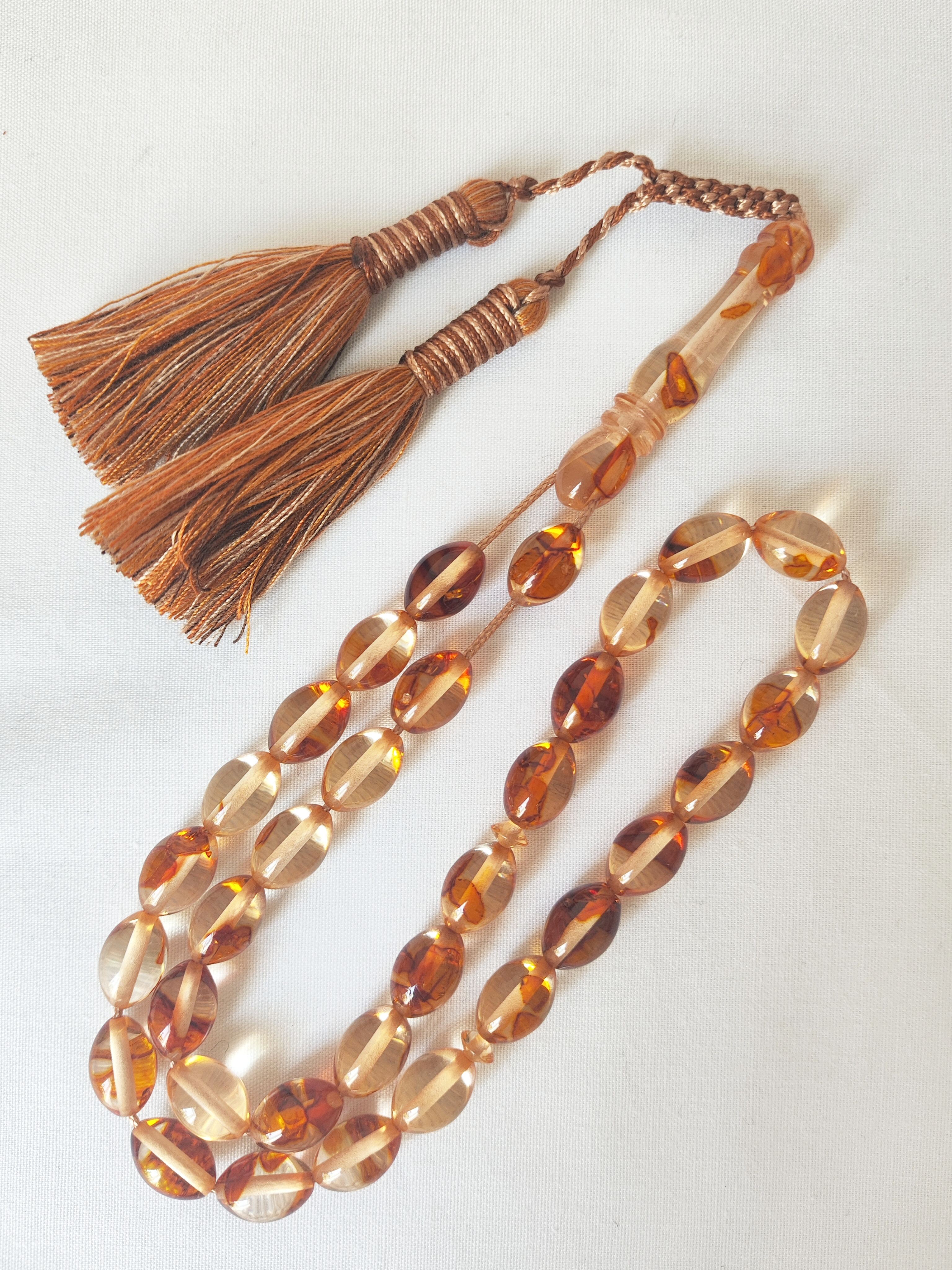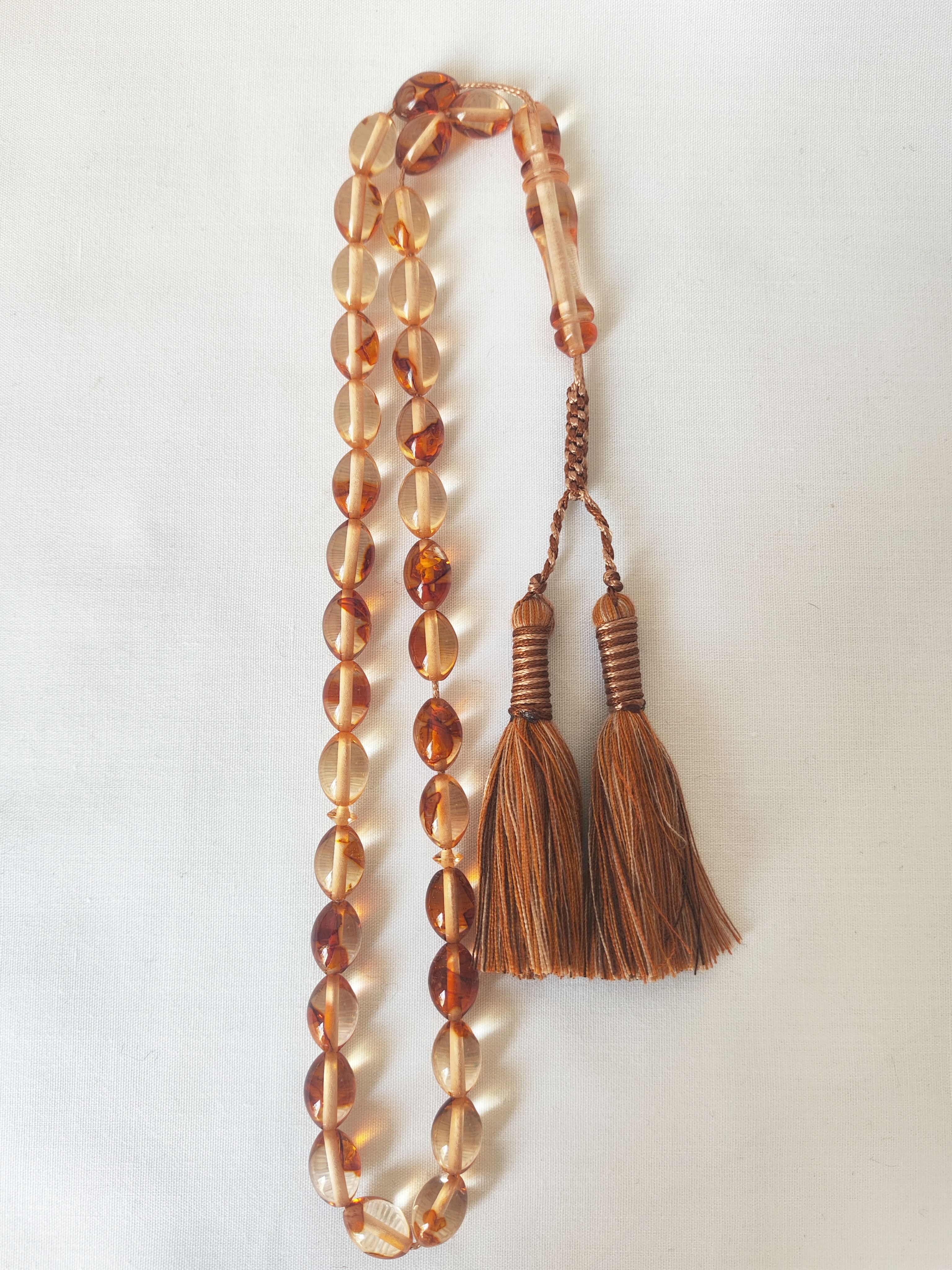 تسبیح کهربا خاص 33عددی تراش هلی خوشدست همراه بافت شکیل